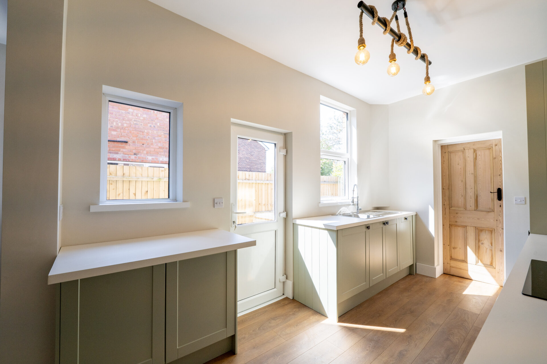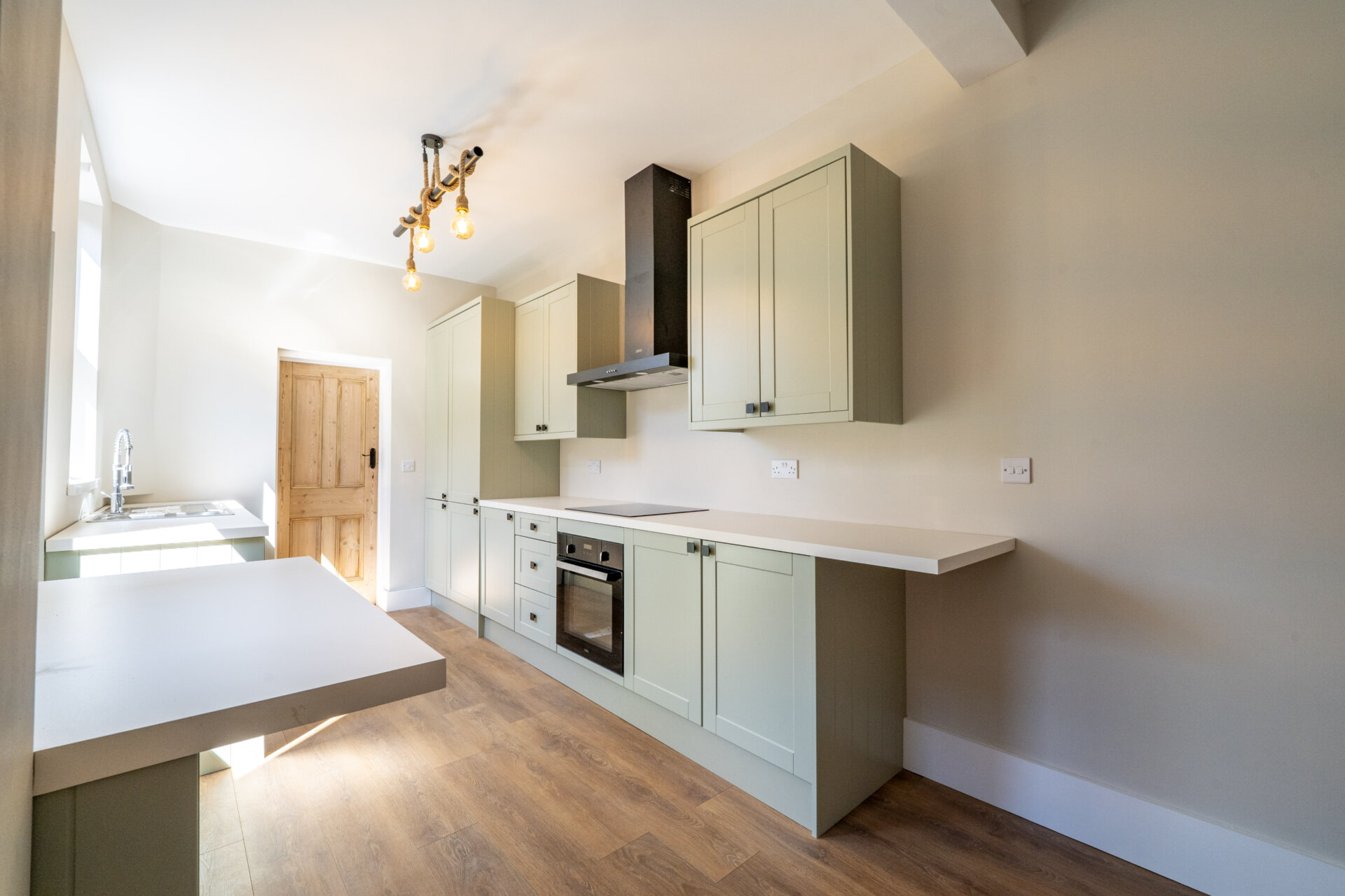 Green with black handles - wall, base and drawer units with work surface over, stainless steel sink and drainer unit with Swan mixer tap over, built-in fridge/freezer, dishwasher, oven, induction hob and extractor hood over. x2 UPVC double glazed windows to the rear with rear exit door, laminate floor and door to