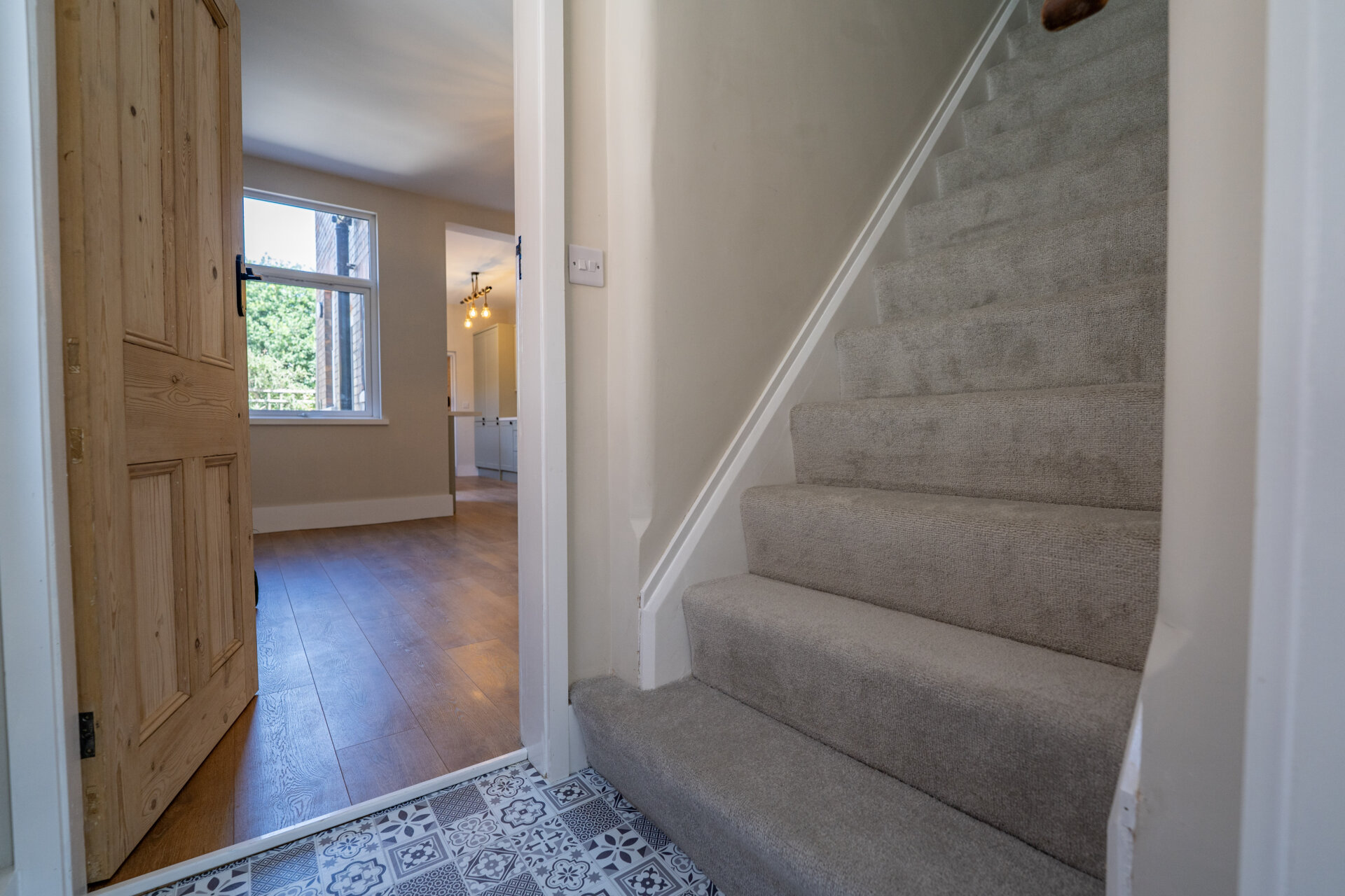 Stairs to the first floor landing, UPVC front entrance door and doors to