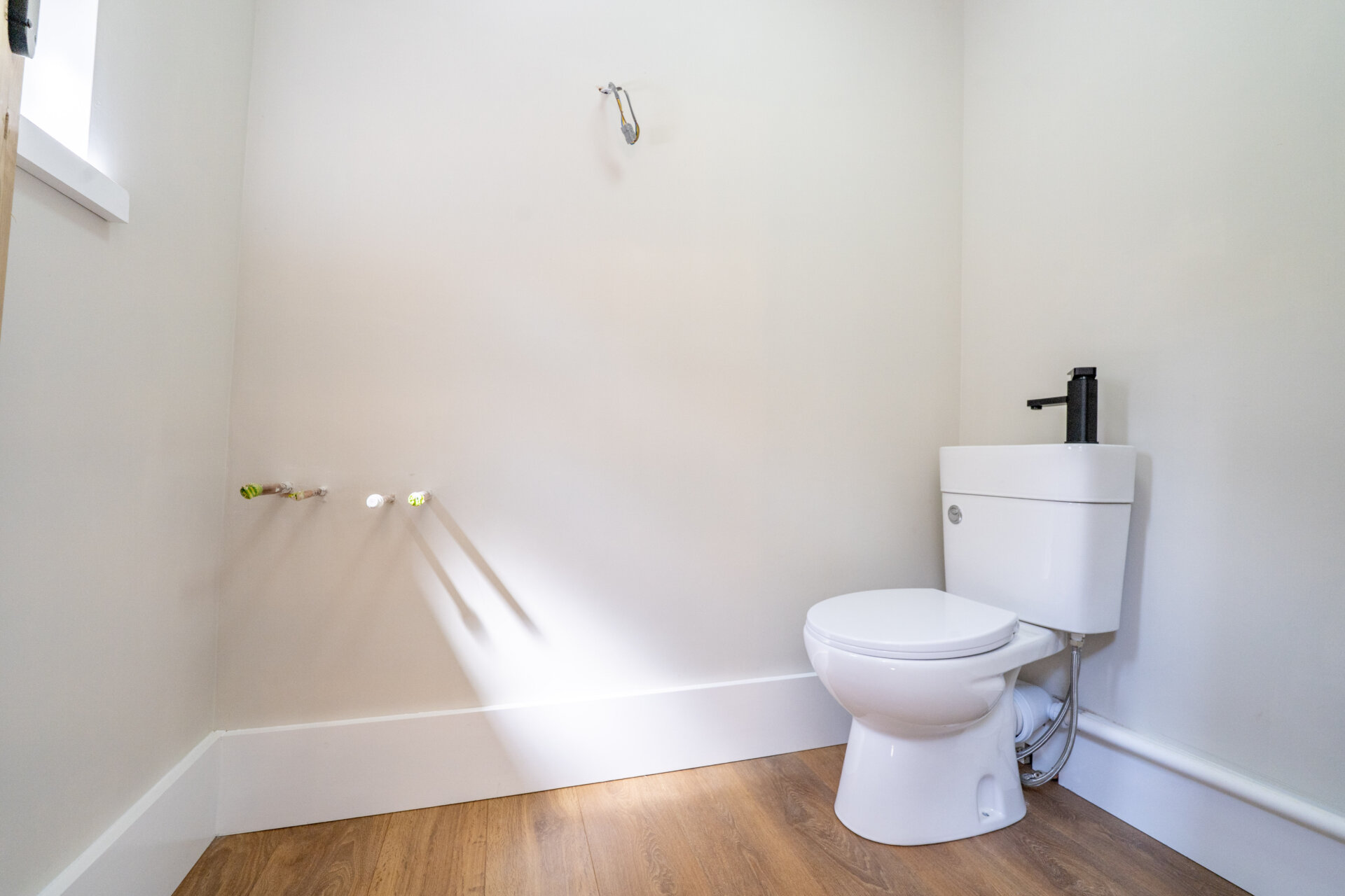 Low flush w.c, with sink, plumbing for automatic washing machine, gas central heating boiler, UPVC double glazed window.