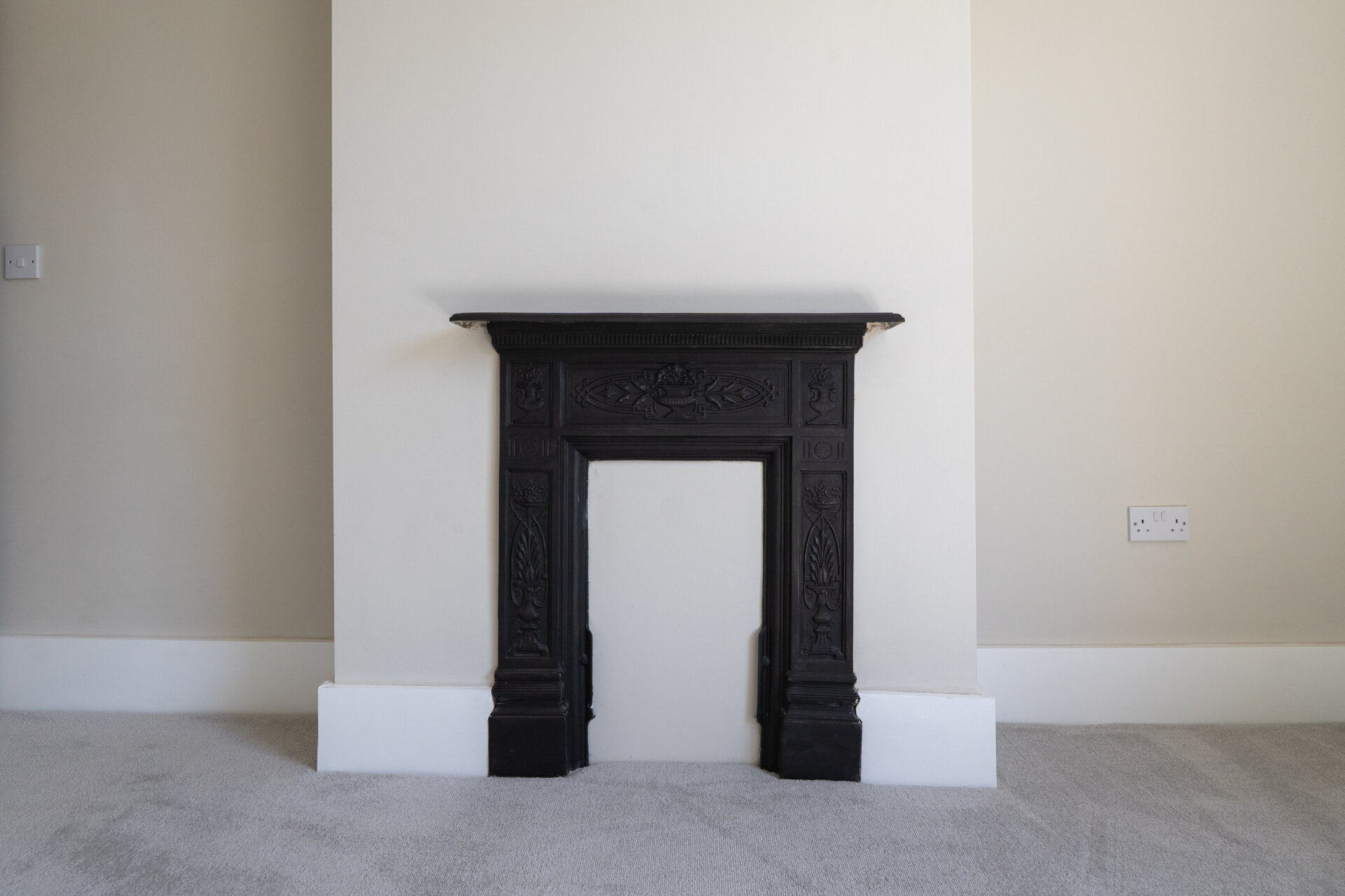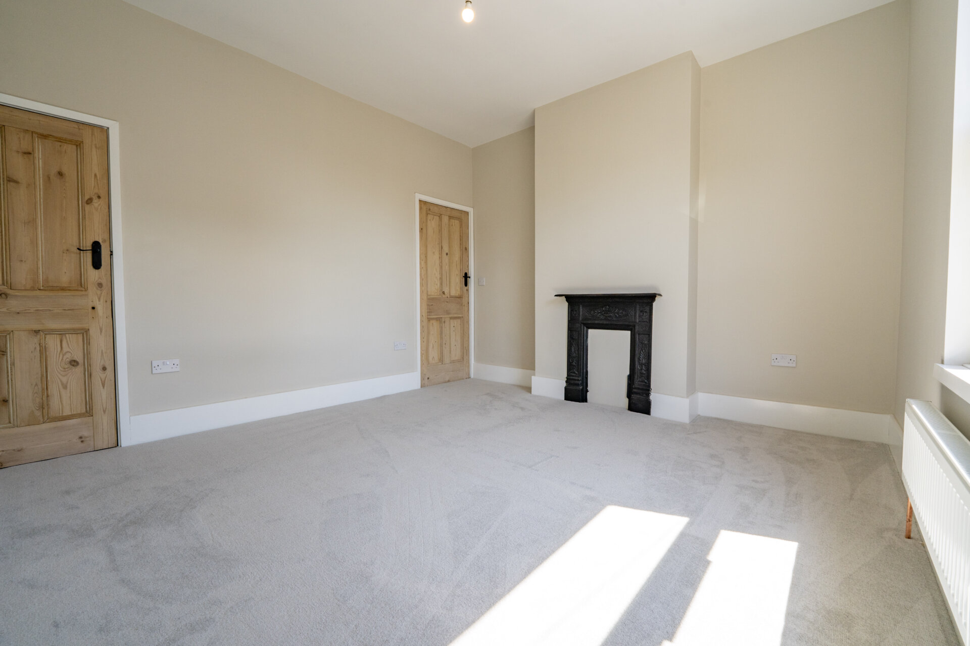 UPVC double glazed window to the front, original cast iron fireplace with tiled hearth, door to the over stairs storage cupboard, radiator.