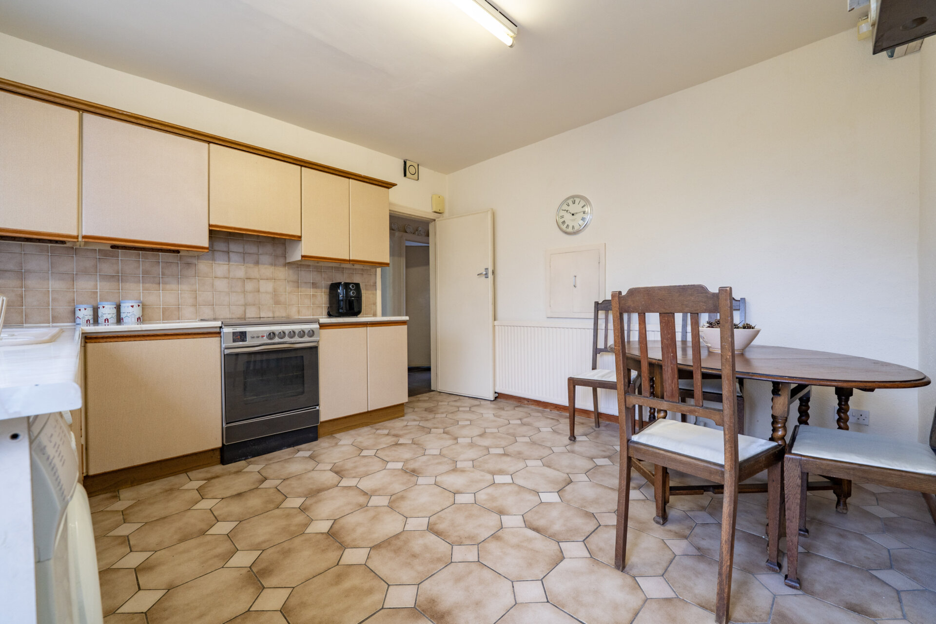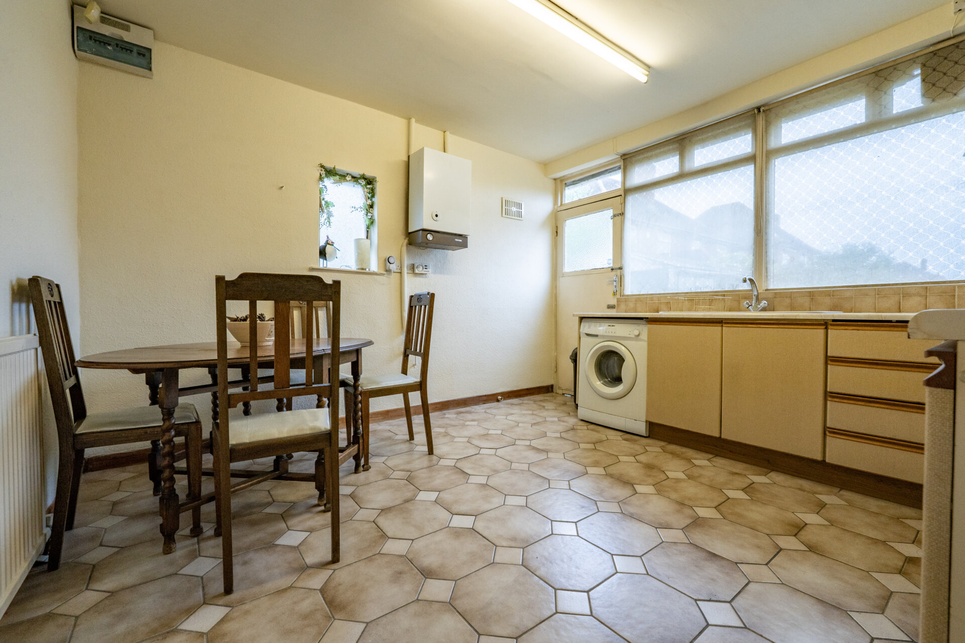 Wall, base and drawer units with work surface over, inset sink/waste/drainer unit with mixer tap over, tiled walls and splashbacks, radiator, gas central heating boiler, cooker space, appliance space, plumbing for automatic washing machine, window x3, rear exit door, space for table and chairs.