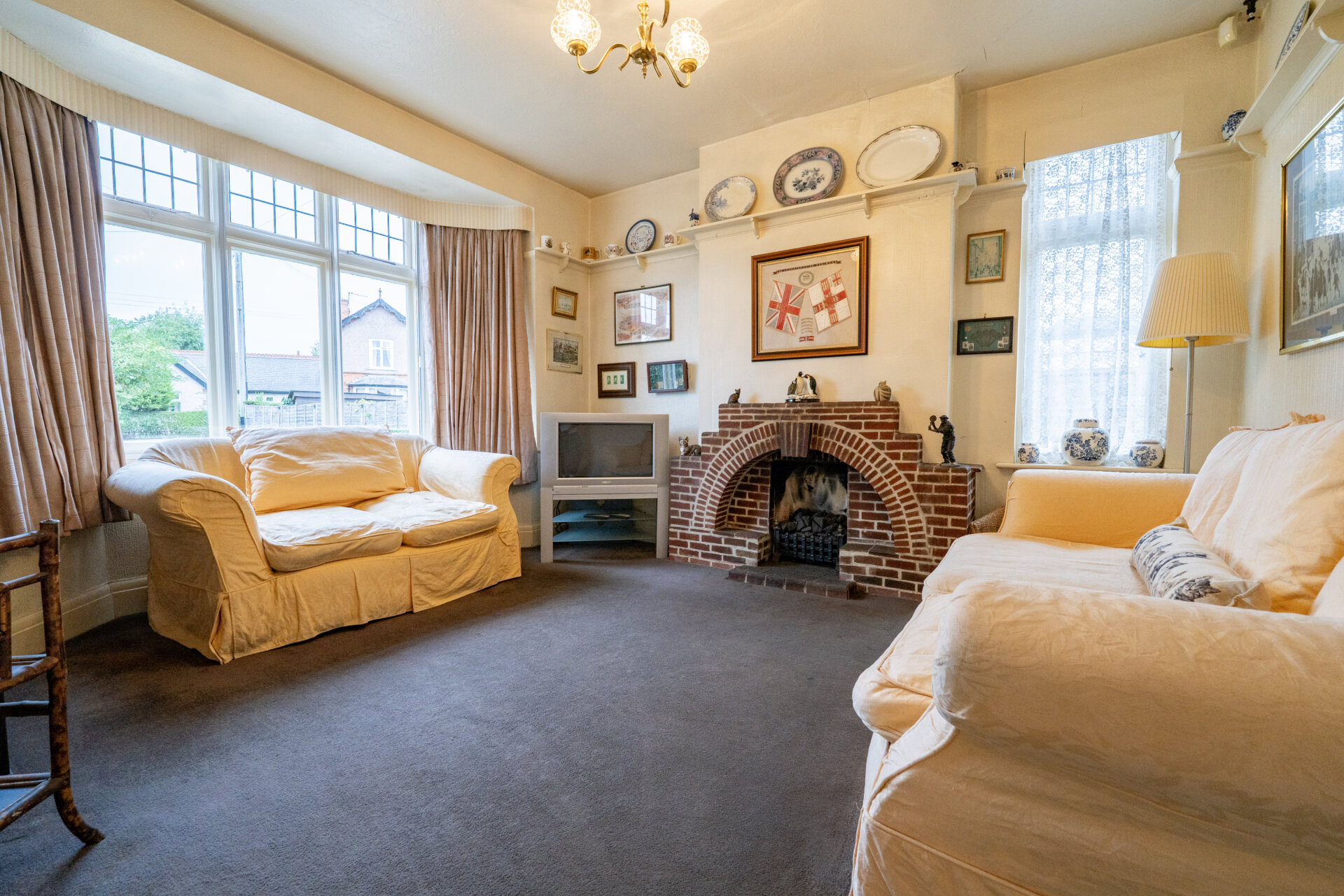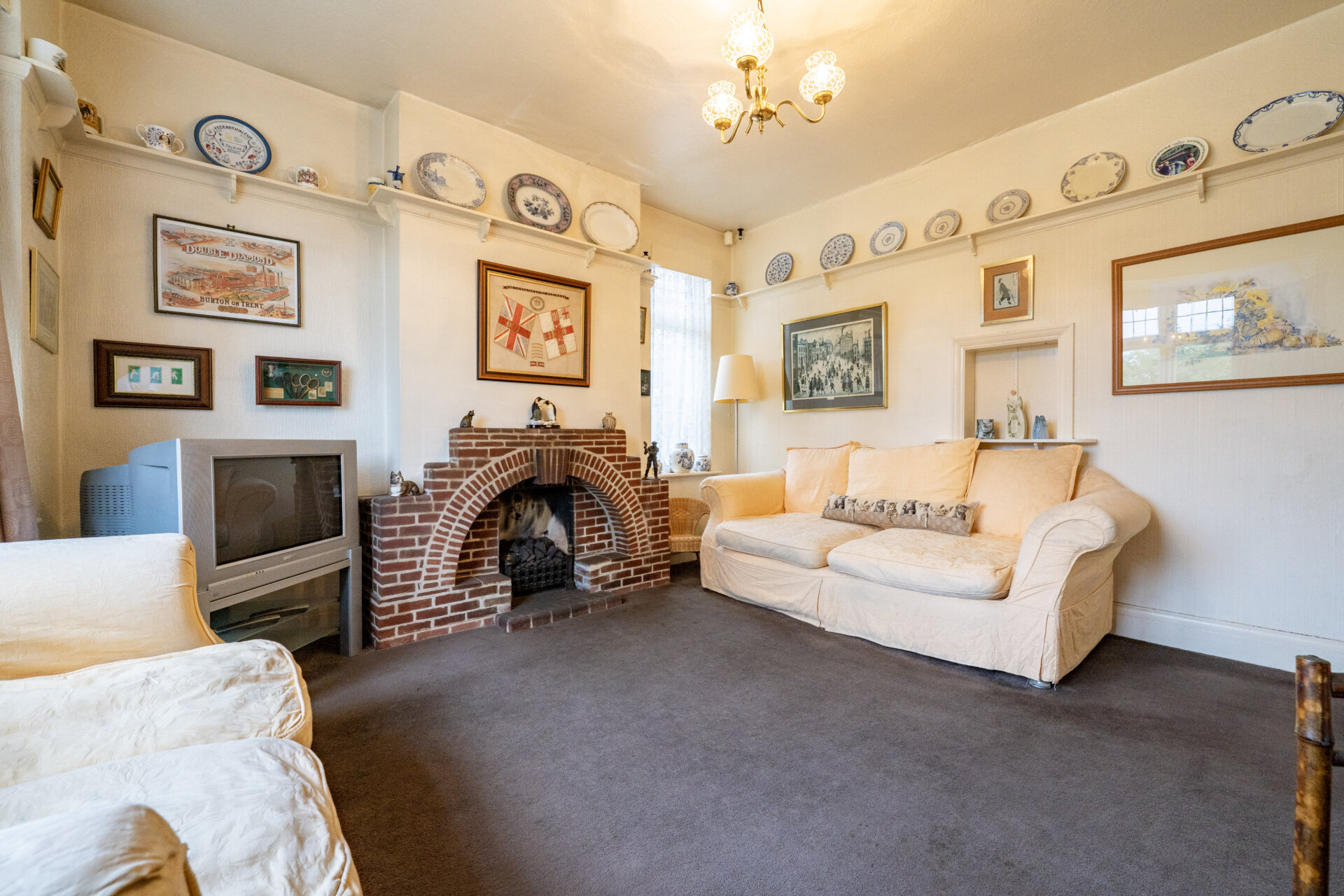 UPVC double glazed window to the front and double glazed window to the side, flame effect gas fire with brick surround, plate rack, radiator, hatch to the kitchen.