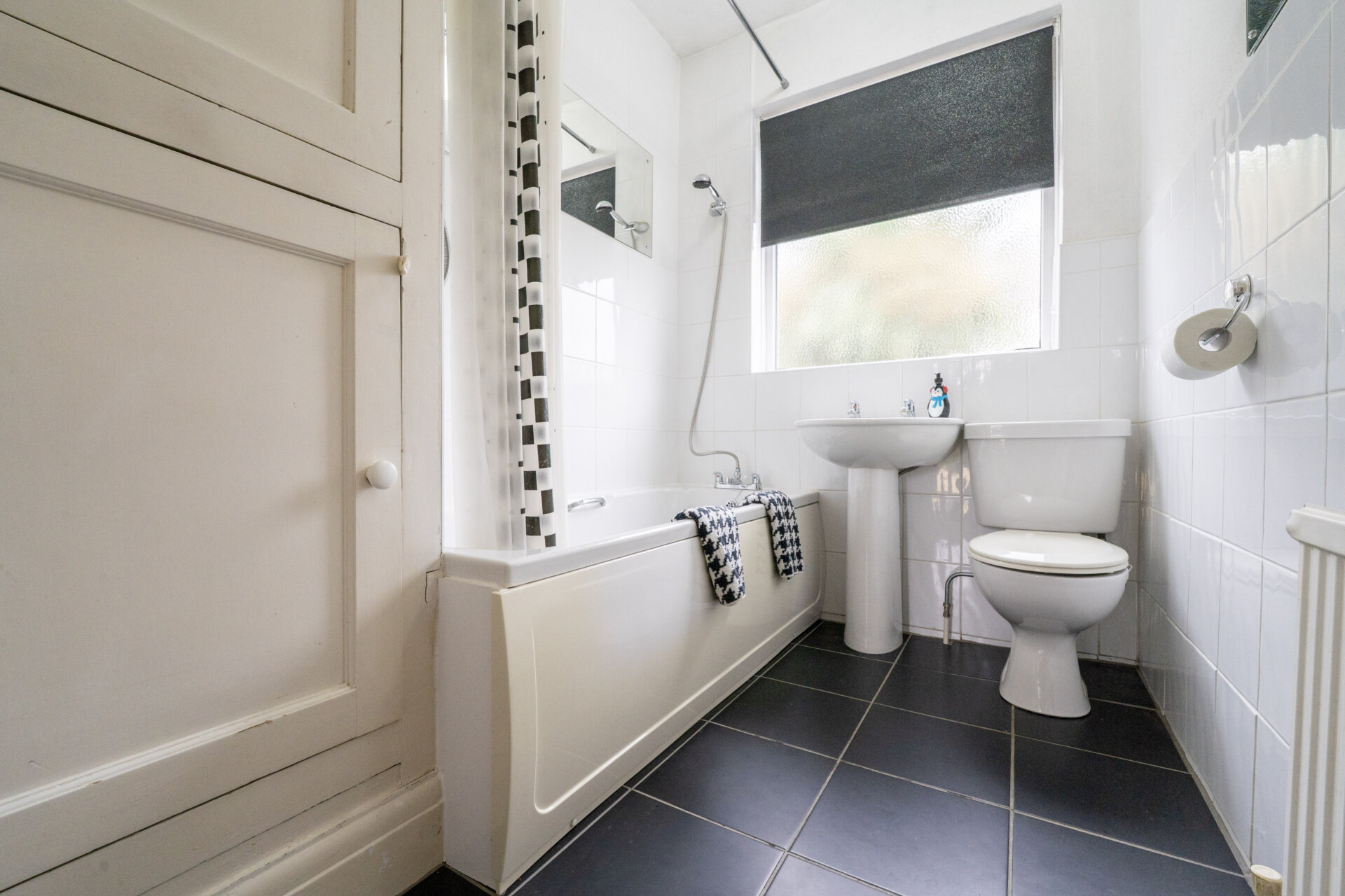 Panelled bath with mixer tap and electric shower over, low flush w.c, pedestal wash hand basin, tiled walls and splashbacks, tiled floor, waiting cupboard and UPVC double glazed window.