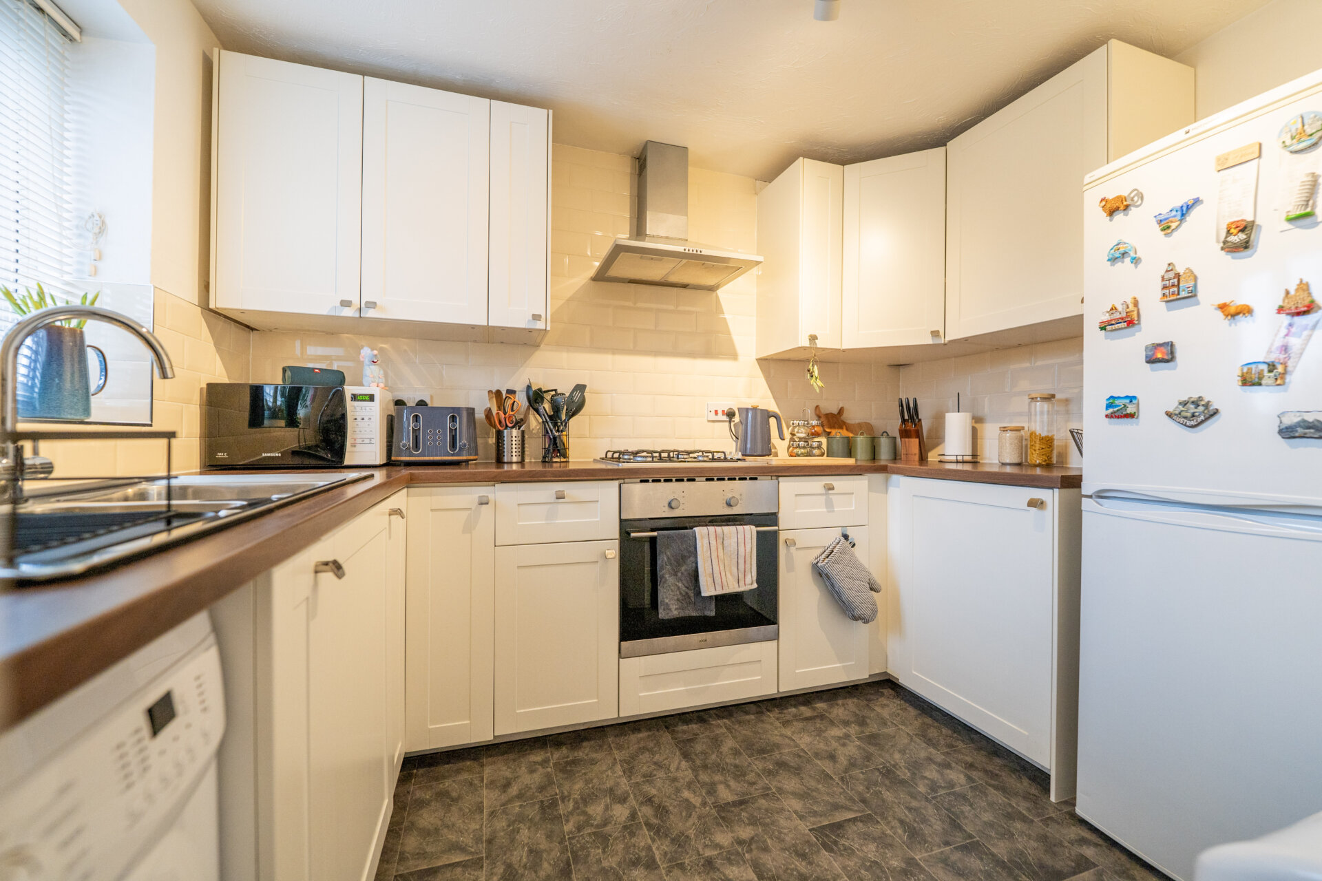 Wall base and drawer units with work surface over, sink/waste/drainer unit with Swan mixer tap over, tiled walls and splashbacks, plumbing for automatic washing machine, appliance space, built-in oven, gas hob and extractor hood over, radiator, UPVC double glazed window to the front.
