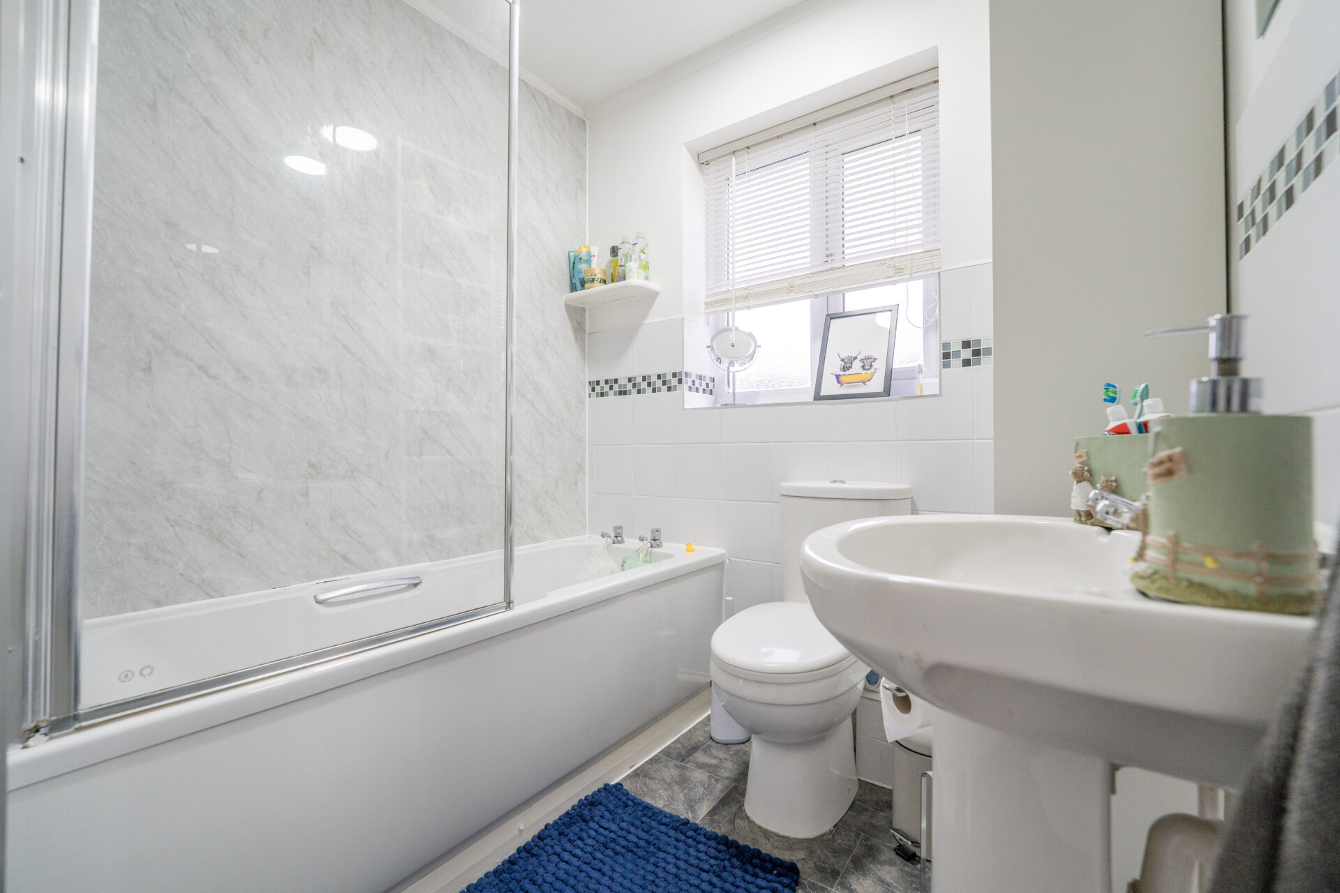 Panelled bath with electric shower over, low flush w.c, pedestal wash hand basin, tiled walls and splashbacks, radiator, UPVC double glazed window.