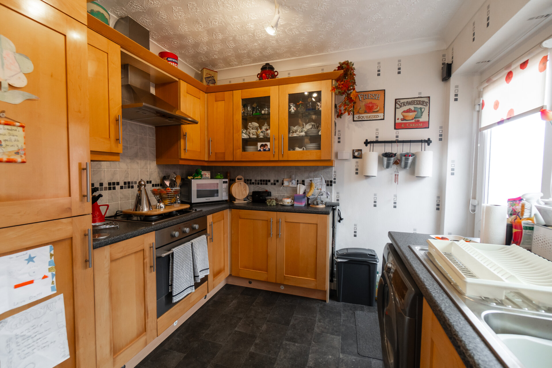 Wall, base and drawer units with work surface over, stainless steel sink and drainer unit with mixer tap over, tiled walls and splash backs, built-in fridge/freezer, oven, gas hob and extractor hood over, plumbing for automatic washing machine, radiator, UPVC double glazed window and rear exit door, coving to the ceiling.