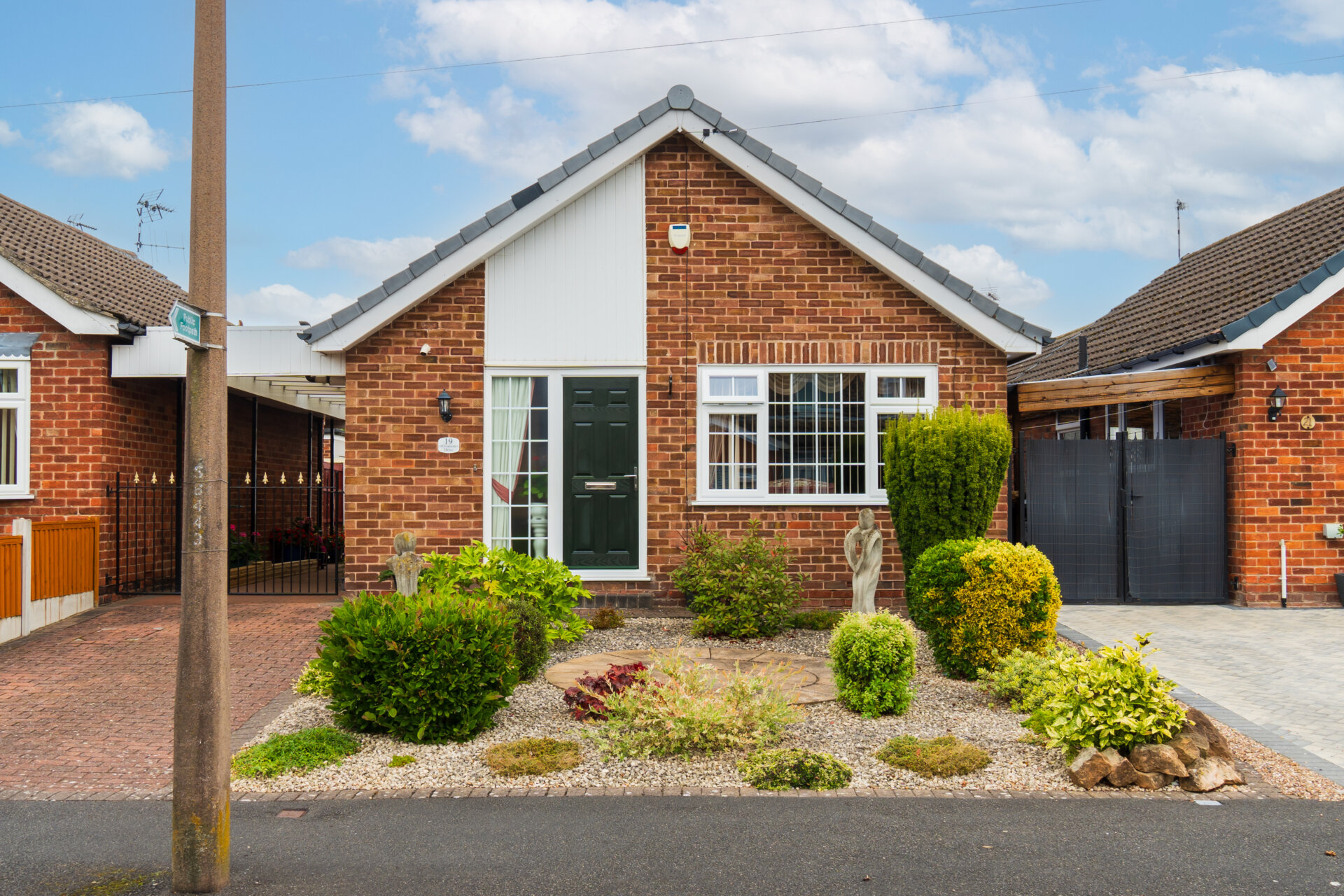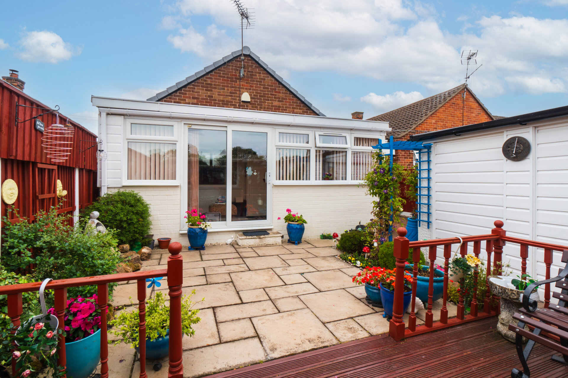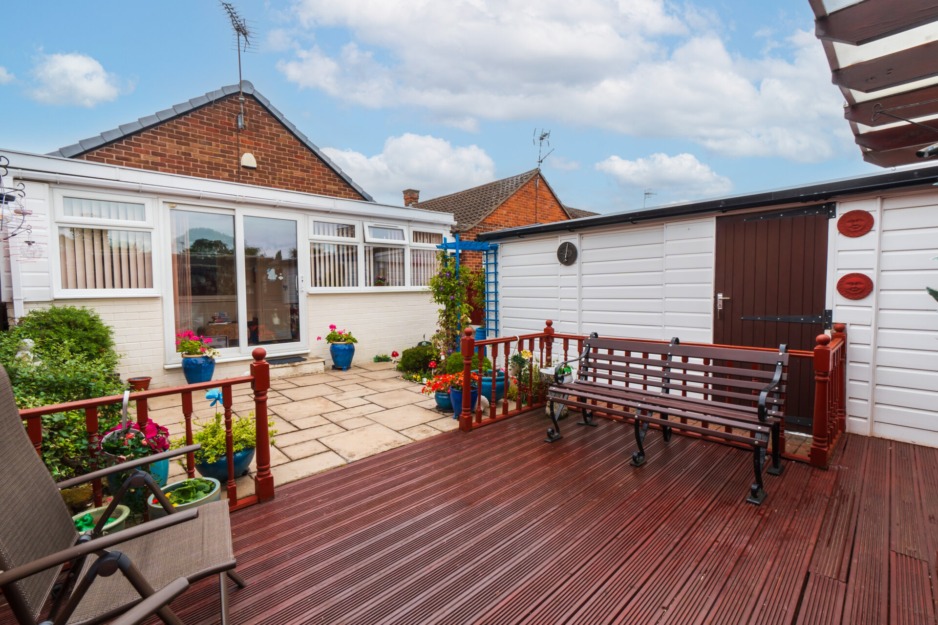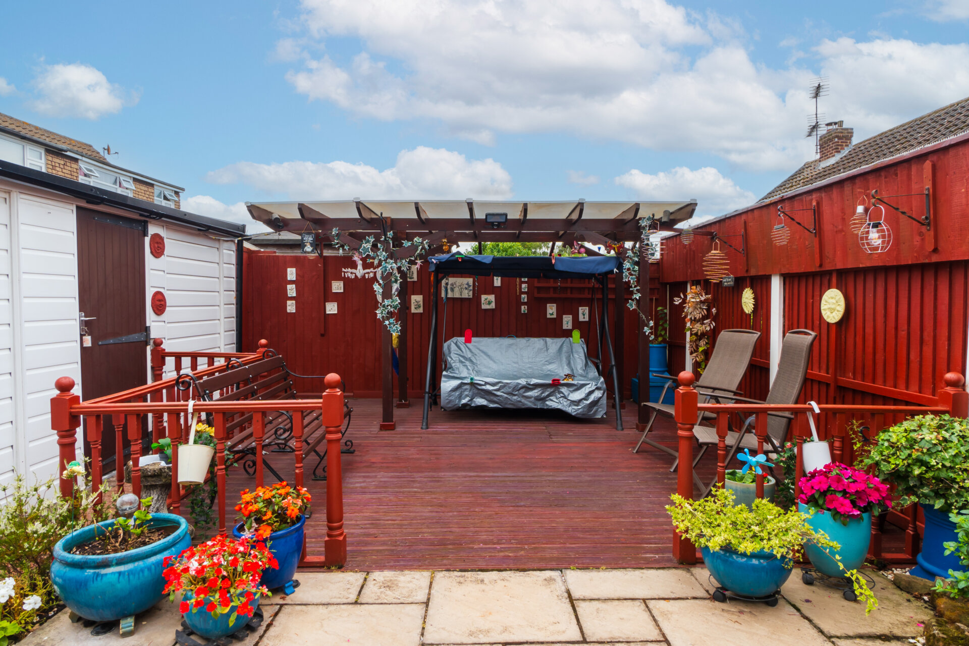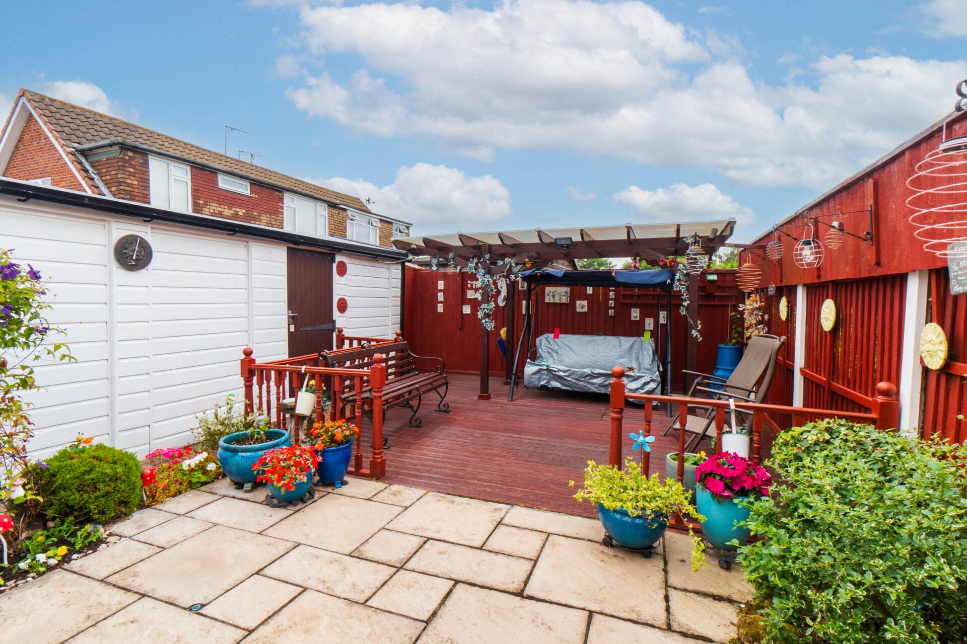 Moving outside, the property continues to impress with thoughtfully designed outdoor spaces perfect for both relaxing and entertaining. A block paved driveway and a gravel area lead to a circular patio adorned with mature shrubs, providing low-maintenance charm to the front of the home. Double wrought iron gates open to reveal a car port and access to the garage and rear garden. The rear garden has a spacious patio, a large decking area complete with a pergola, and borders bursting with colourful flowers and mature shrubs. Privacy is assured with fenced boundaries, making this outdoor space ideal for enjoying the fresh air in peace. Additional features include an outside tap for added convenience and a well-maintained room within the garage boasting shelving, light, and power.