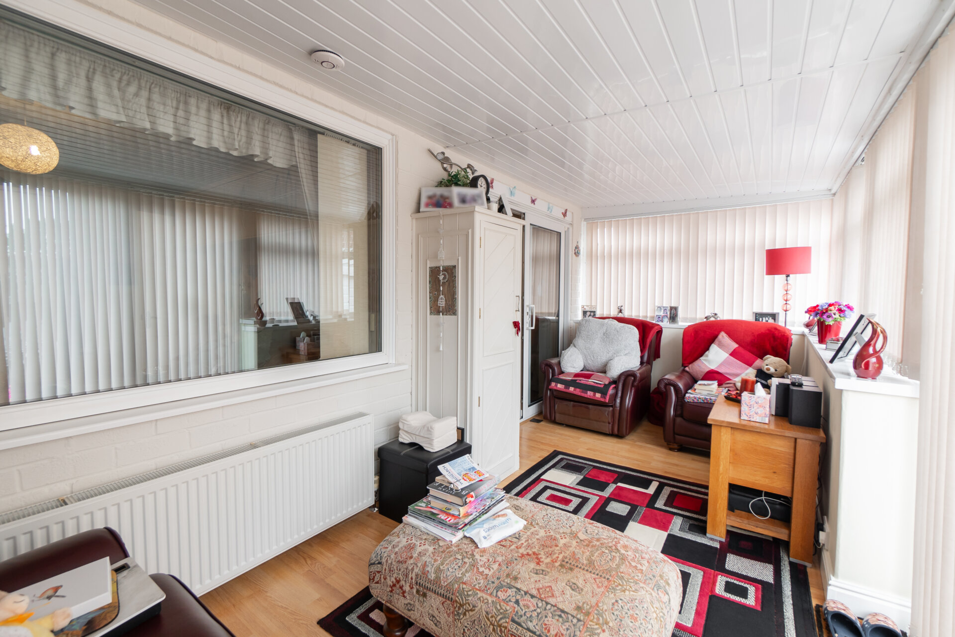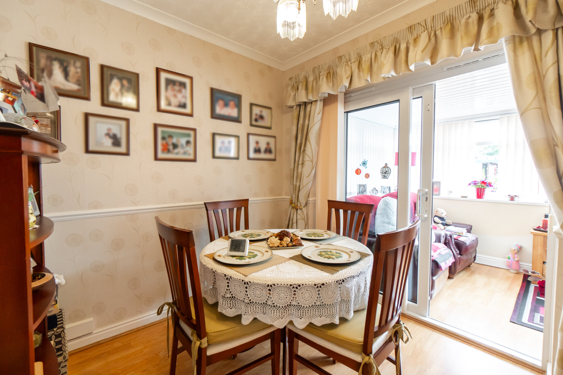 Laminate floor, radiator, coving to the ceiling, dado rail and UPVC sliding doors to the conservatory
