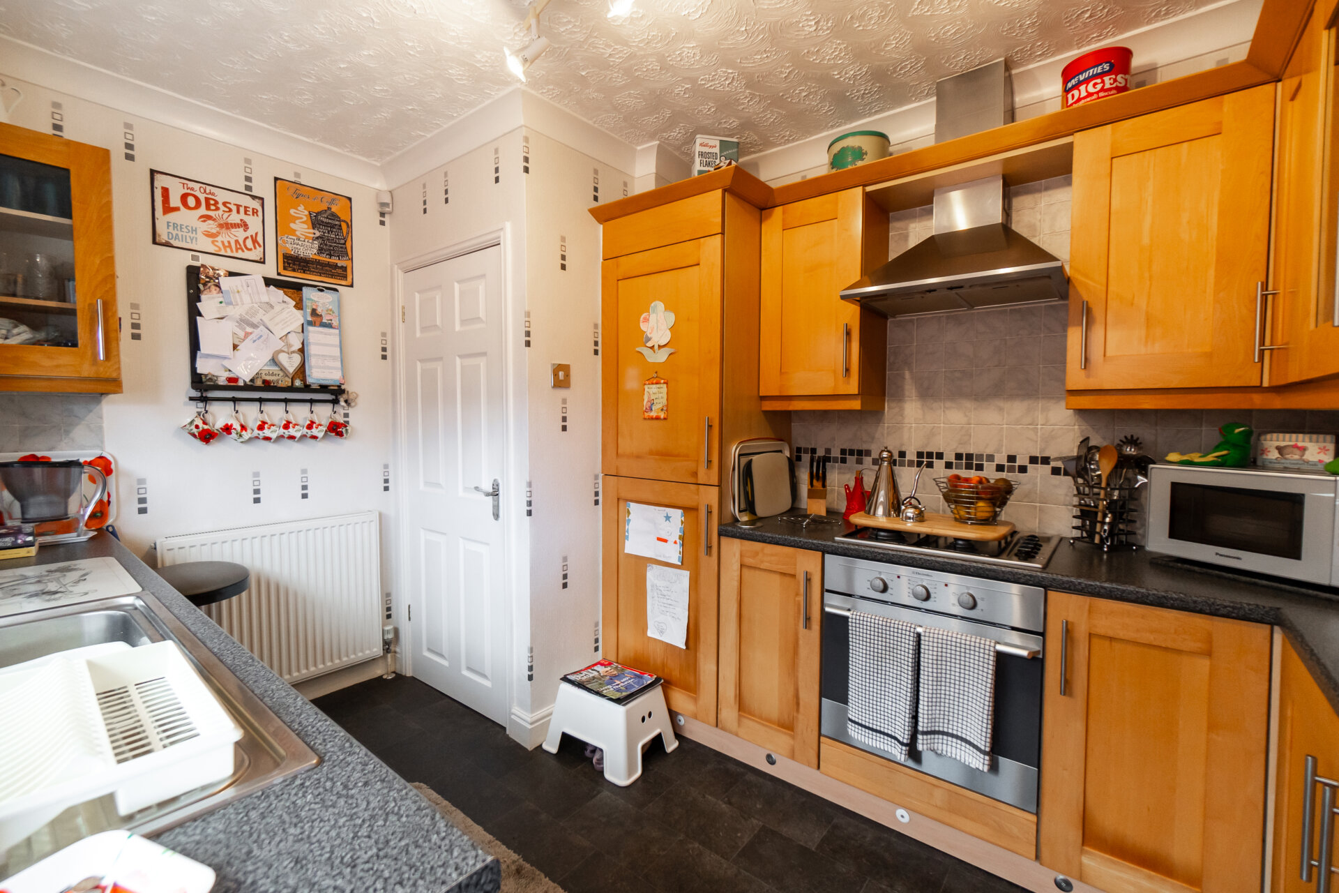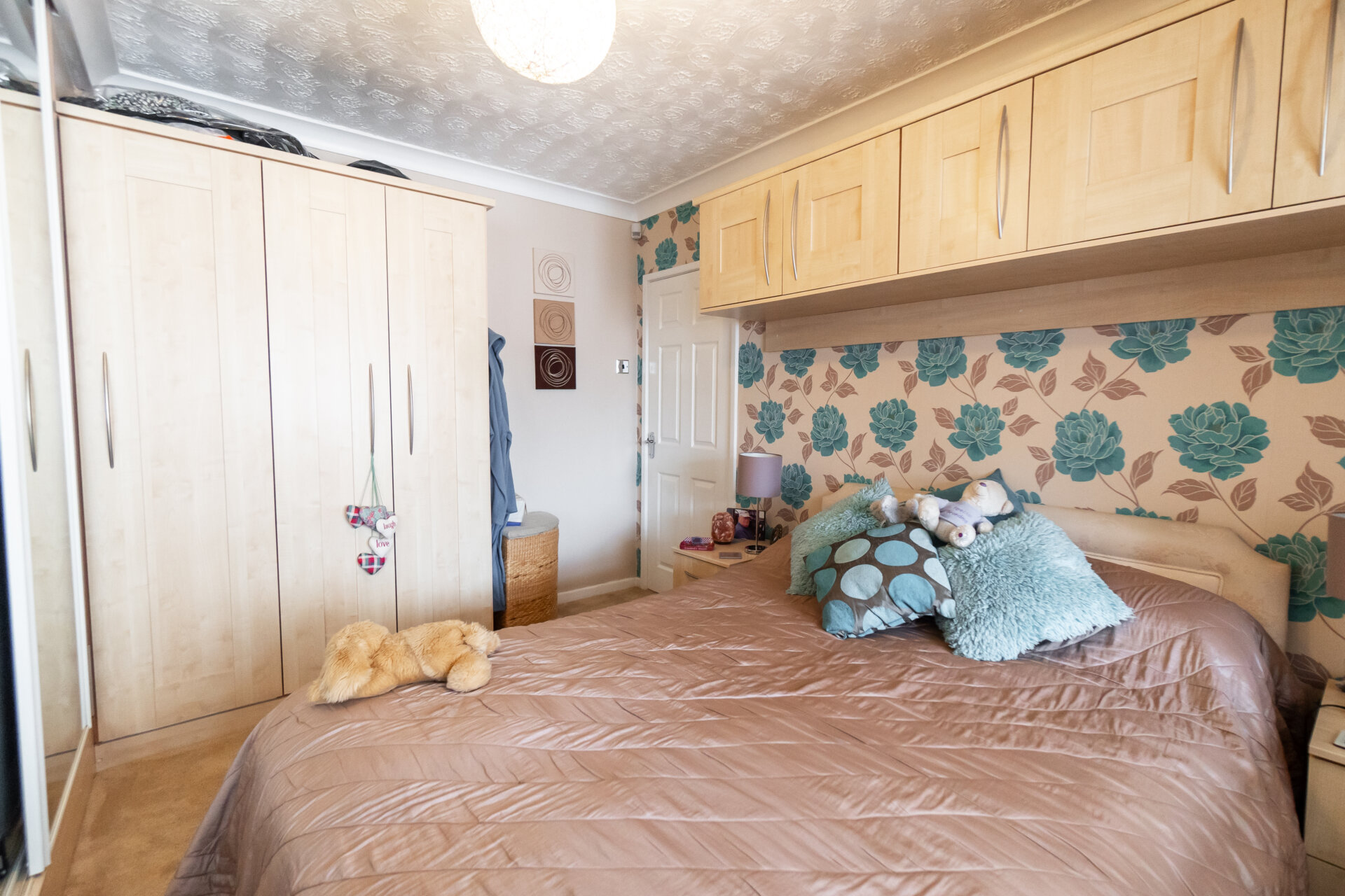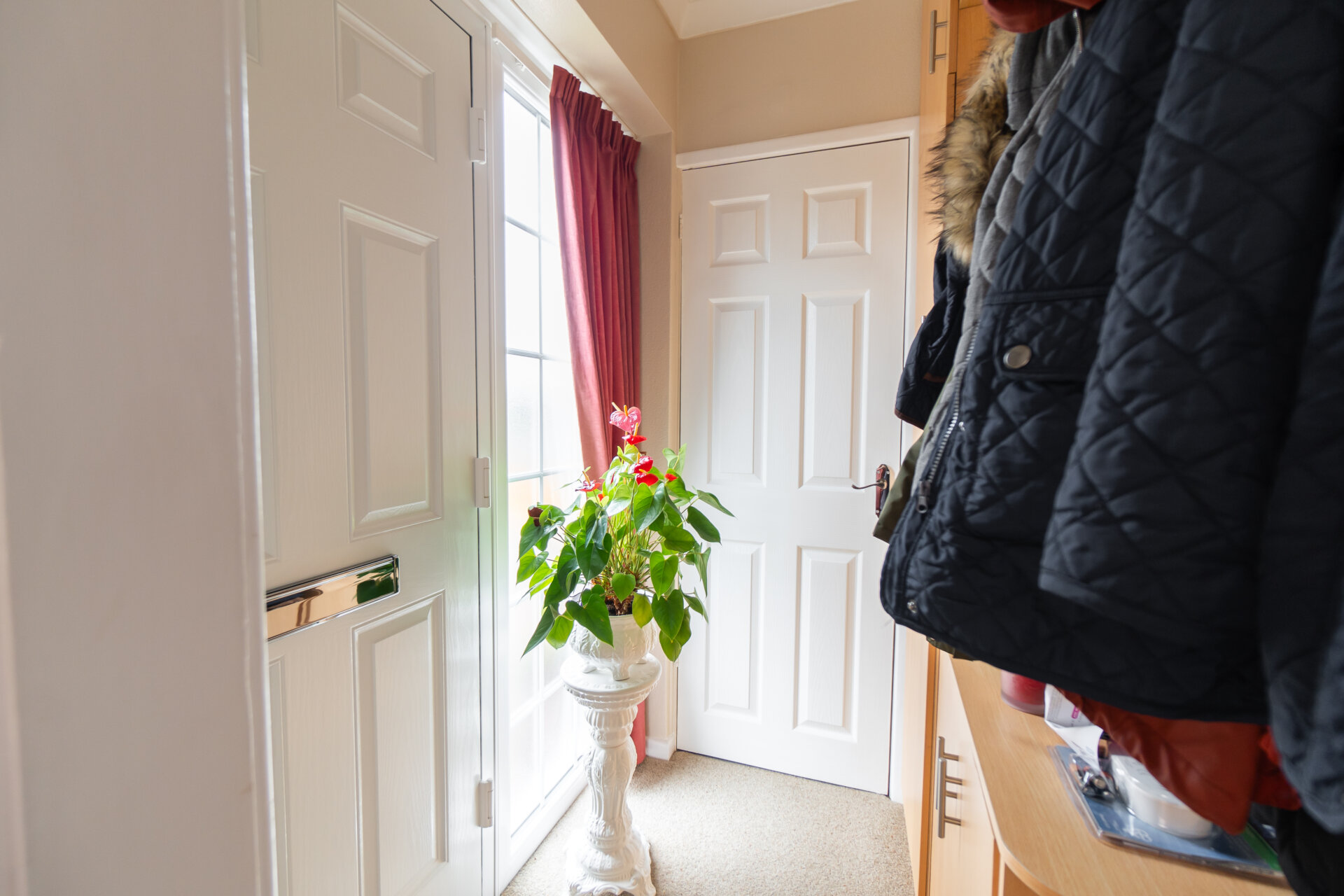 Composite front entrance door, storage cupboards, one housing the gas central heating boiler, coving to the ceiling and door to
