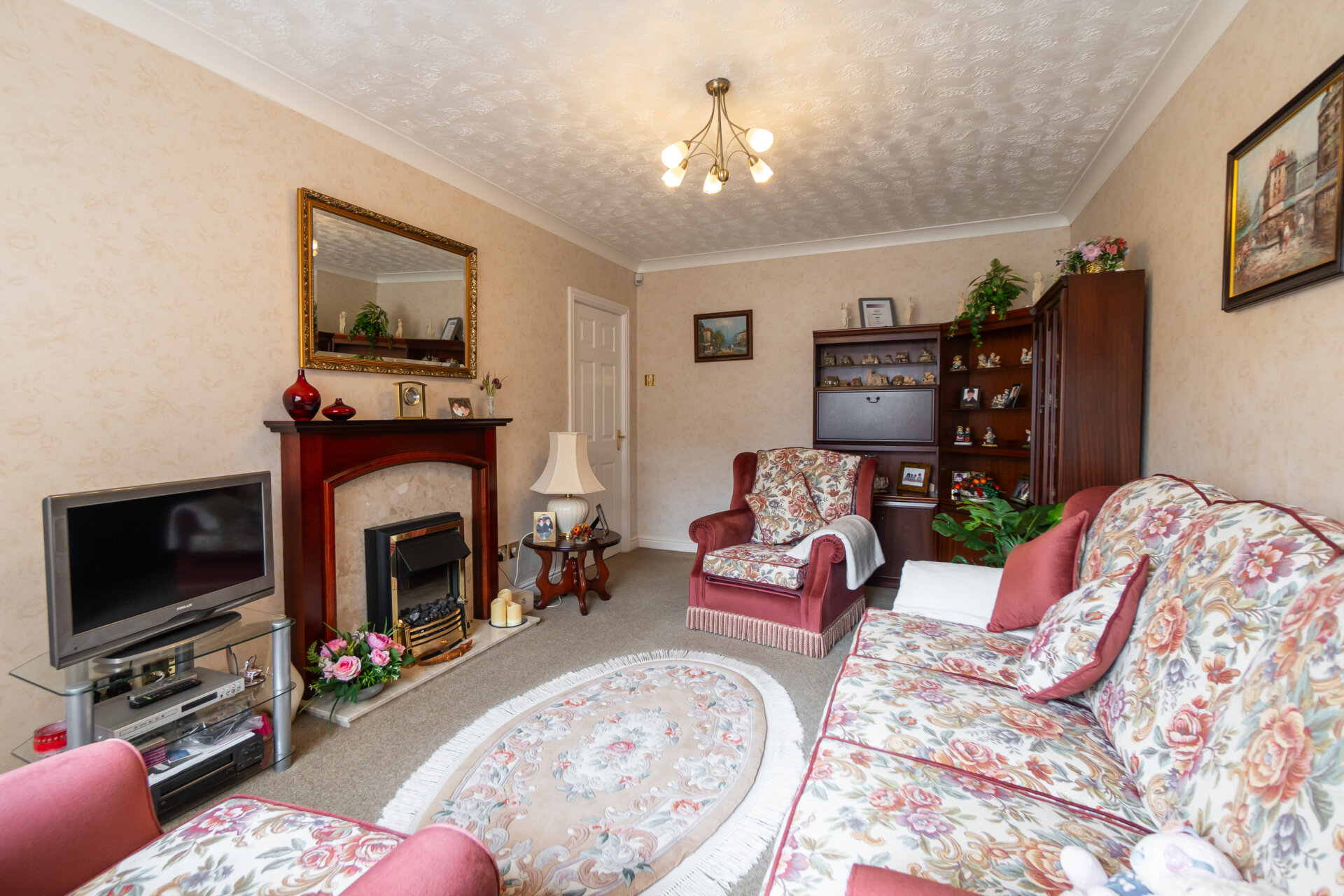 UPVC double glazed window to the front, gas fire with Adam style surround, coving to the ceiling, radiator, TV point and door to inner hallway