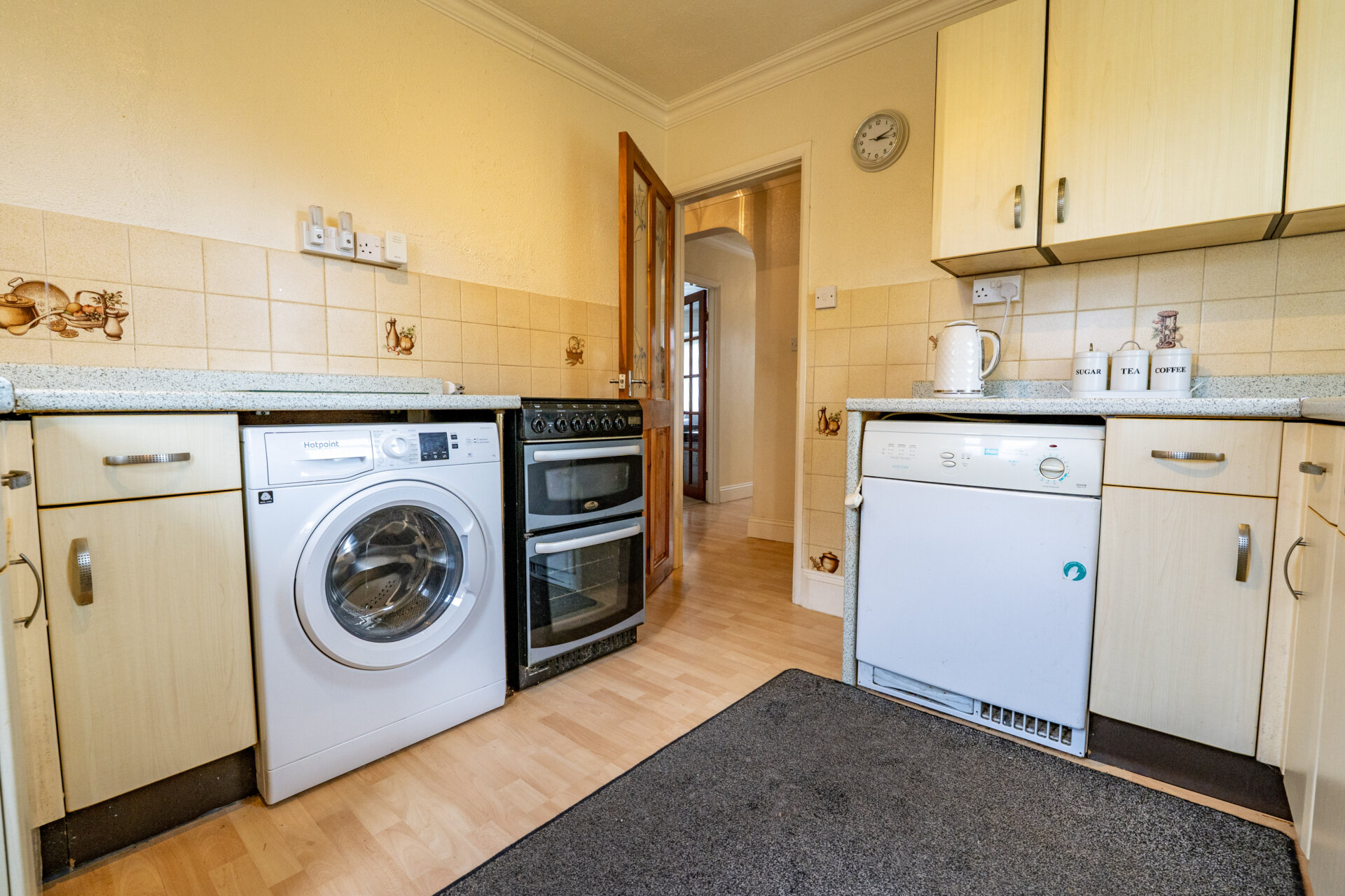 Wall, base and drawer units with work surface over, sink/waste/drainer unit with mixer tap over, tiled walls and splashbacks, UPVC double glazed windows x2, plumbing for automatic washing aching, appliance space, coving to the ceiling, UPVC double glazed rear exit door.