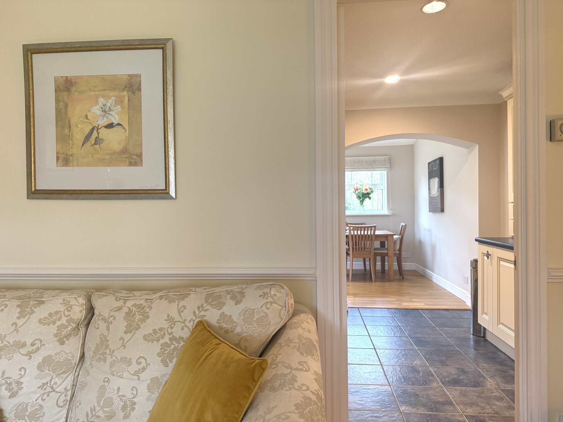 Laminate worktops are complemented by a neutral tiled splashback, while a composite one-and-a-quarter sink with chrome mixer tap sits beneath a feature opening, drawing in natural light from the rear extension. The space is finished with a ceramic tiled floor, inset spotlights and a radiator, and flows through to the extended dining room beyond.
