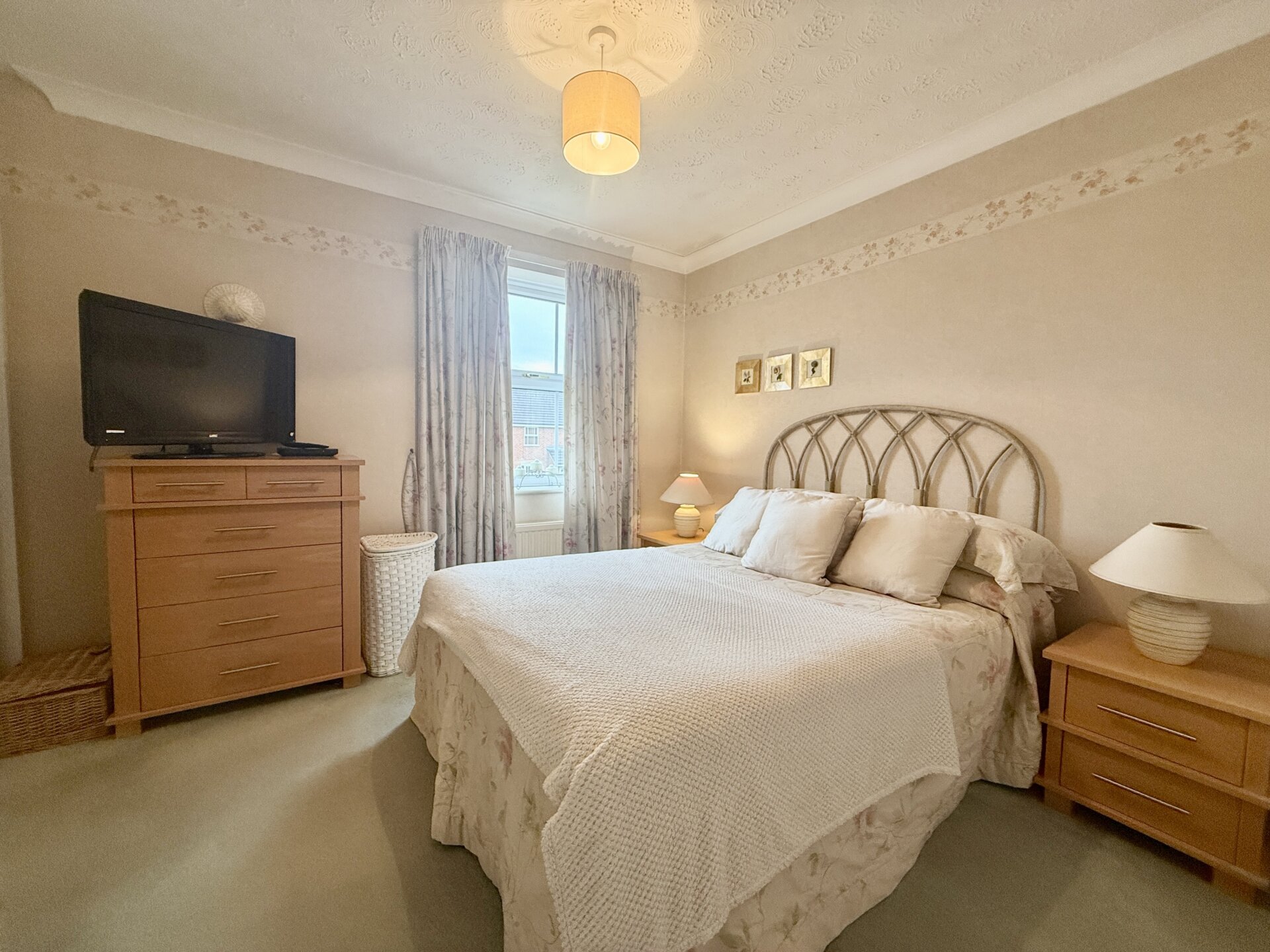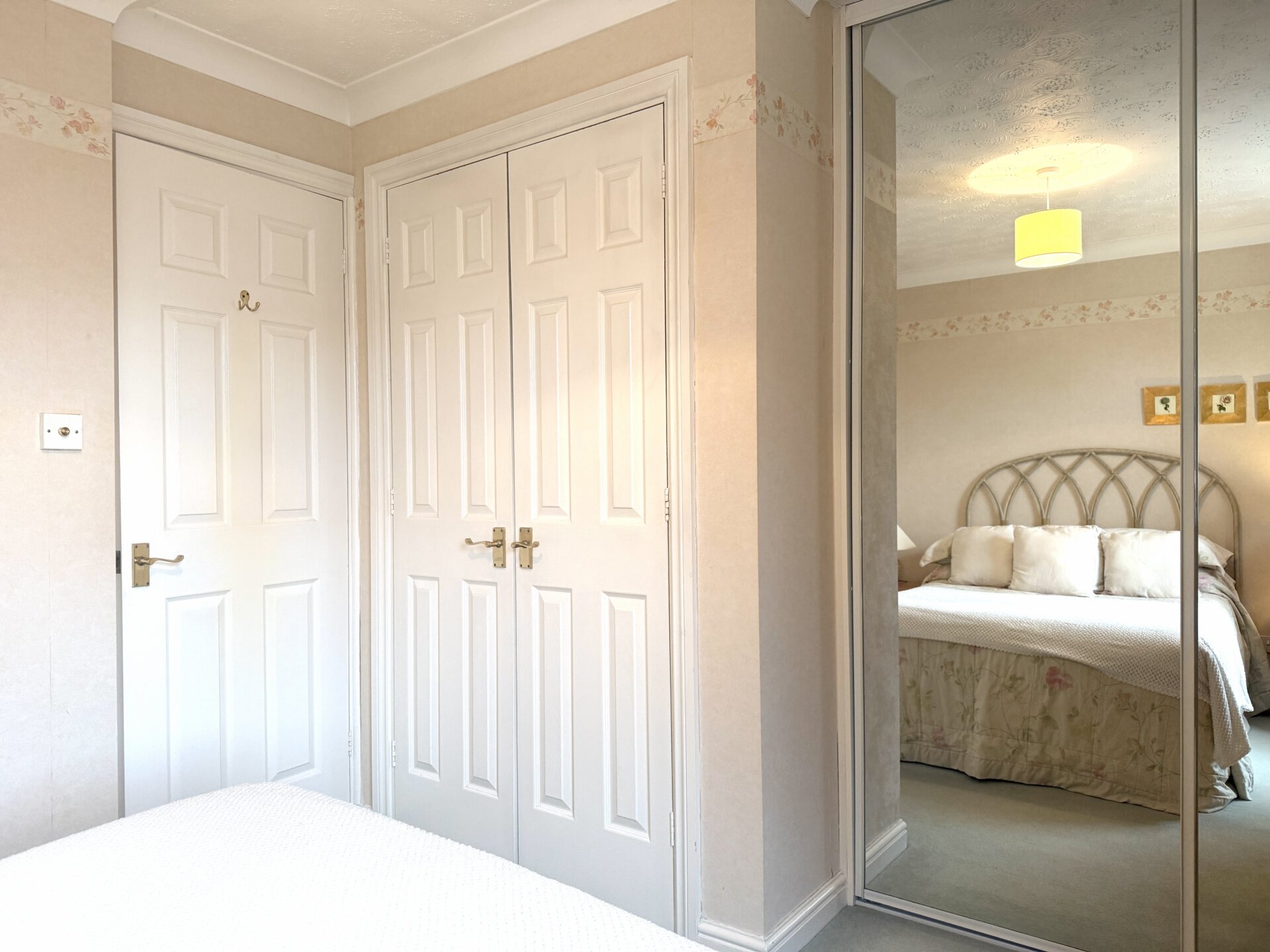 Bedroom one is a double room positioned to the front elevation, featuring a window to the front, radiator, carpet and neutral décor. A well-maintained space offering ample storage, including internal double doors opening to a deep airing cupboard and a double sliding mirrored wardrobe.