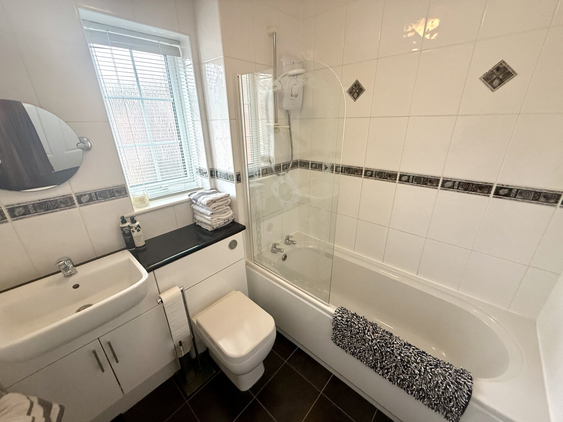 There is a window to the side elevation, and the bath is fitted with a glazed shower screen and electric shower. The walls are fully tiled, completing a practical and contemporary space.