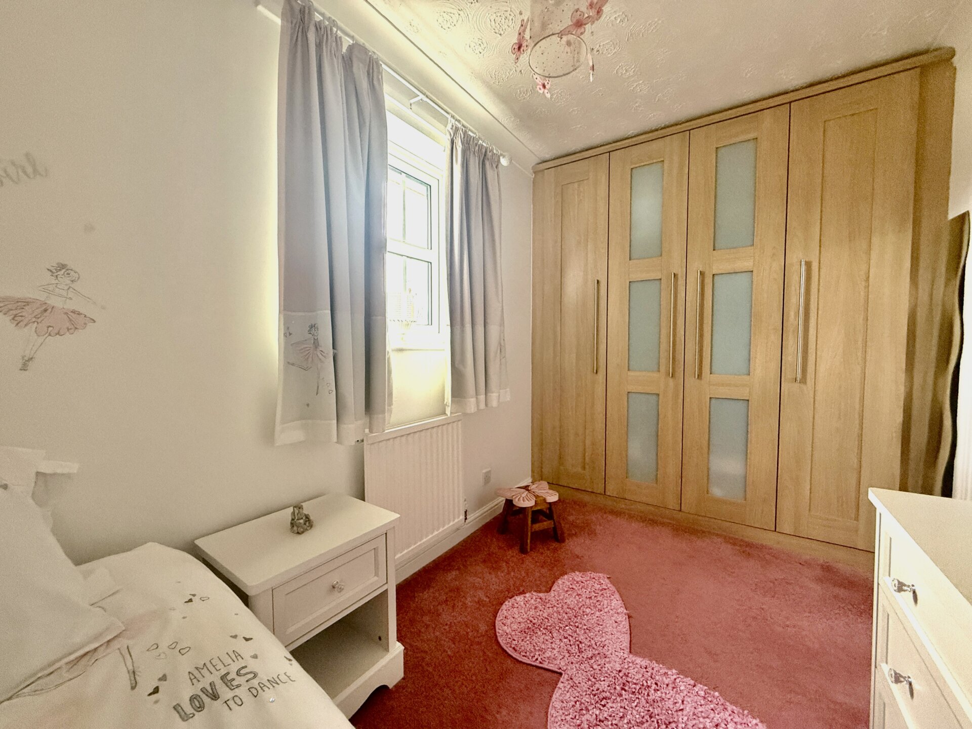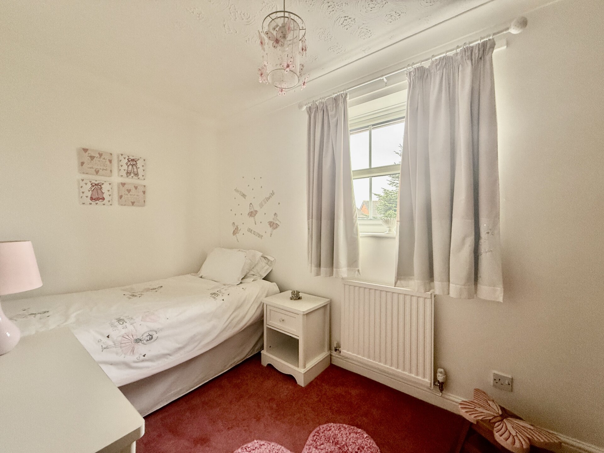 Bedroom two is positioned to the rear elevation, with a window overlooking the garden, along with a radiator and fitted wardrobe.
