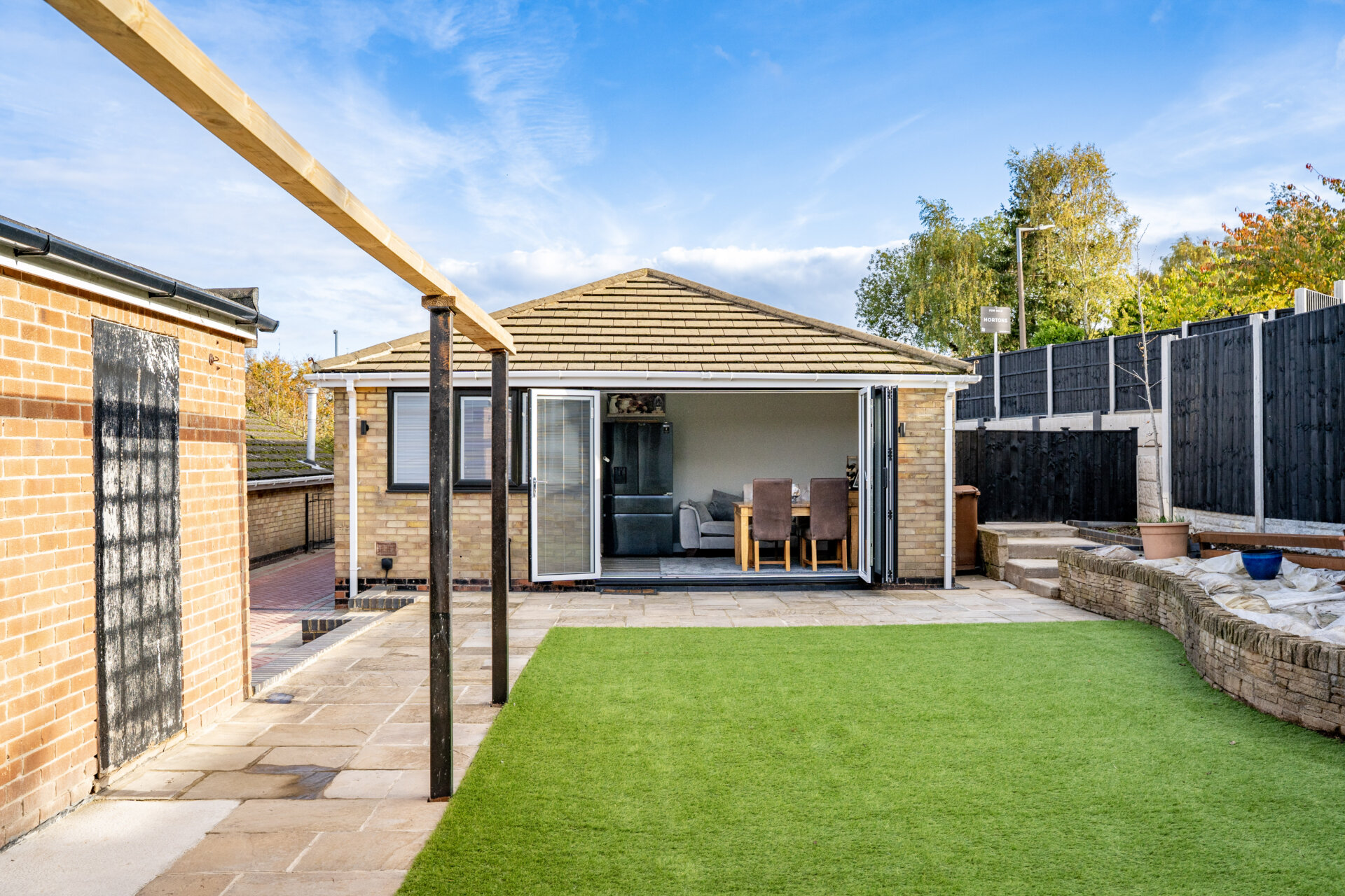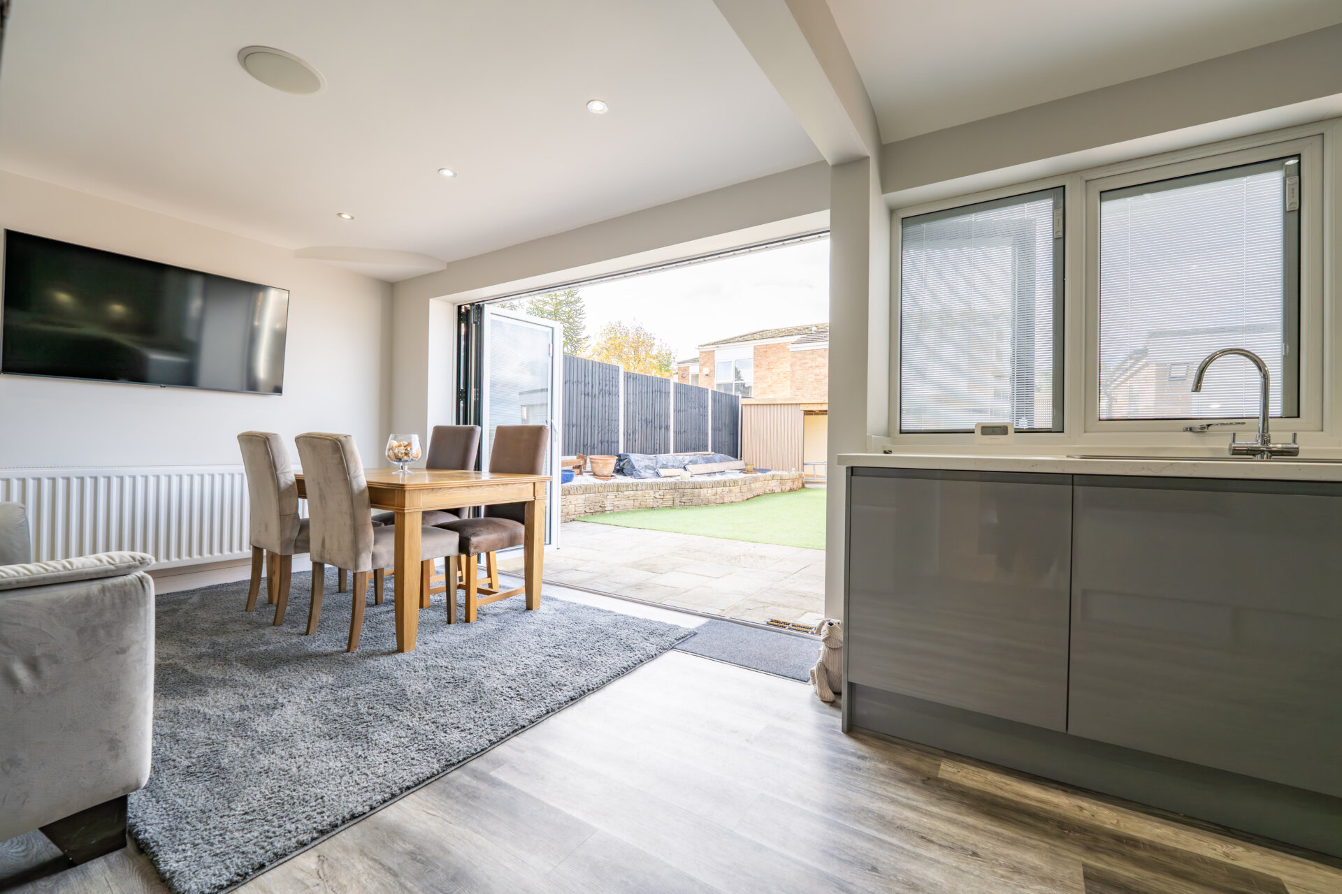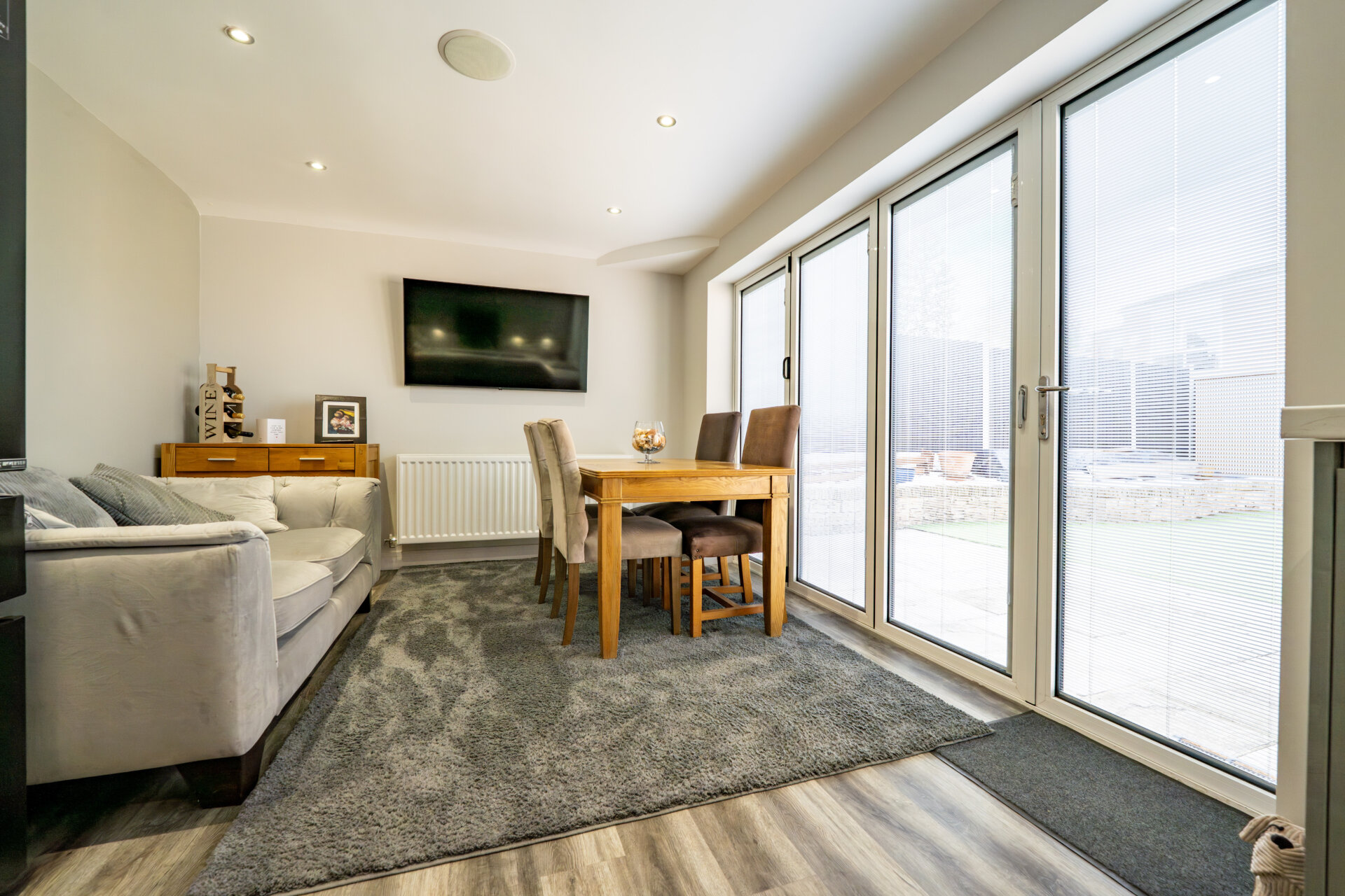 Dining Area - Bi-fold doors with internal blinds onto the garden, laminate floor, radiator, spotlights, speaker in the ceiling.