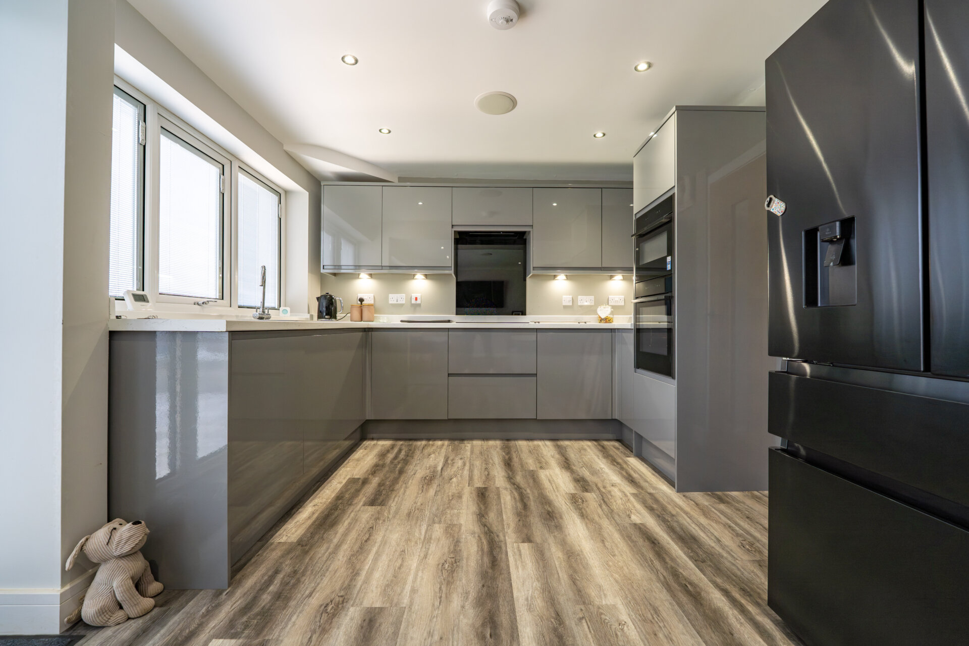 Grey, high gloss wall, base and drawer units with work surface over, sink/waste/drainer unit with swan mixer tap over, under cupboard lighting, splashbacks, integrated, eye level 'Neff' grill and seperate oven, electric hb with extract hood over, appliance space, bin drawer, UPVC double glazed window with internal blinds, laminate floor, spotlights, speaker in the ceiling and open to the