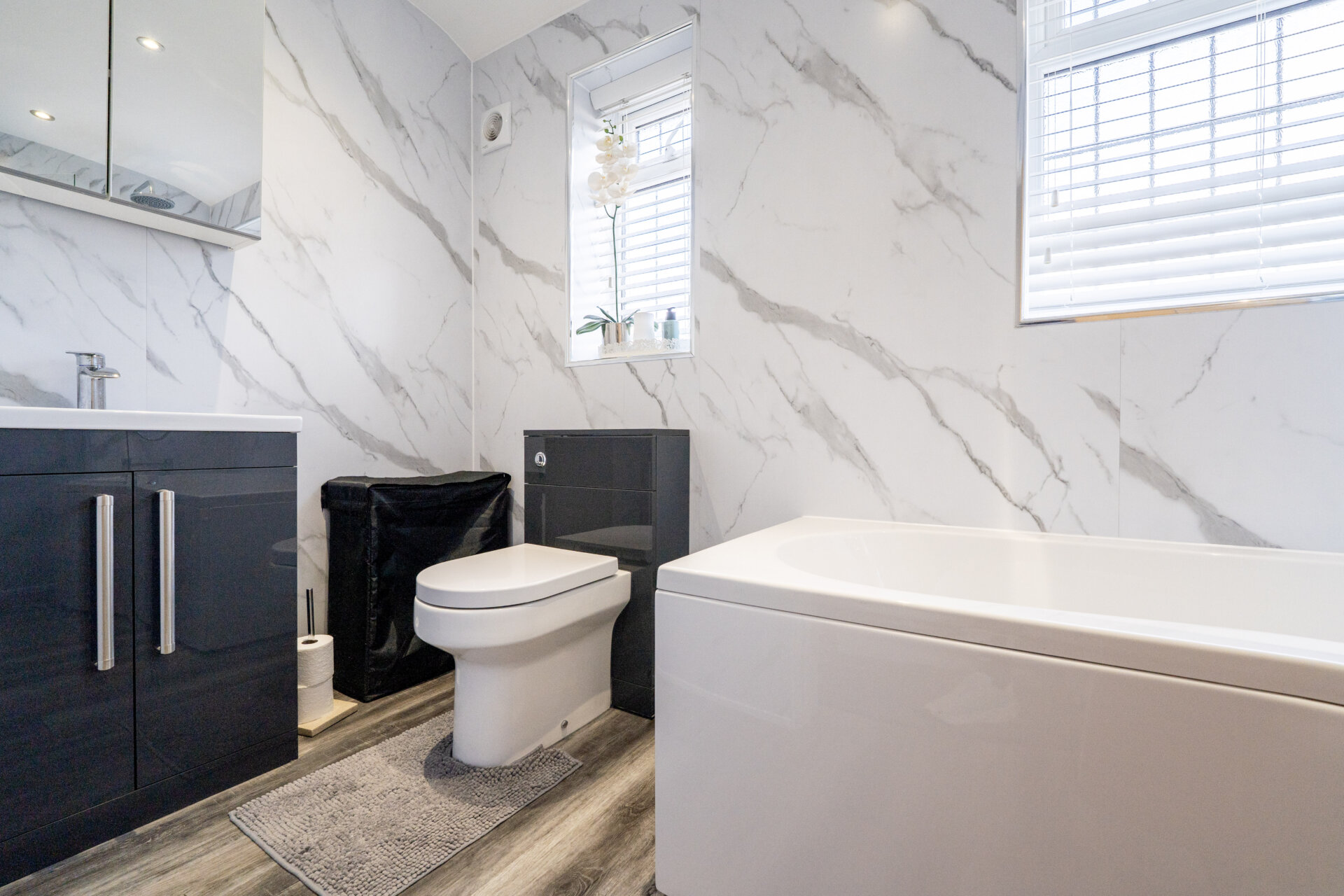 P-shaped bath with shower from the mains having a waterfall shower head and a hand held shower head, low flush w.c, sink with storage, splashbacks, UPVC double glazed windows, chrome heated towel rail, extractor fan, laminate floor.