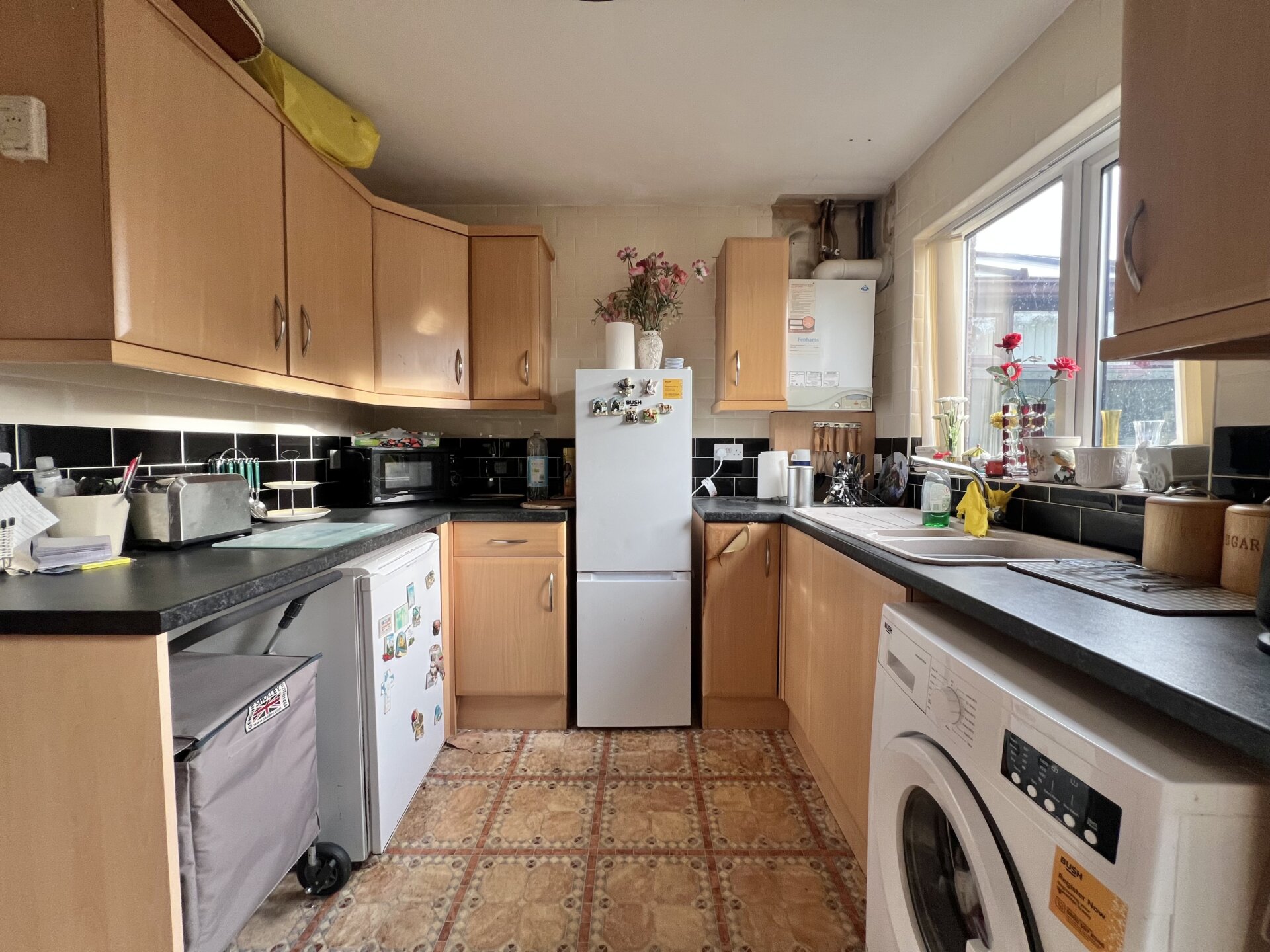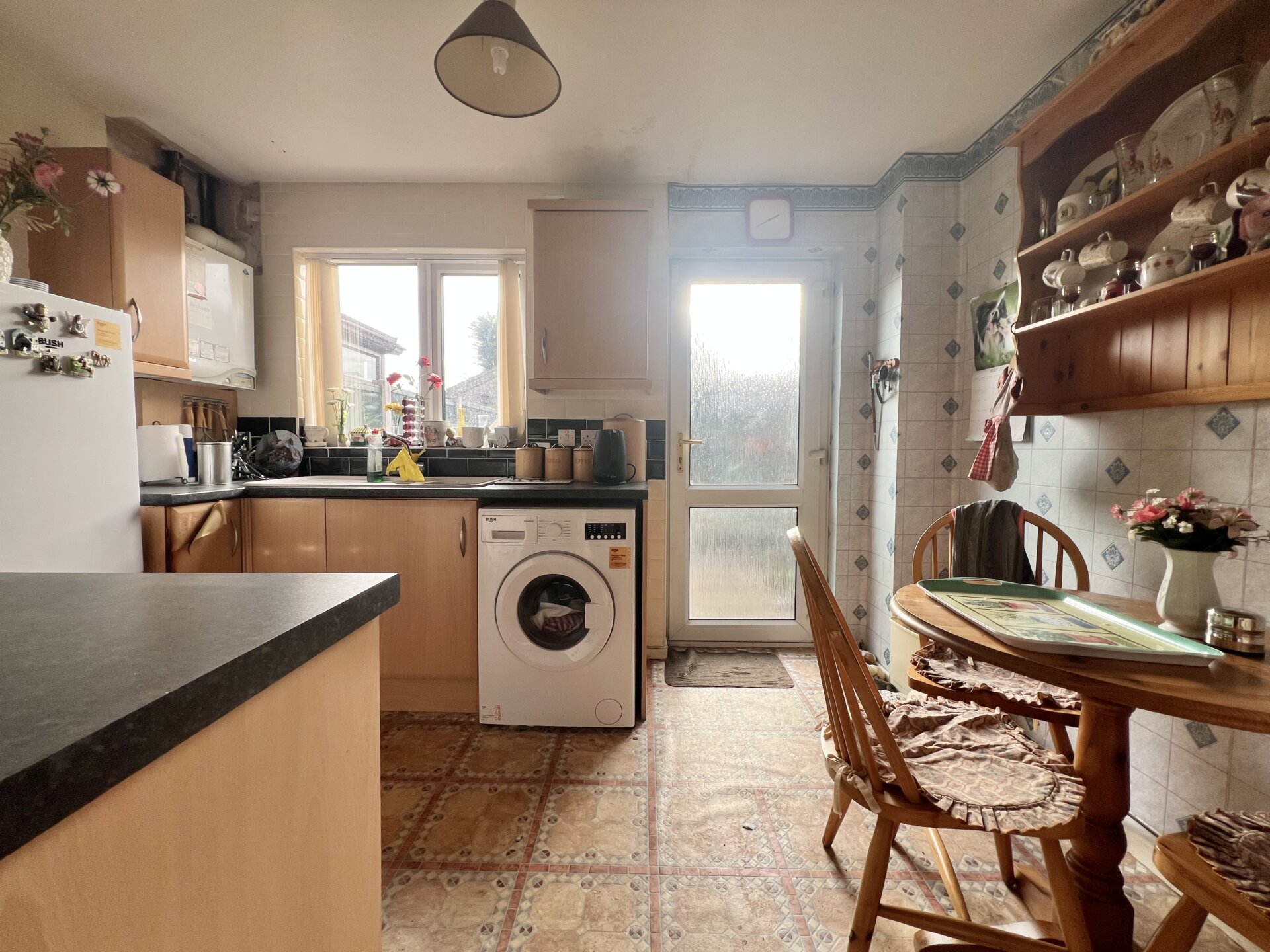 Wall, base and drawer units with work surface over, inset waste/sink/drainer unit with mixer tap over, tiled walls and splashbacks. gas central heating boiler, radiator, UPVC double glazed window and rear exit door.
