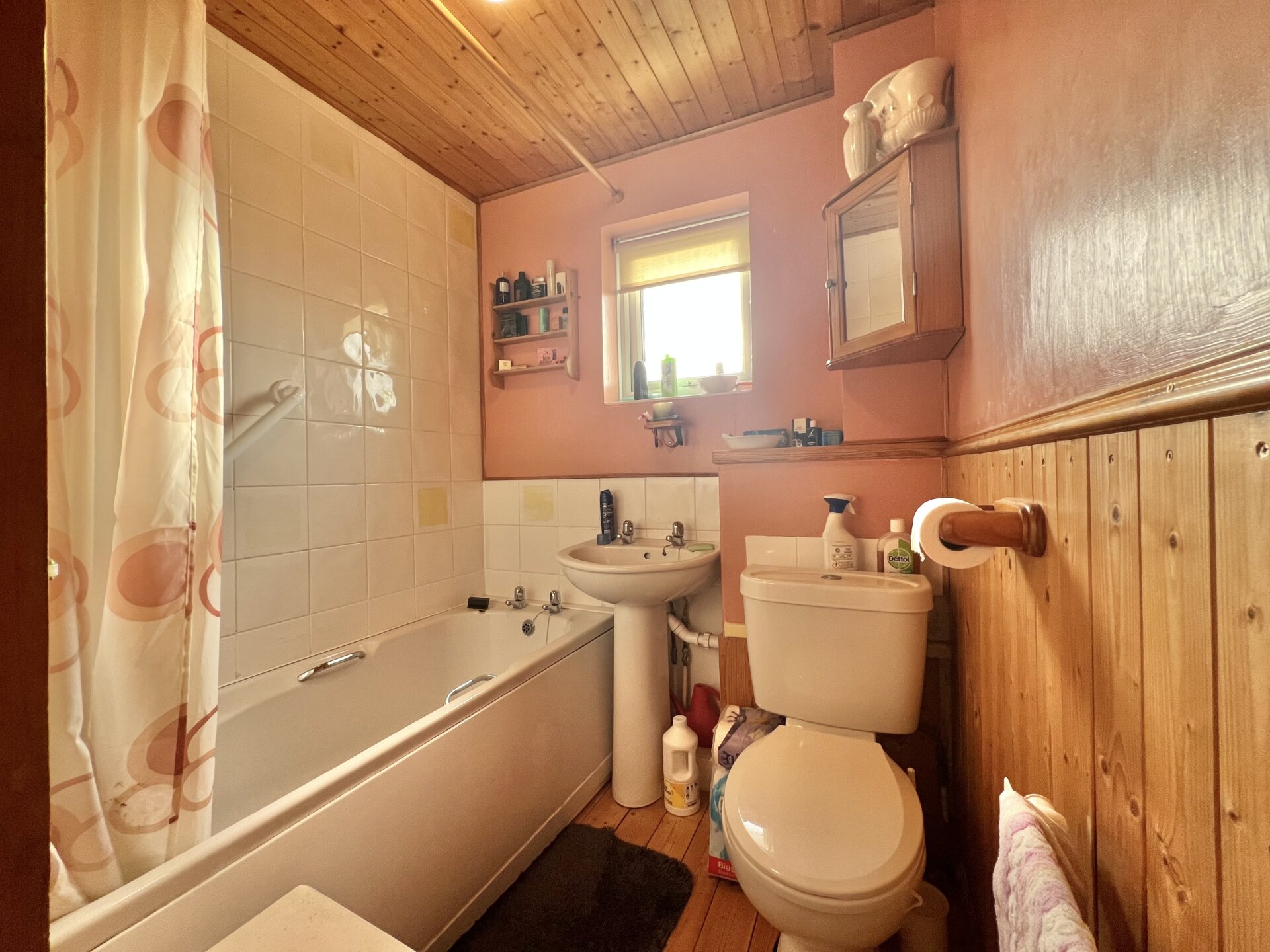 Panelled bath with electric shower over, pedestal wash hand basin, low flush w.c, radiator, UPVC double glazed window to the rear.