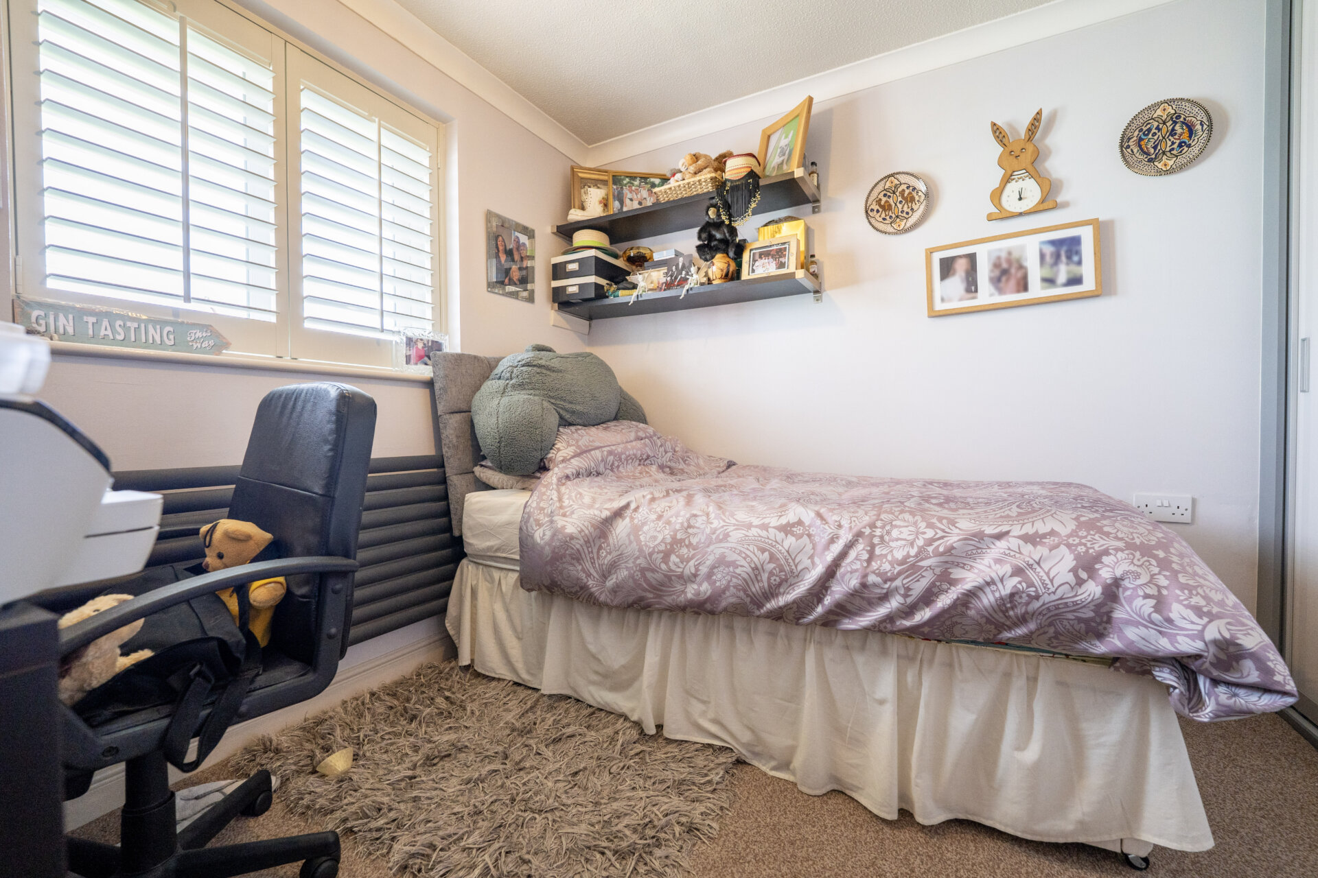 UPVC double glazed window with fitted shutters, modern radiator and built-in wardrobe