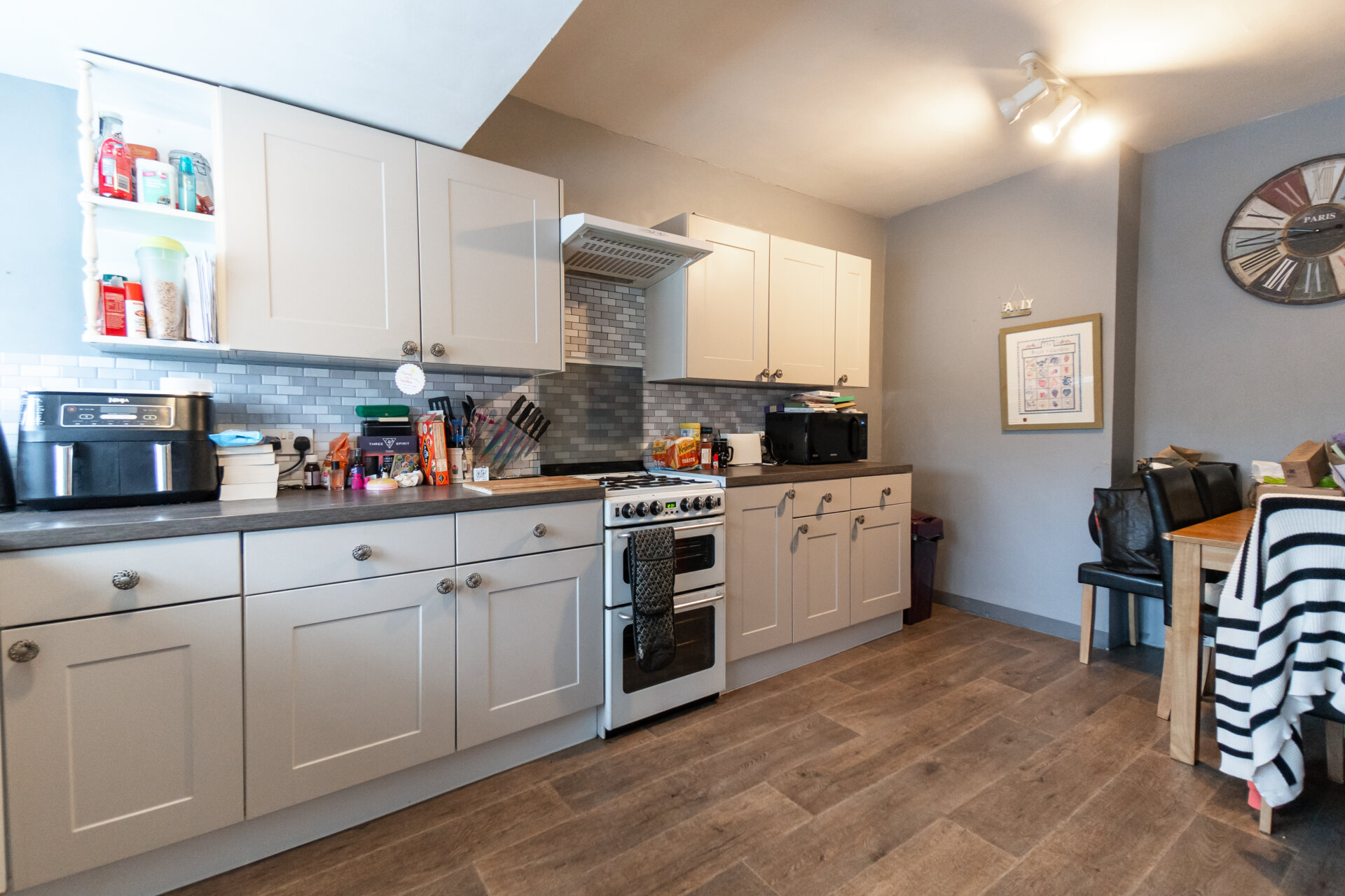 Base units with roll edged work surface over, sink with mixer tap, tiled walls and splashbacks, composite rear exit door, UPVC double glazed window to the rear, gas central heating boiler, under stairs storage cupboard, radiator, plumbing for automatic washing machine and appliance space.