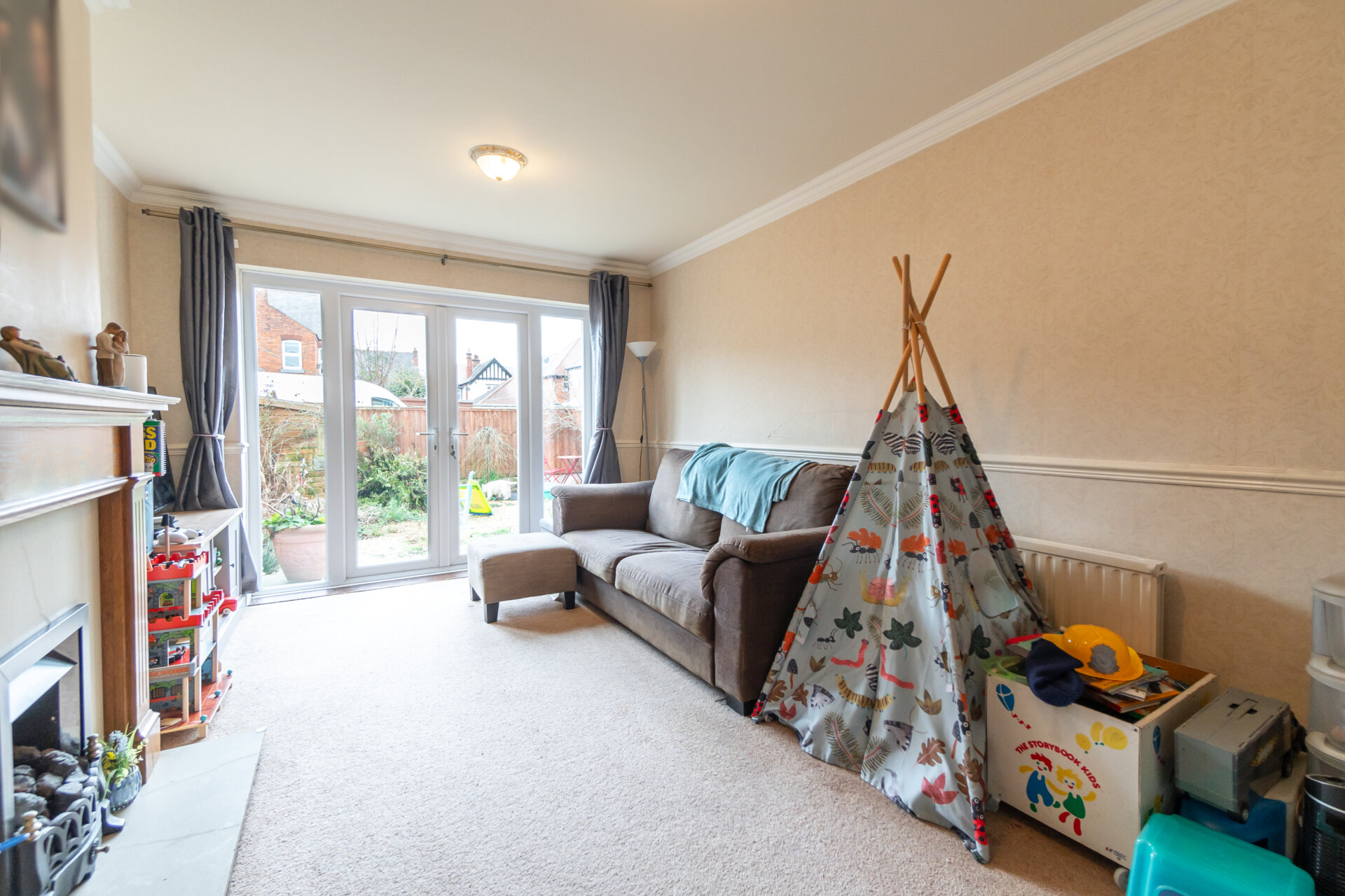 UPVC French Doors and window to the rear garden, radiator, TV point, dado rail, coving to ceiling, gas fire with Adam style surround.