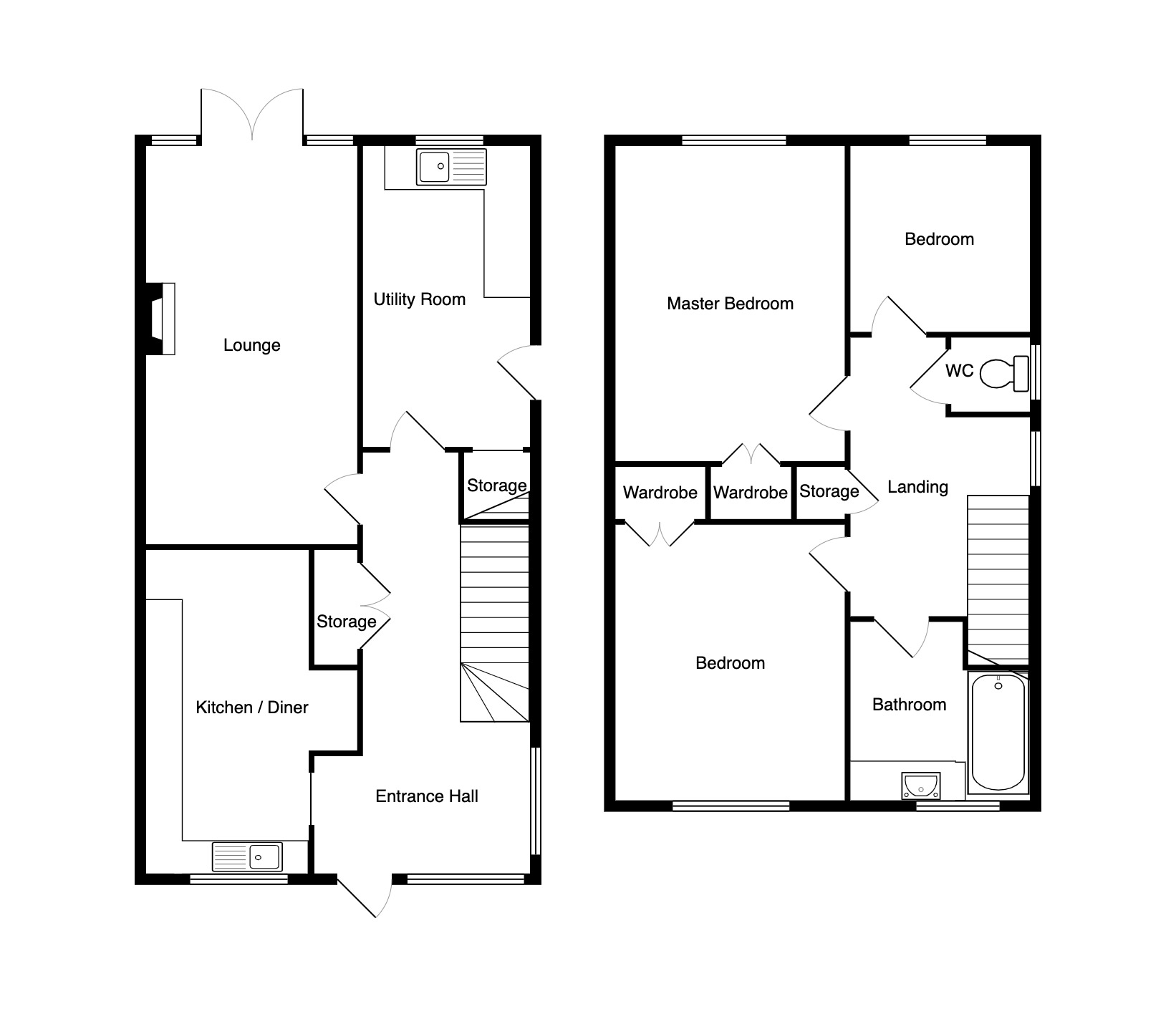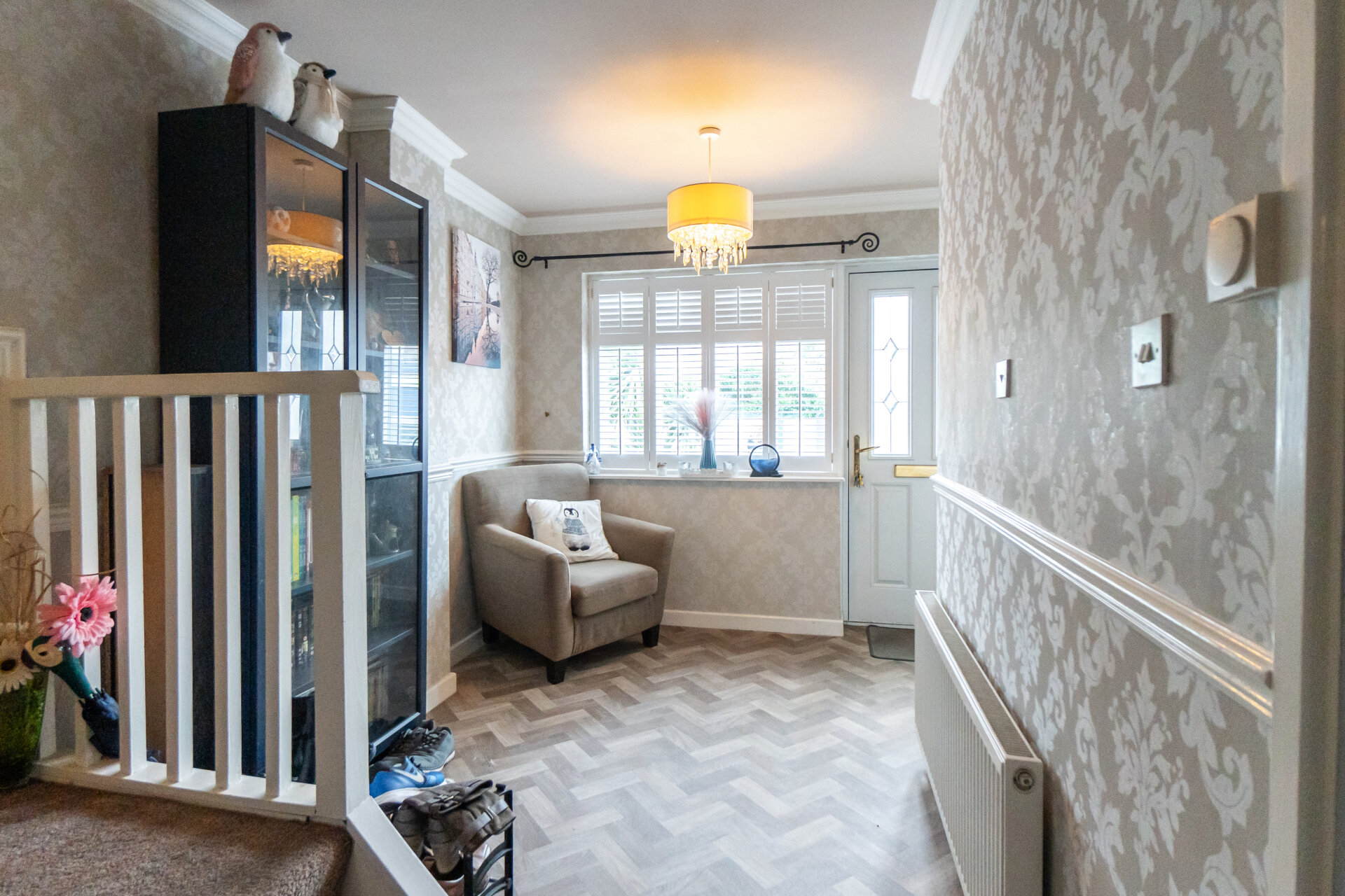 Composite front entrance door, UPVC double glazed window, door to a large storage cupboard, stairs to the first floor landing, x2 radiators and doors to