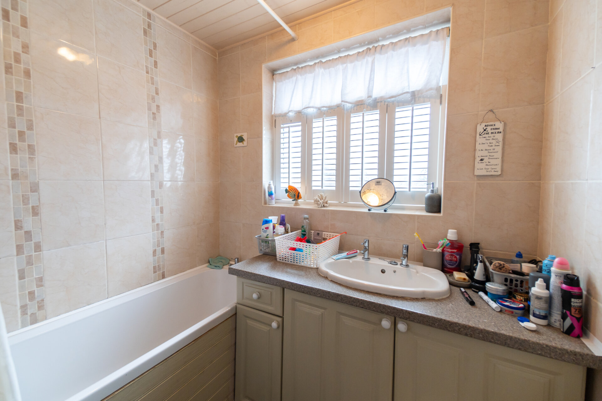 panelled bath with electric shower over, vanity unit with sink and storage, tiled walls and splashbacks, radiator, UPVC double glazed window with shutters