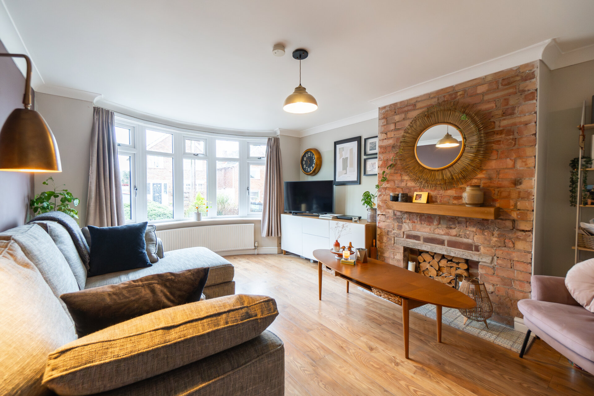 UPVC double glazed bay window to the front, exposed brick chimney breast, coving to the ceiling, laminate floor, radiator, TV point