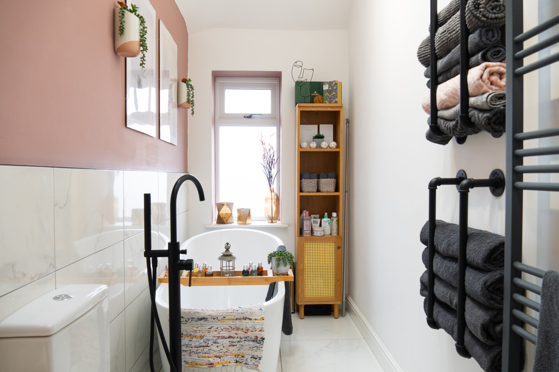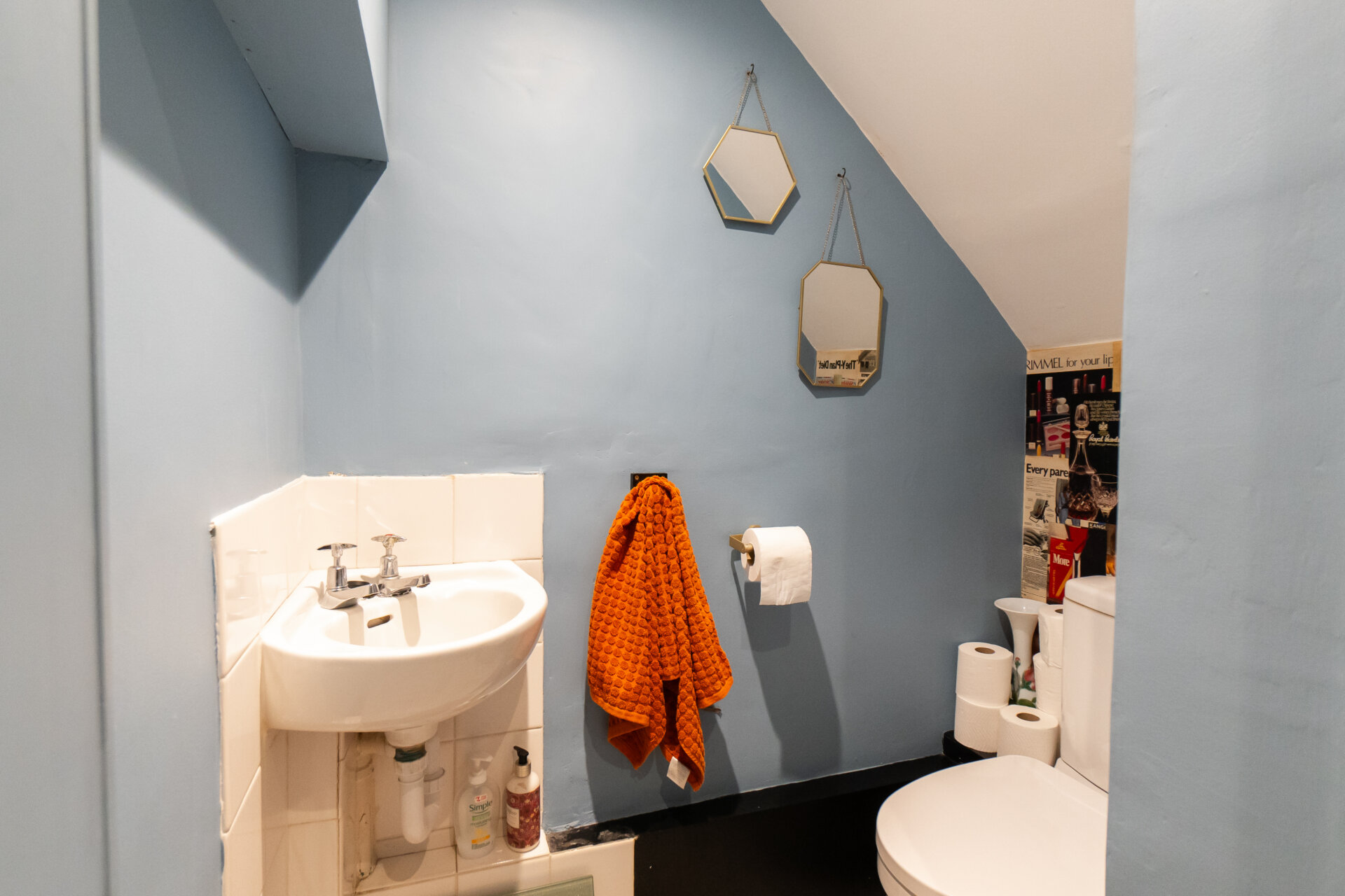 A four piece suite comprising a free standing bath with mixer tap over, low flush w.c, sink bowl with storage underneath, walk-in shower cubicle with shower from the mains having a waterfall shower head and a hand held shower head, x2 UPVC double glazed windows, tiled floor and tiled floor and splashbacks, x2 velux windows with vaulted ceiling