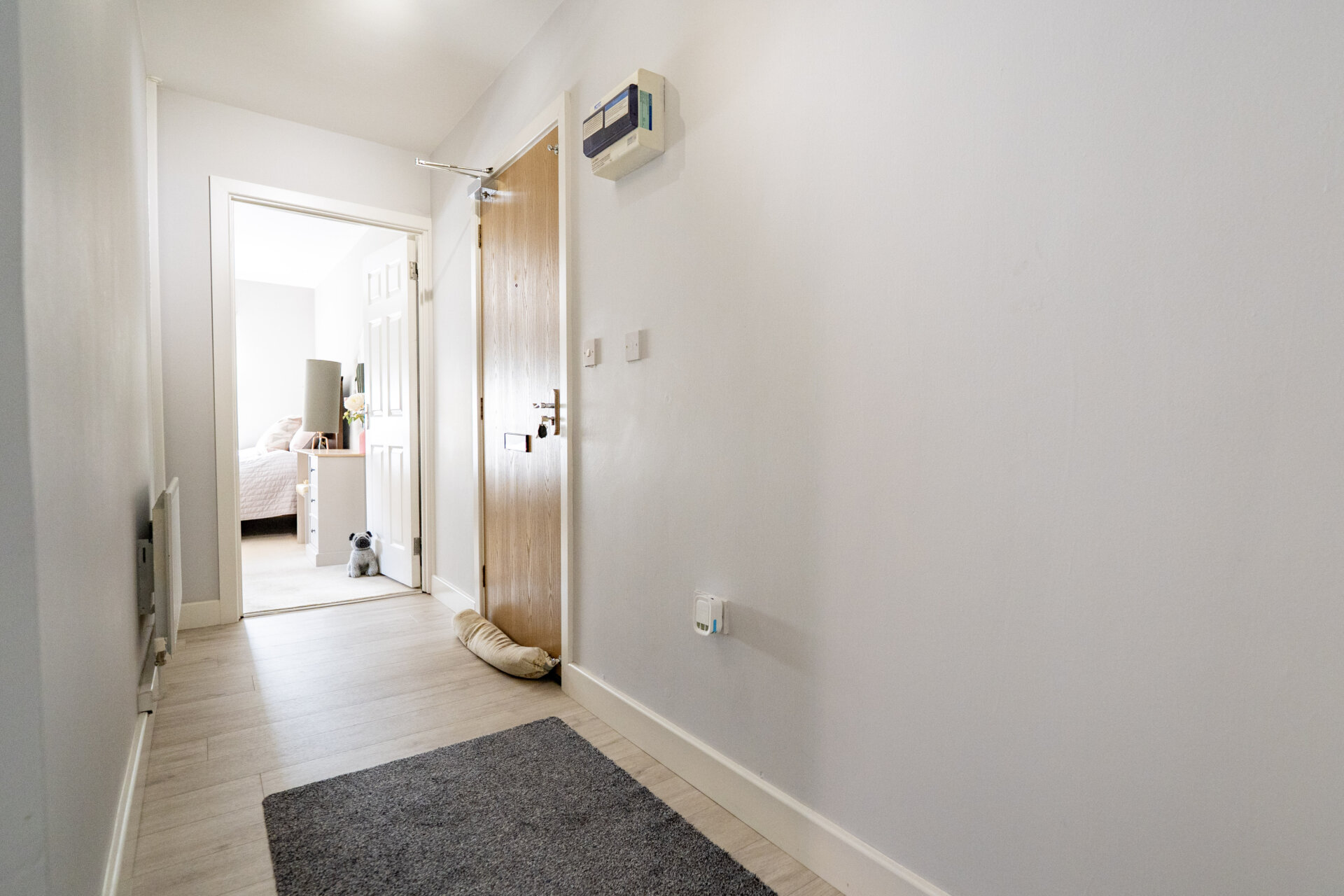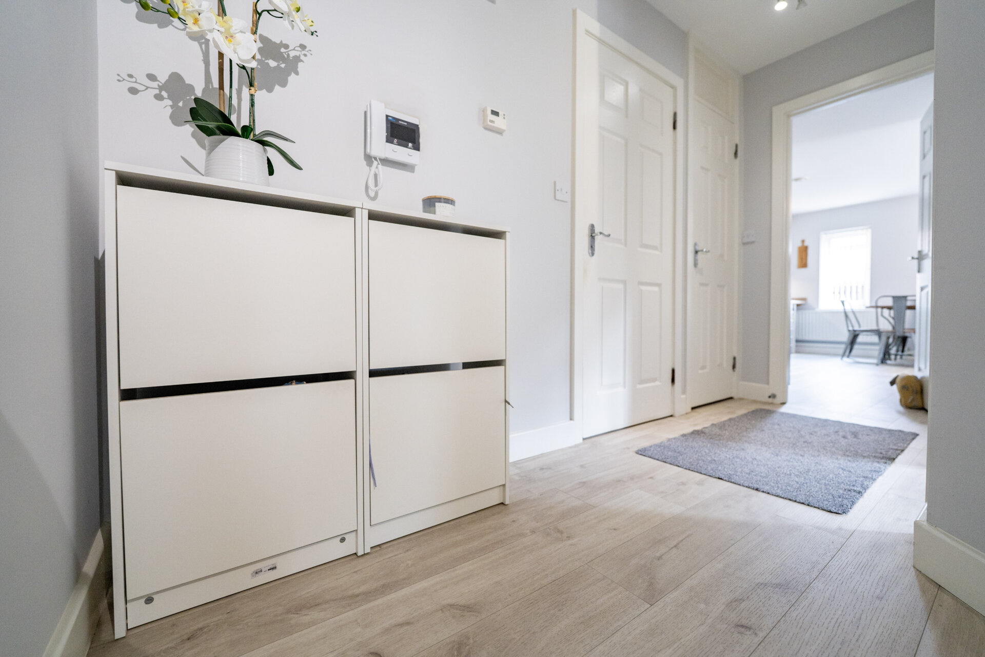 Laminate floor, intercom phone, door to storage cupboard and doors to