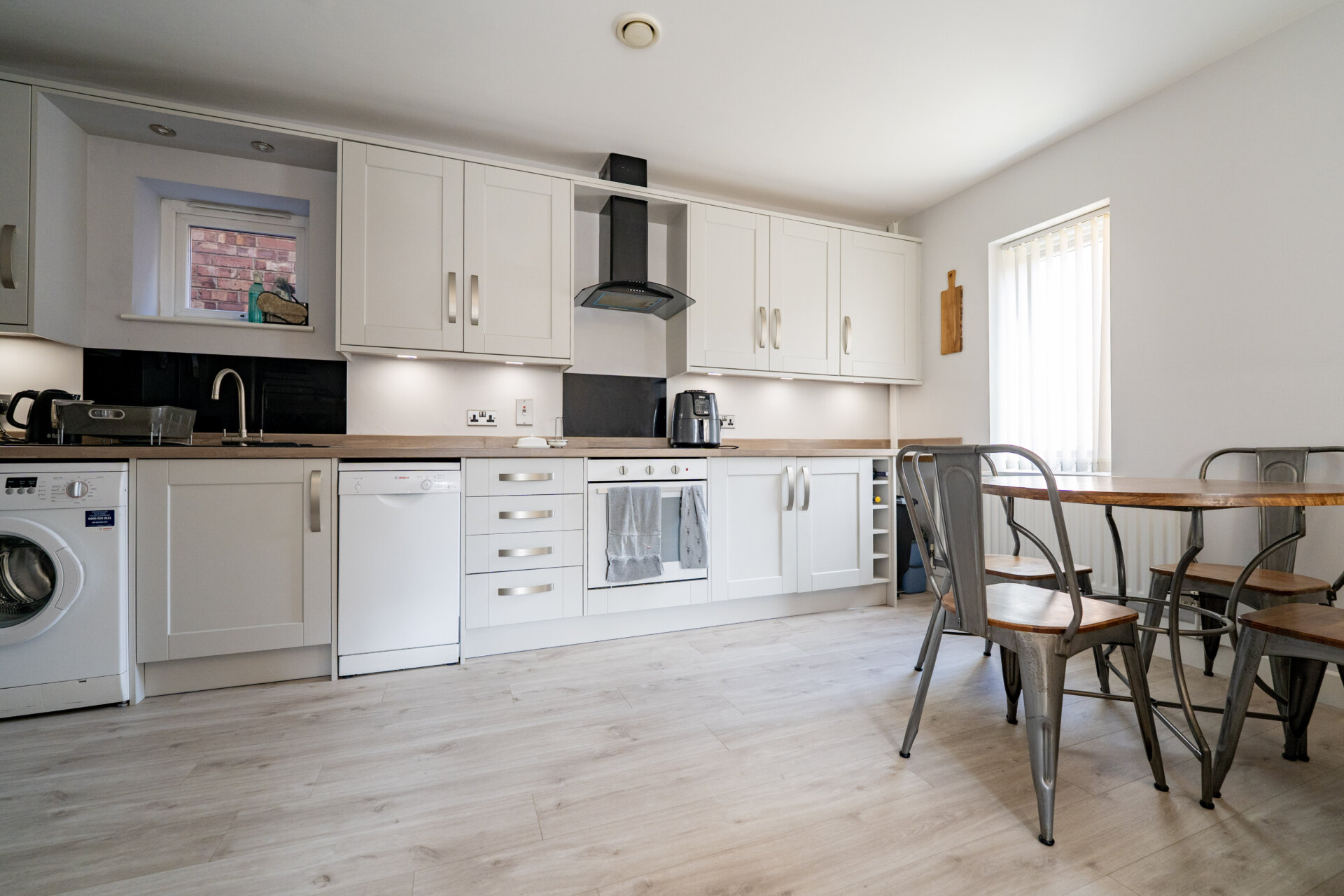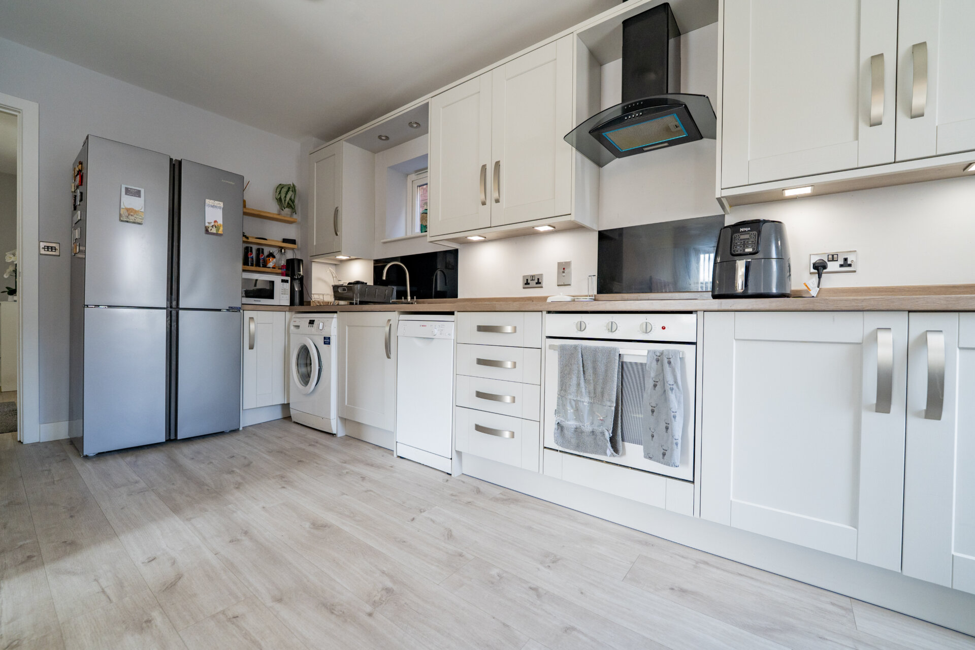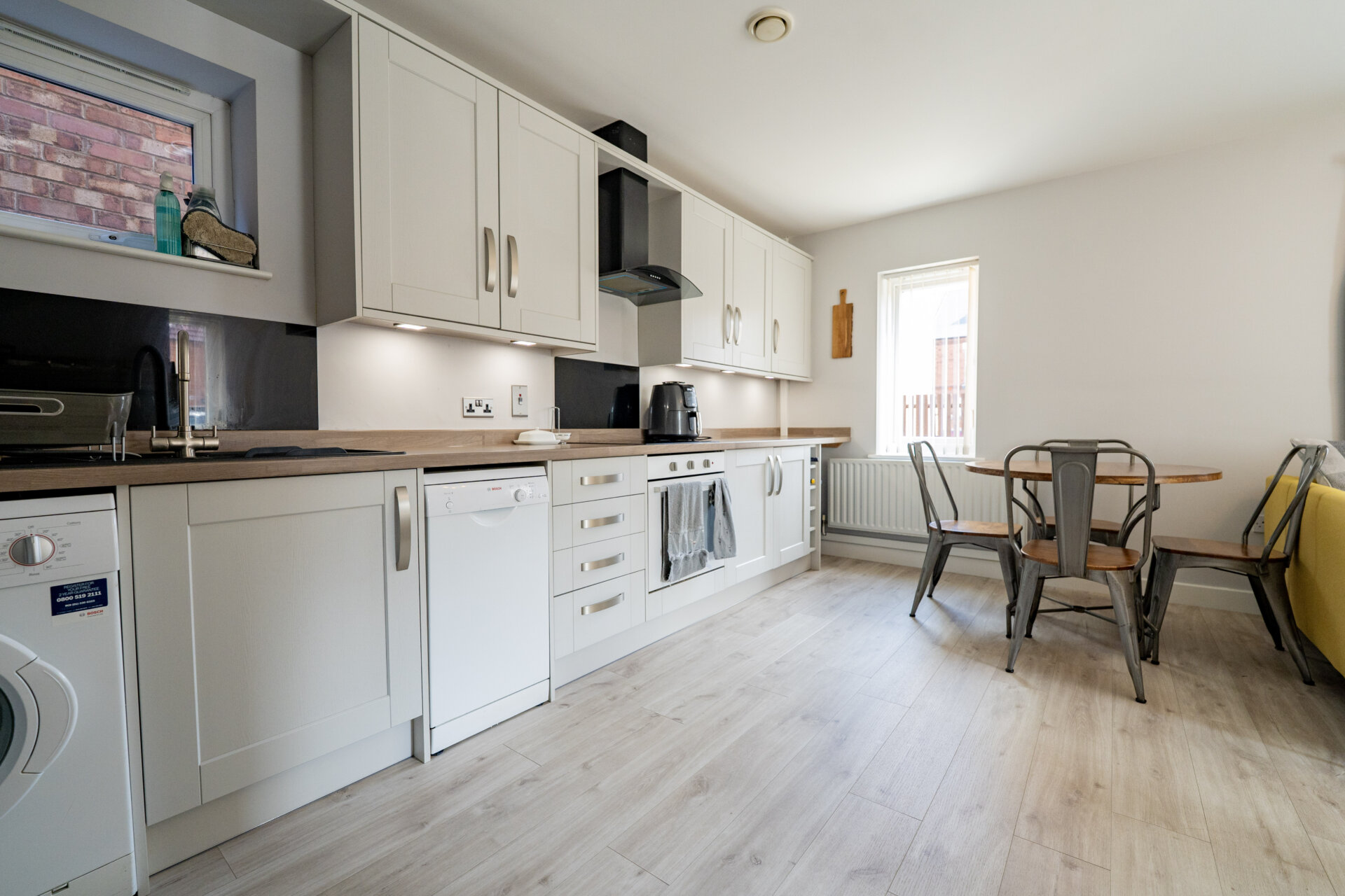 Wall, base and drawer units with work surface over, sink/waste/driainer unit with swan mixer tap over, splashbacks, spotlights, plumbing for automatic washing machine, dishwasher space, appliance space, built-in oven, electric hob and extractor hood over, x2 UPVC double glazed windows, radiator.