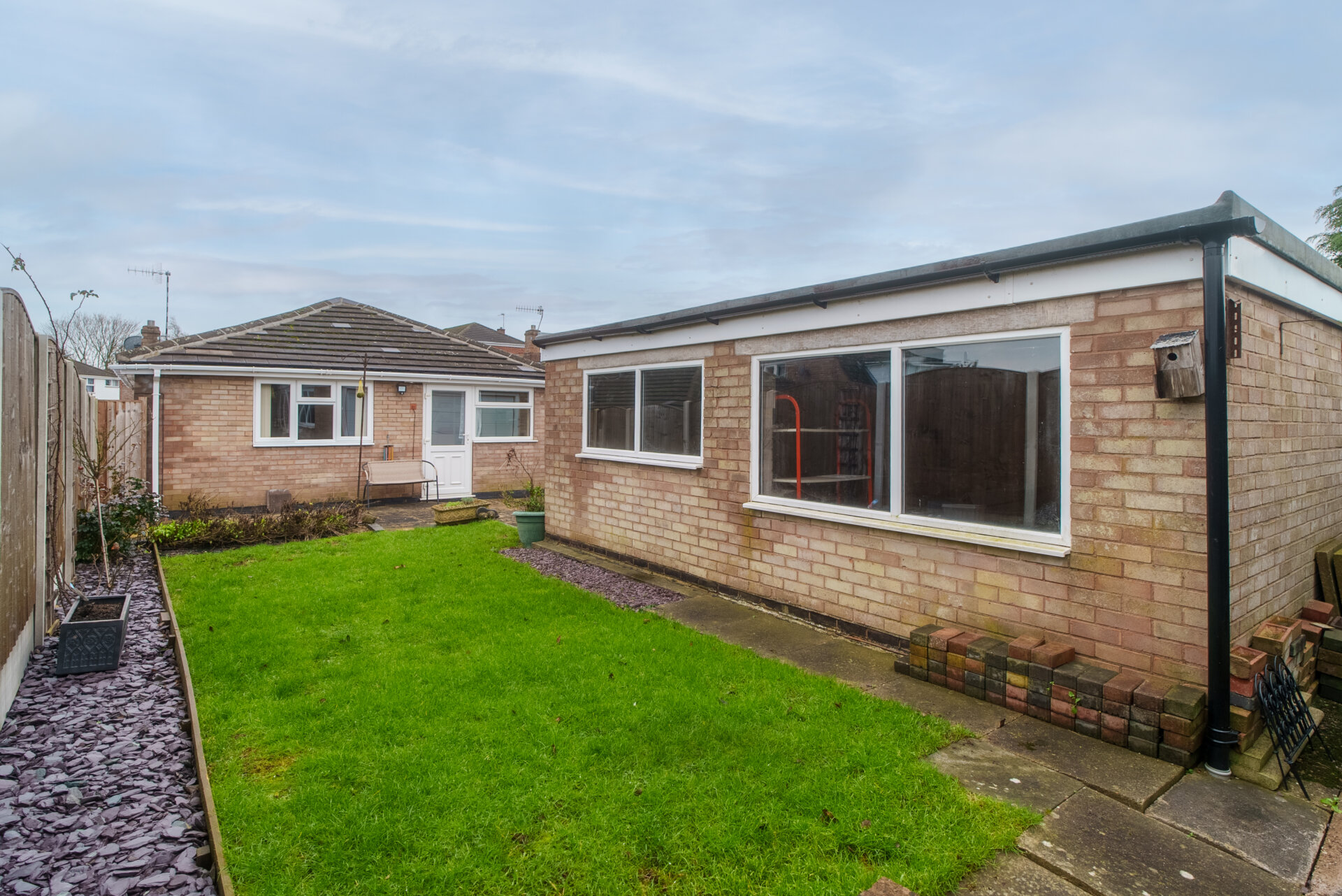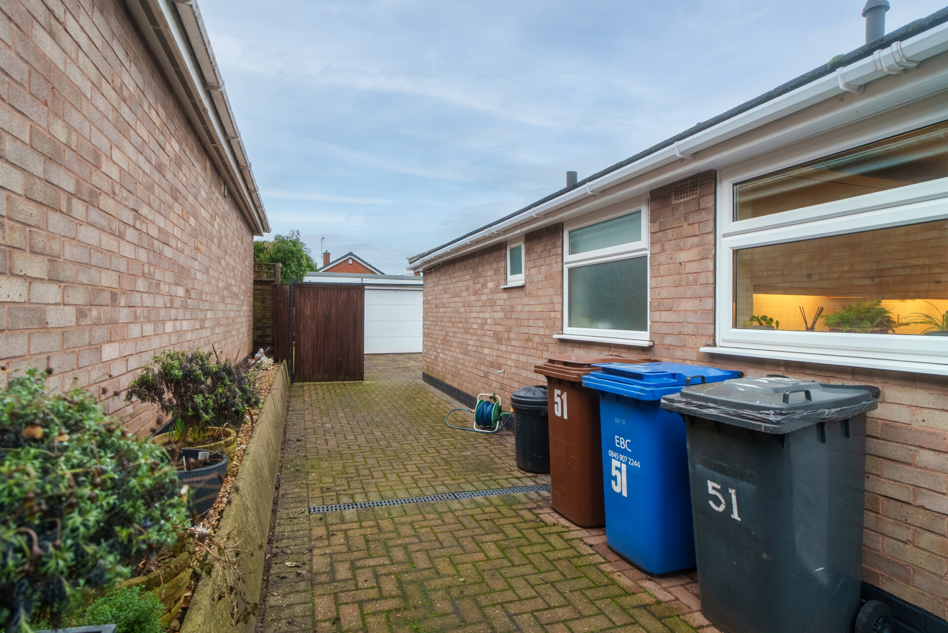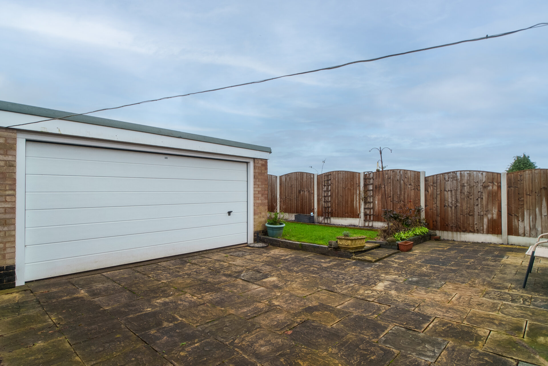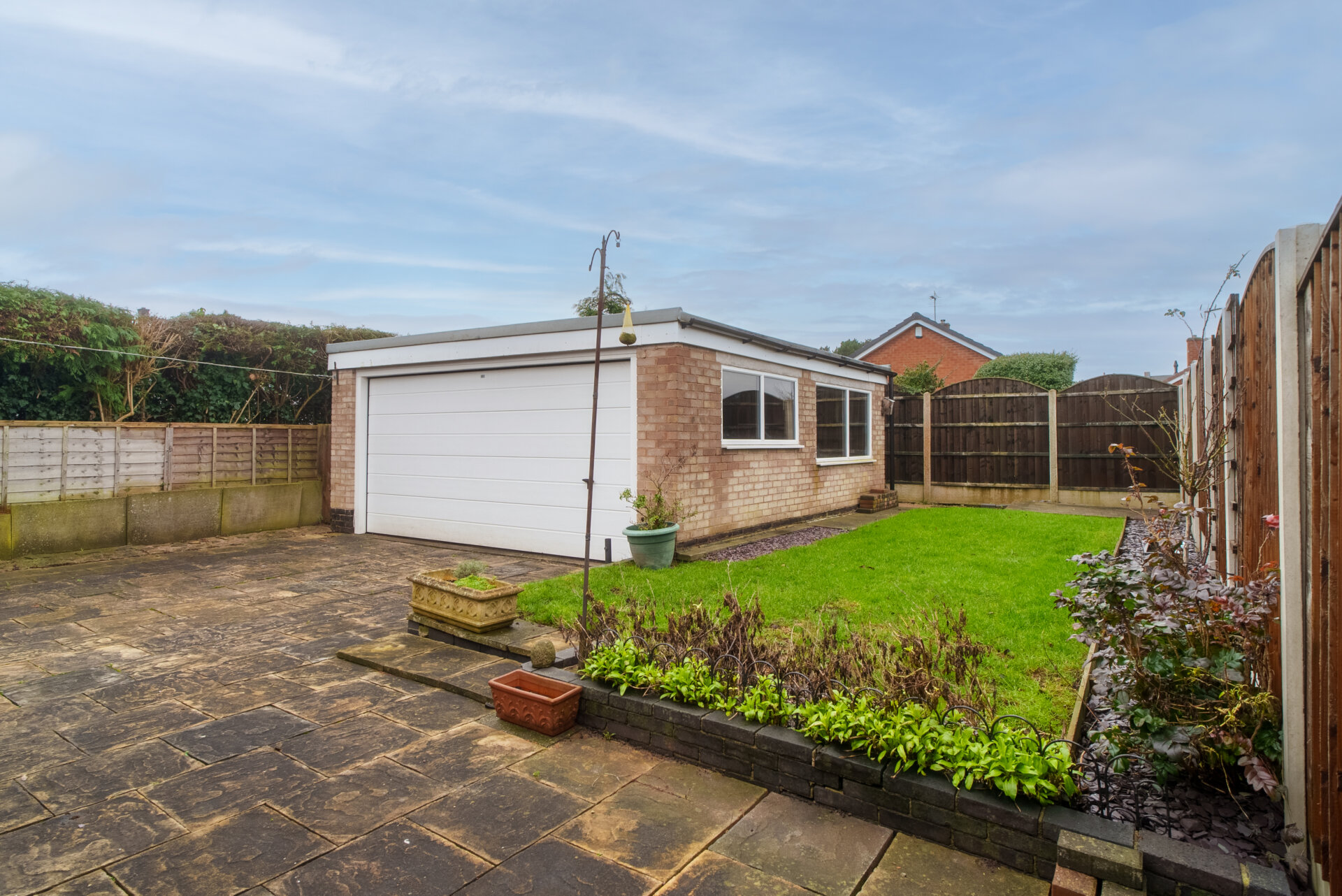 The outside space is thoughtfully designed for both practicality and ease of maintenance. To the front of the property, a block paved driveway provides ample off-road parking, complemented by a neatly kept lawn, established shrubs, and a pathway leading to the front door. At the side, a gated driveway continues along the side elevation, with a raised bed and an outside tap for added convenience. Another gate leads to the rear garden and the impressive double garage, which measures approximately 17ft by 18.8ft and includes three UPVC double glazed windows, a pit (ideal for car maintenance), and an electric up and over door. The rear garden is exceptionally private, landscaped with a large patio, a lawn bordered by grey slate chips, and a path leading to the bottom of the garden, where there is additional storage space behind the garage and a hard standing area suitable for seating or a shed. The garden is securely enclosed with fenced boundaries, providing a peaceful and secluded outdoor retreat.
