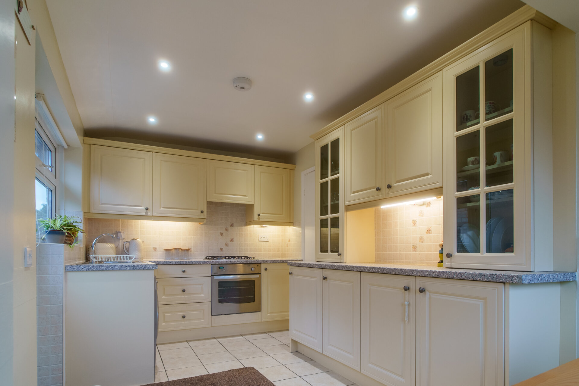 Wall, base and drawer units with work surface over, stainless steel sink and drainer unit with mixer tap over, tiled walls and splashbacks, built-in fridge, oven, gas hob and external extractor hood over, plumbing for automatic washing machine, under cupboard lighting, two glass door cupboards, UPVC double glazed window x2 and rear exit door, tiled floor and spotlights.
