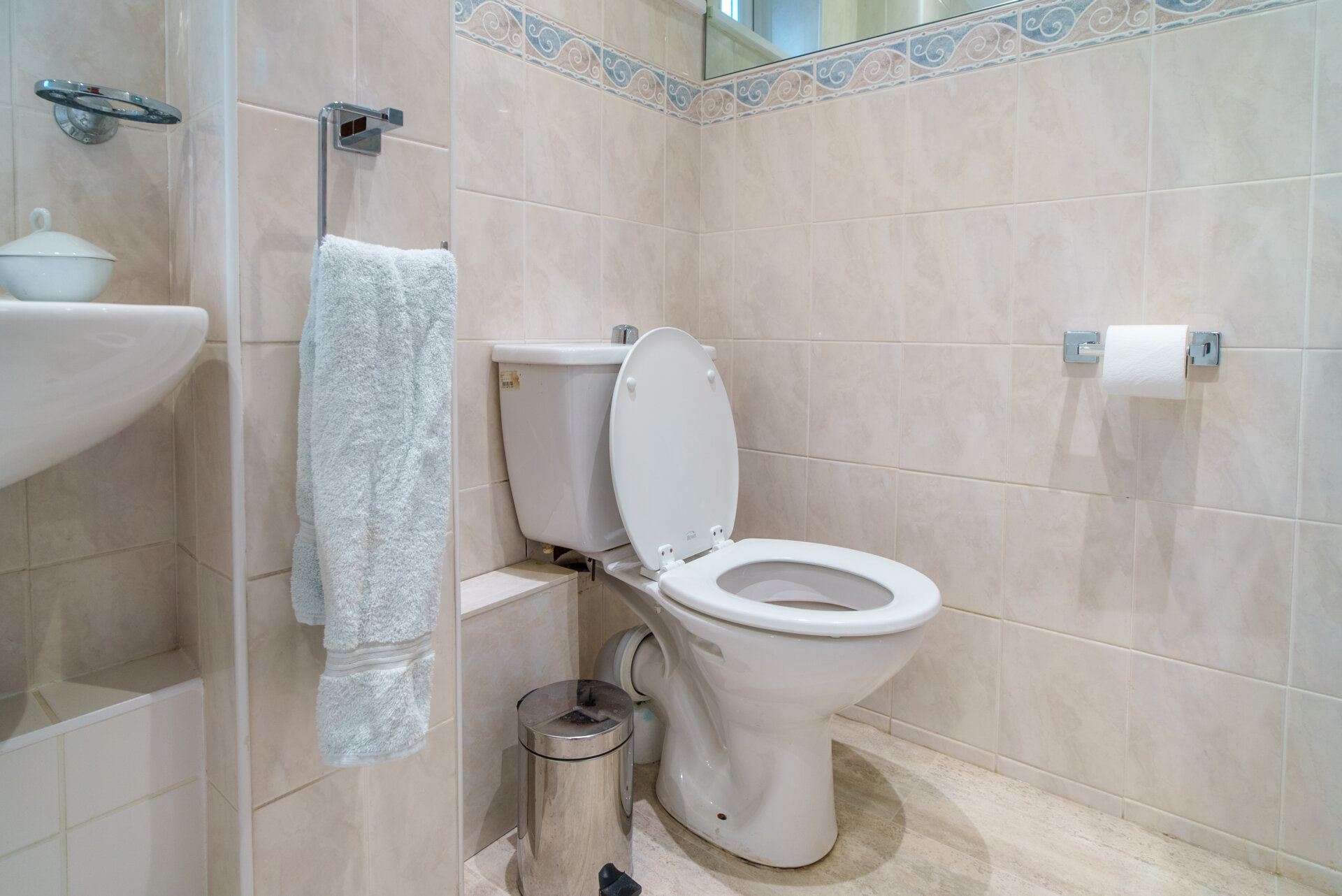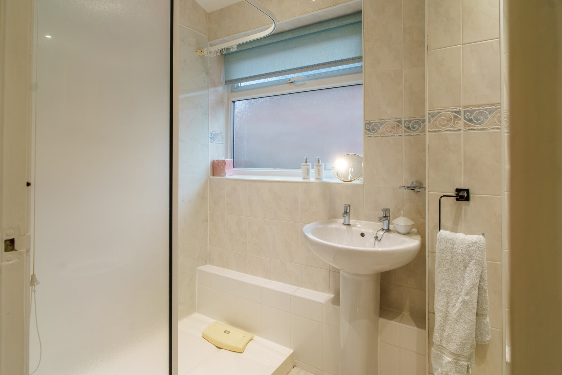 Walk-in shower with electric shower over having a waterfall shower head and a hand held shower head with splashbacks, pedestal wash hand basin, low flush w.c, tiled wall and splashbacks, spotlights, chrome heated towel rail, x2 UPVC double glazed windows.