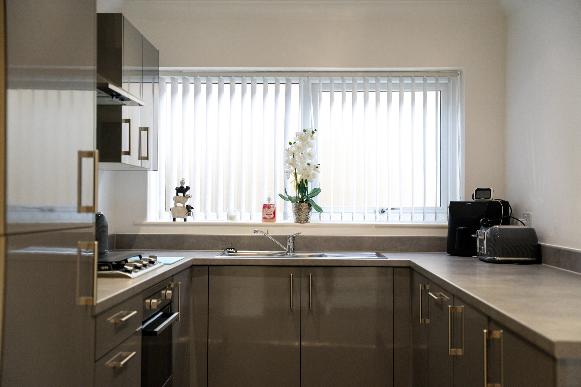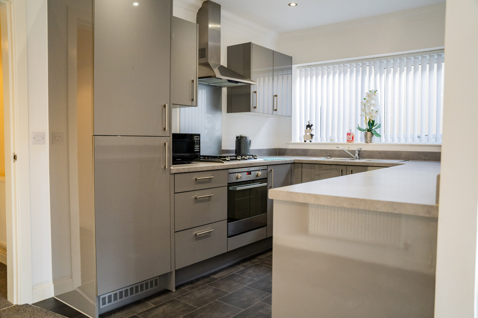 Matching Grey, wall and base units incorporating a laminate work surface over, 1½ bowl stainless steel sink with mixer tap over, integrated oven with four ring gas hob over and extractor hood above, glass splashback, integrated fridge/freezer, spotlights, coving to the ceiling, UPVC double glazed window, integrated dishwasher and washing machine, linoleum flooring, open through to the Lounge.