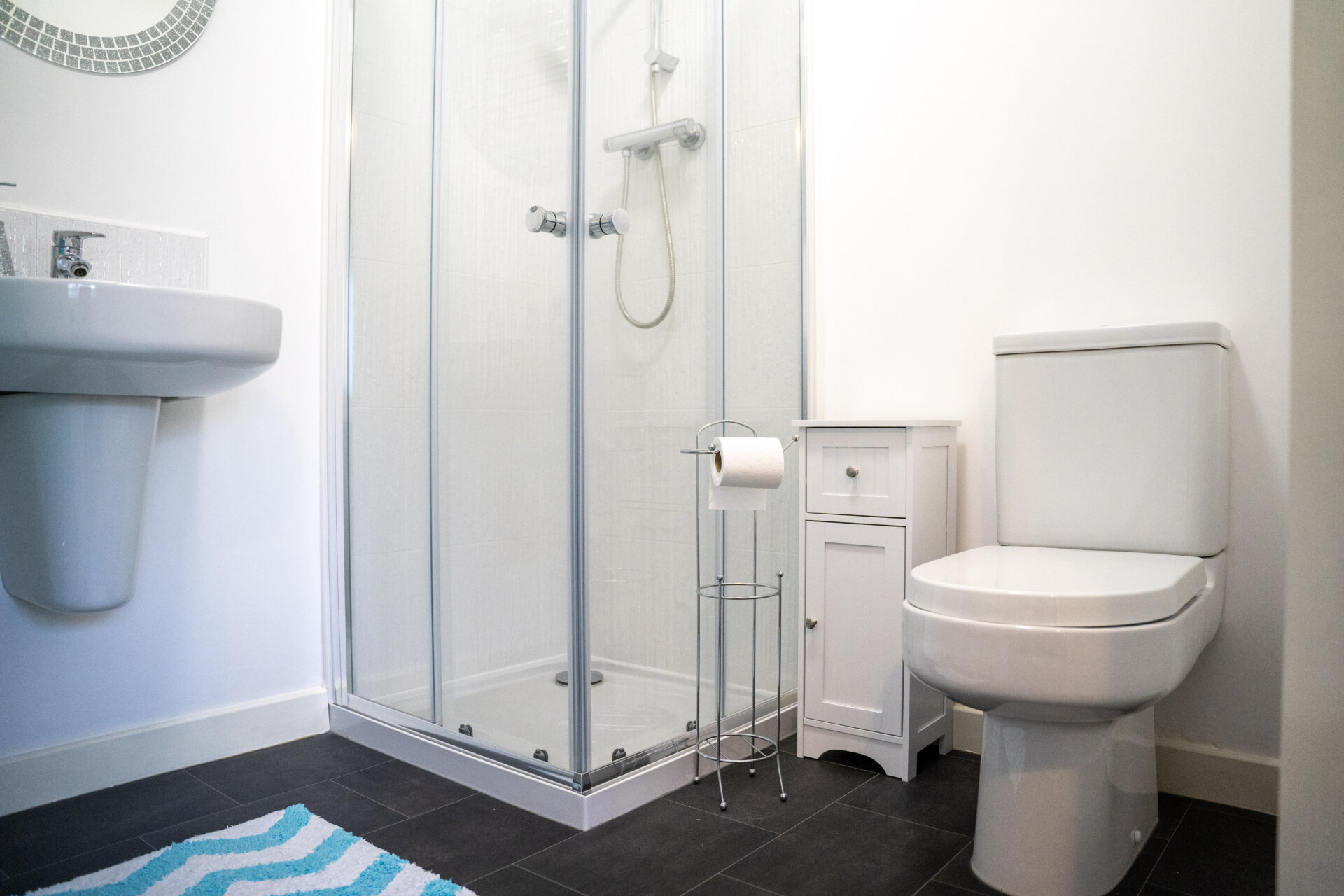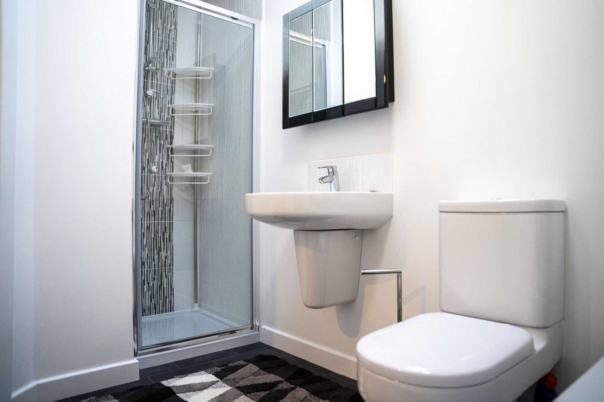 Walk-in shower cubicle with shower from the mains, sink, low flush w.c, tiled walls and splashbacks, chrome heated towel rail, extractor fan.