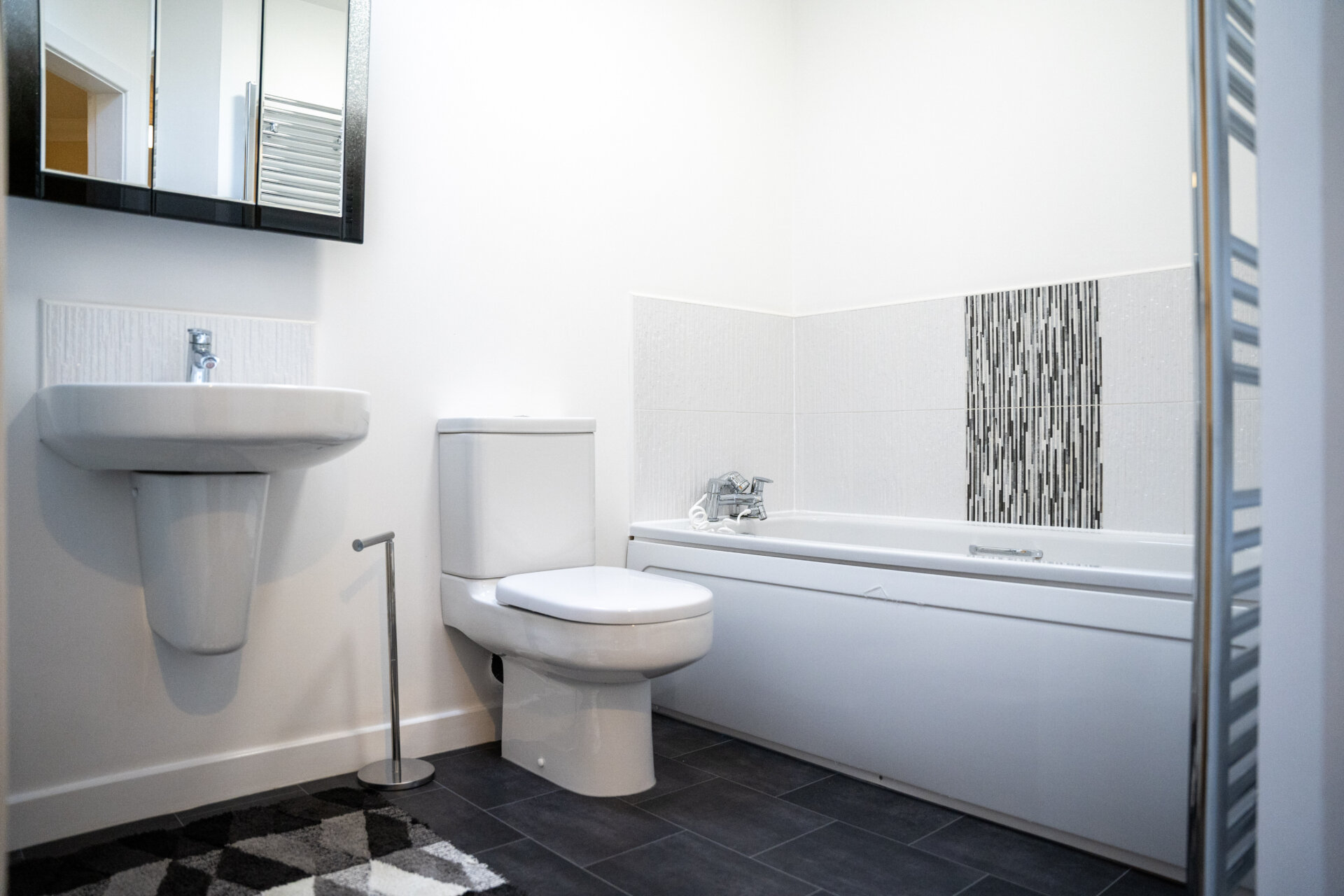 A four piece suite comprising a bath with a mixer shower attachment, walk-in shower cubicle with shower from the mains, low flush w.c, sink, tiled walls and splash backs, extractor fan, chrome heated towel rail, vellum window.