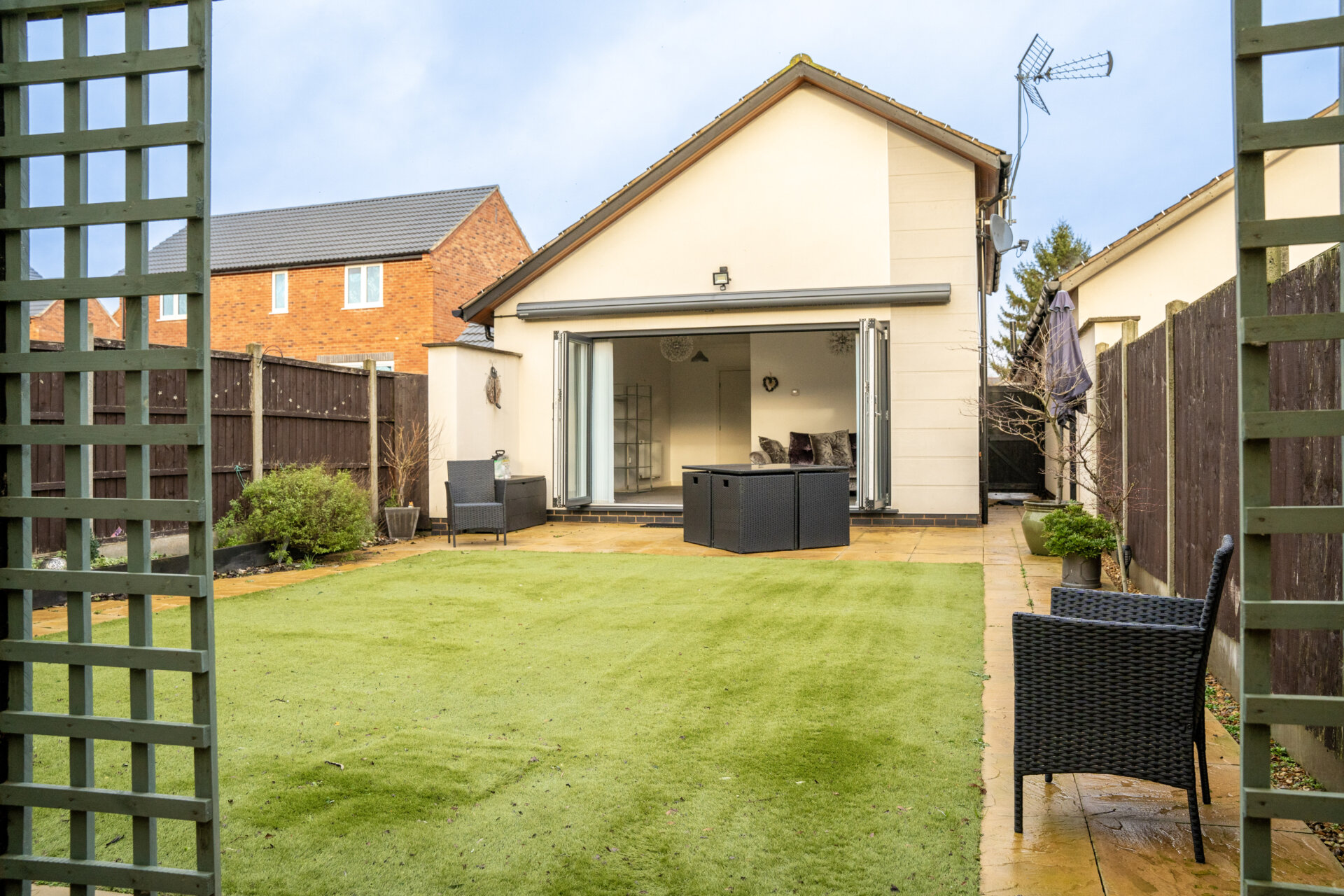 This beautiful two-bedroom detached bungalow is a modern gem which offers an exceptional living experience. Boasting a mere seven years of age, the property exudes a fresh and contemporary charm, showcasing immaculate interiors. The master bedroom features an en-suite, complemented by a luxurious four-piece family bathroom, ensuring convenience and comfort for all occupants. The open-plan living area seamlessly connects to the landscape-designed rear garden, creating a harmonious blend of indoor-outdoor living. With bi-folding doors that invite natural light and the outdoors in, this space offers a tranquil retreat ideal for relaxation and entertainment. Presenting a low-maintenance, south-facing garden, with an electric canopy above the bi-folding doors for sun and general weather protection. This bungalow is a rare find with no upward chain, offering endless possibilities to make it your own.