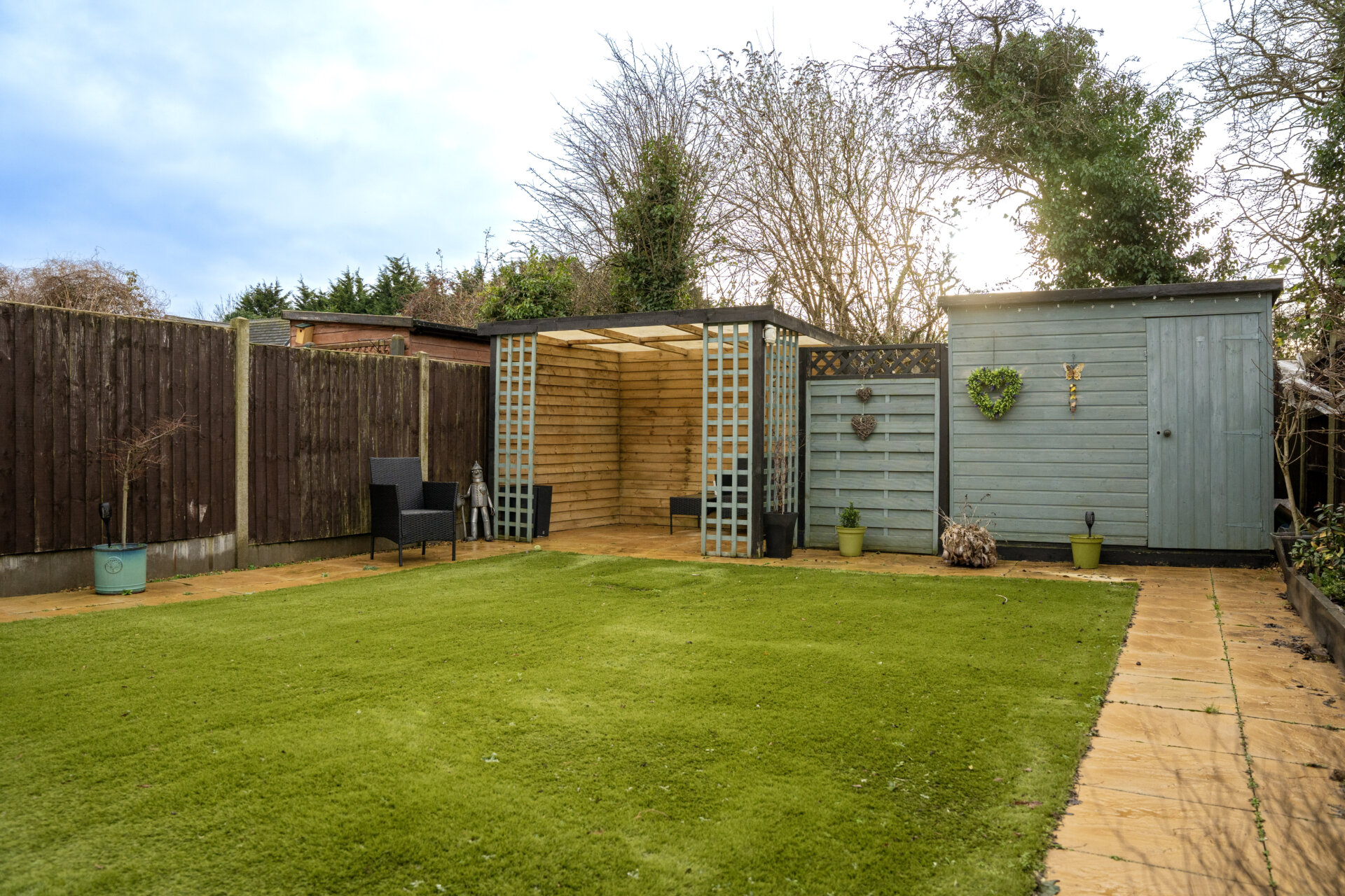 There is parking to the front and a south-facing rear garden revealing a delightful patio that transitions to a serene astro turf setting, complete with raised beds and a charming seating area nestled at the garden's end, featuring a pergola for added allure. In summation, this bungalow's outdoor space is a testament to thoughtful design and meticulous care, ensuring a lifestyle of comfort, convenience, and serenity for the discerning homeowner.