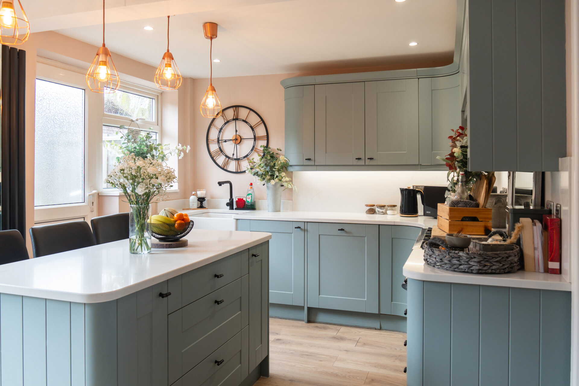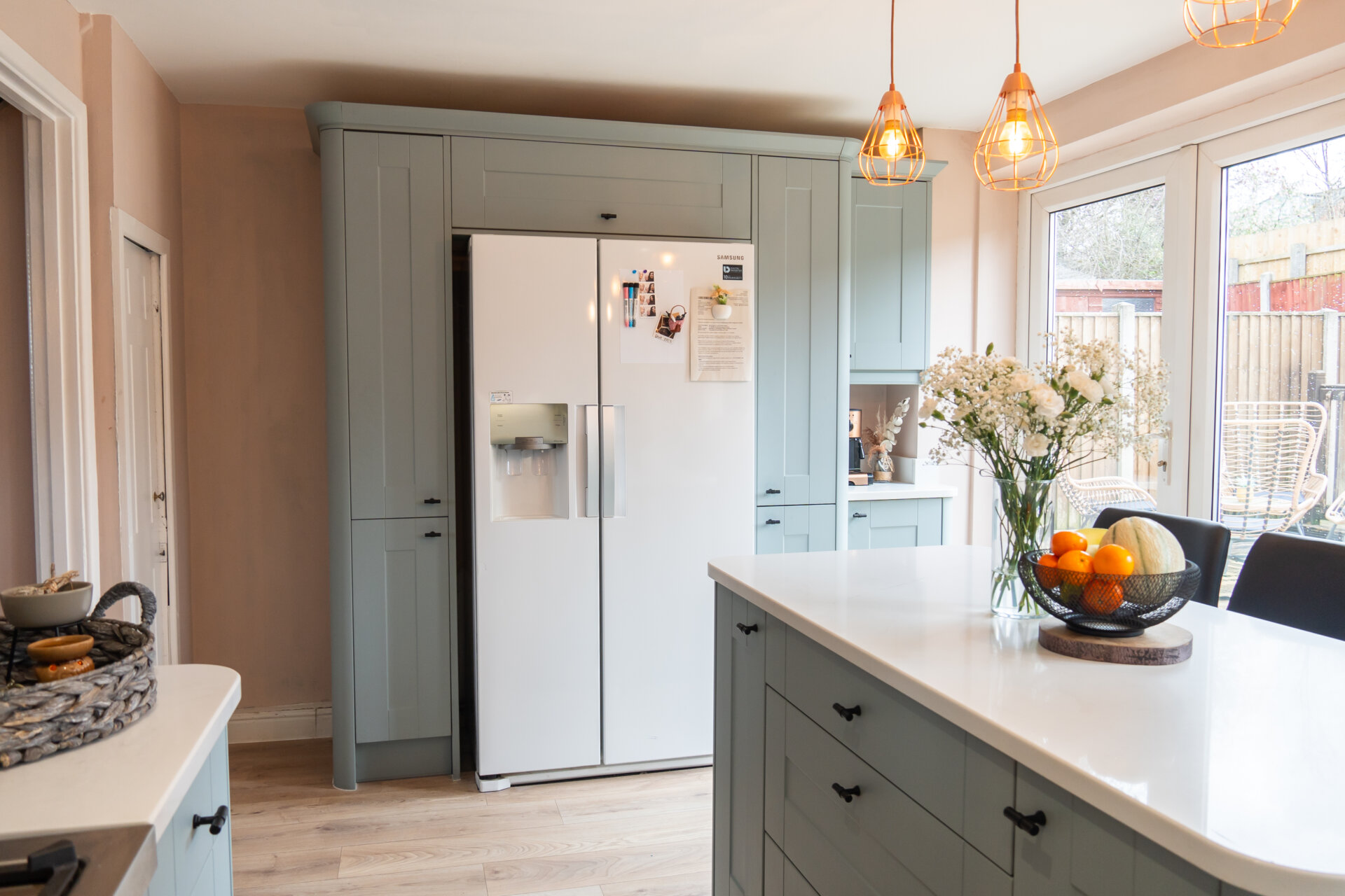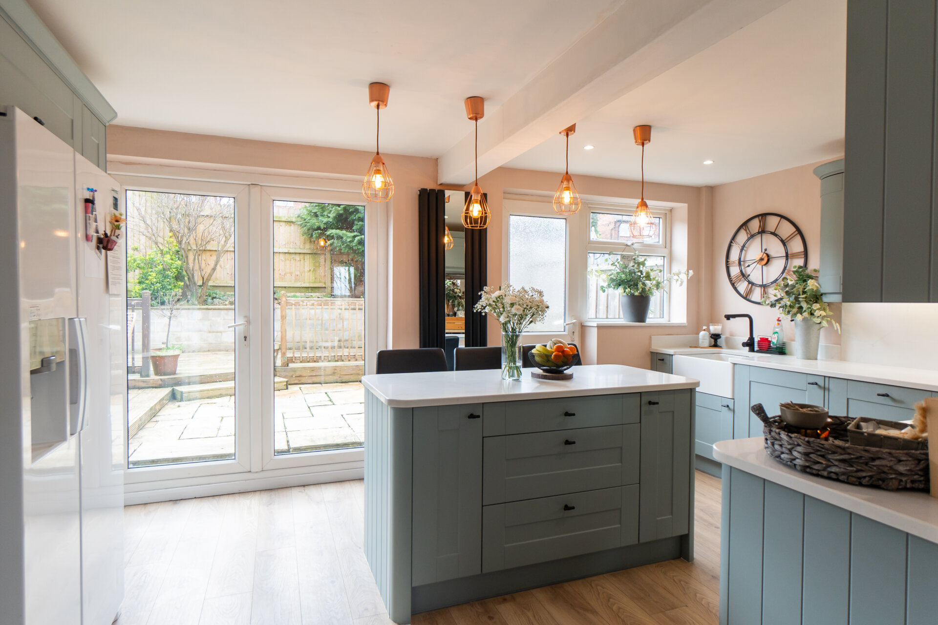 Simply stunning, this refitted modern kitchen is a dream. Wall and base units with marble effect worktops, belfast sink with mixer taps over, oven with 6 ring gas burners, integrated washing machine and dishwasher, space for american fridge freezer with fitted units and pantry draws surrounding, island with matching base units with marble effect worktops, breakfast bar, vertical modern radiator, double glazed door and window to the rear, continued wood effect laminate flooring, understairs storage cupboard housing the electric metre and double glazed patio doors to the rear.