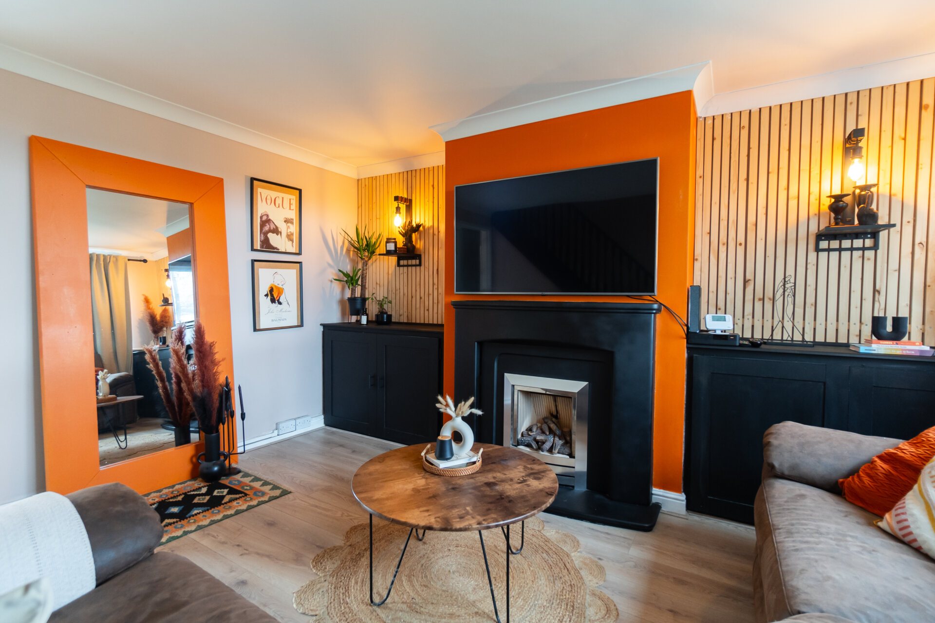 A bright and spacious lounge with gorgeous interior design, double glazed door to enter, wood effect laminate flooring, chimney breast with inset gas effect fire with surround and recess alcove to either side, built in storage cupboard to both sides, radiator, stairs ascending to first floor and open arch to