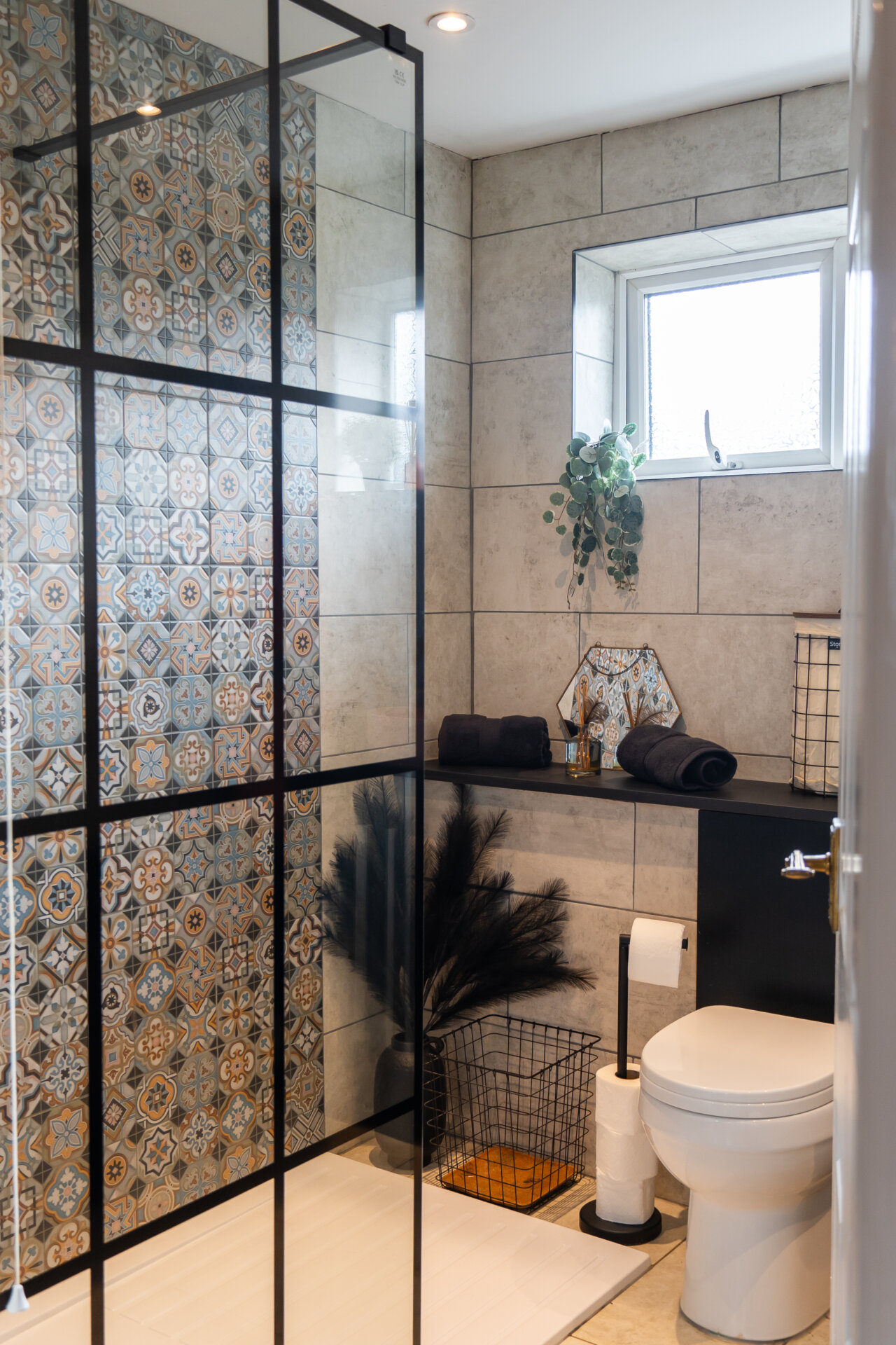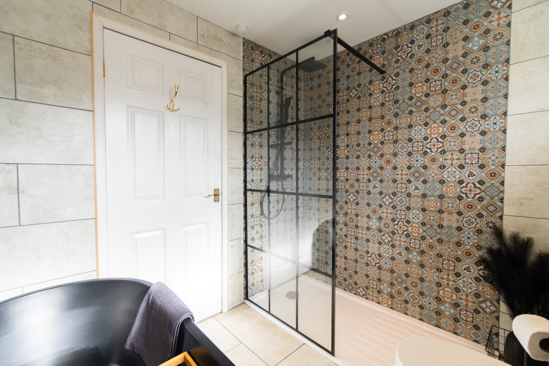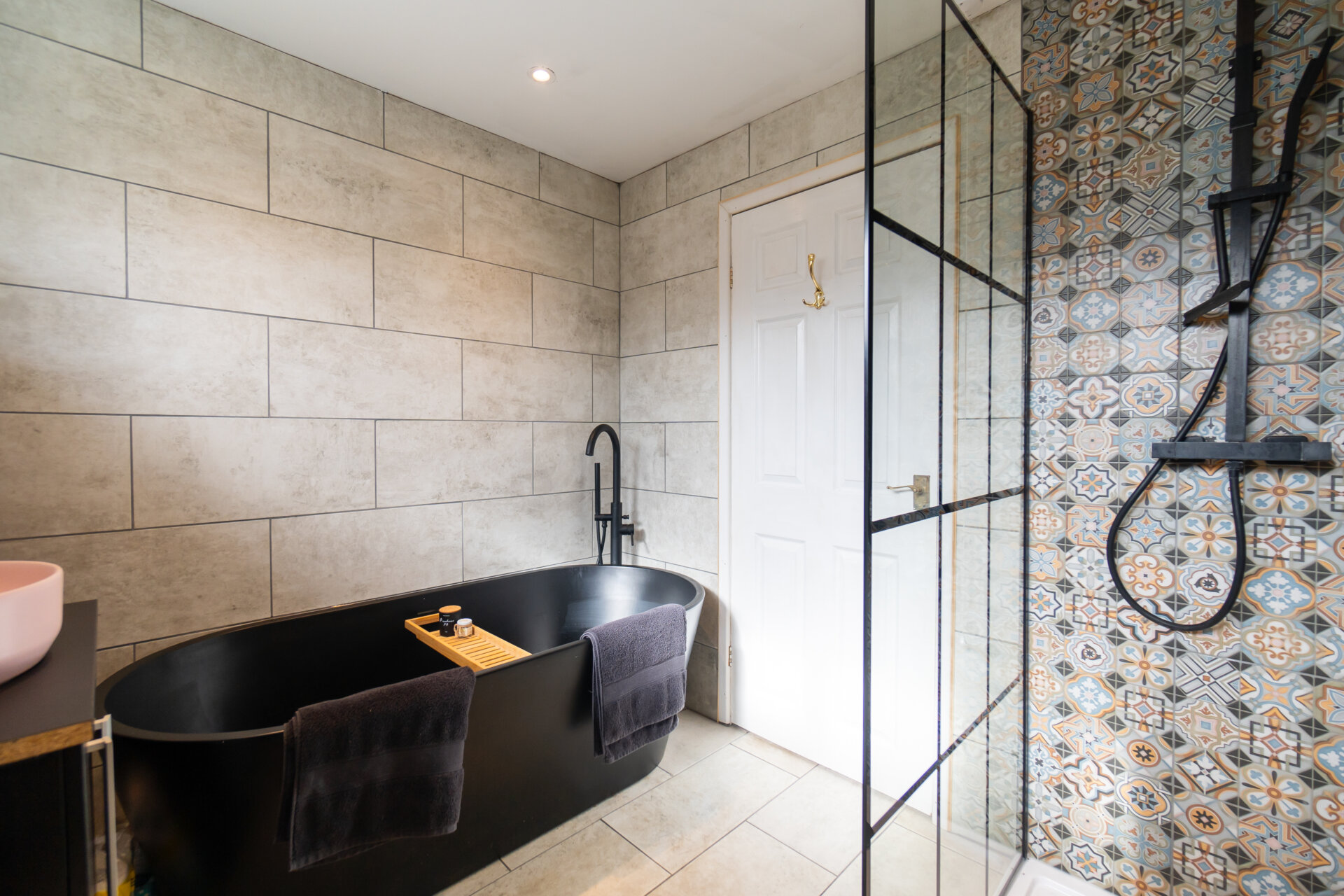 A beautiful refitted four piece bathroom suite comprising walk in shower with mosaic tiled walls, waterfall shower with mixer, vanity unit with low flush w.c and mounted wash hand basin, freestanding bath with mixer shower over, tiled walls and flooring, radiator and opaque double glazed windows to the rear.