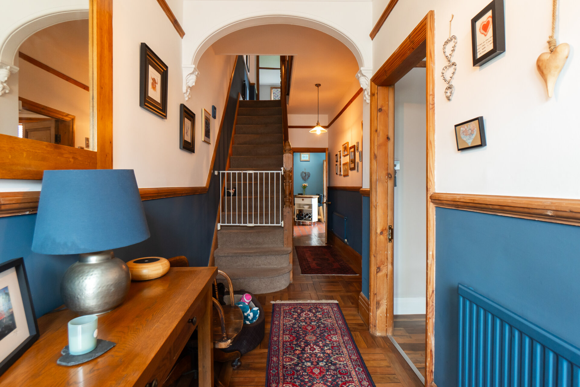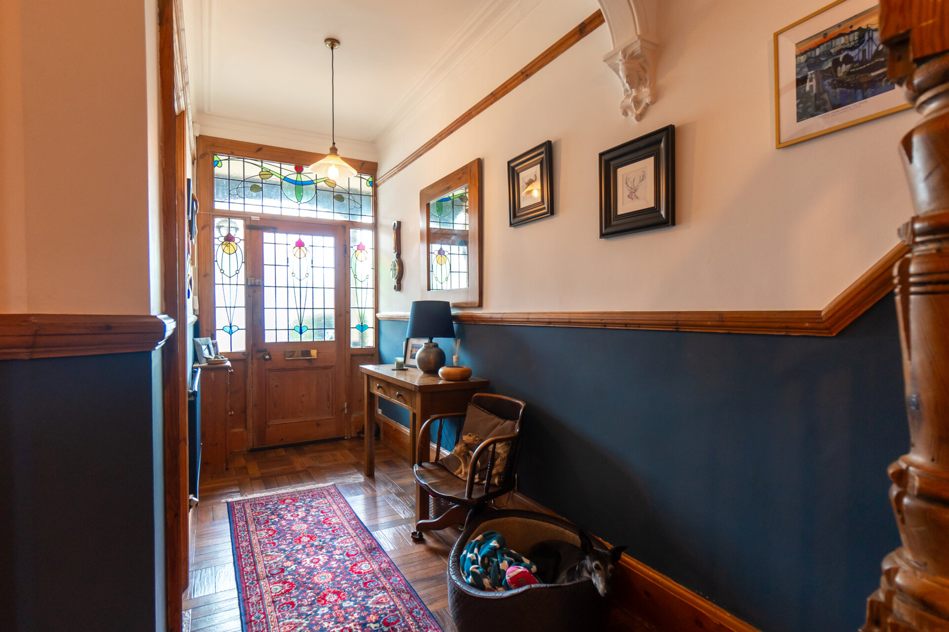 Original front entrance door and stained glass windows, dado rail, picture rail, radiator x2, Karndean floor, door to a large understairs storage cupboard, stairs to the first floor landing with original woodwork and spindle bannister and doors to