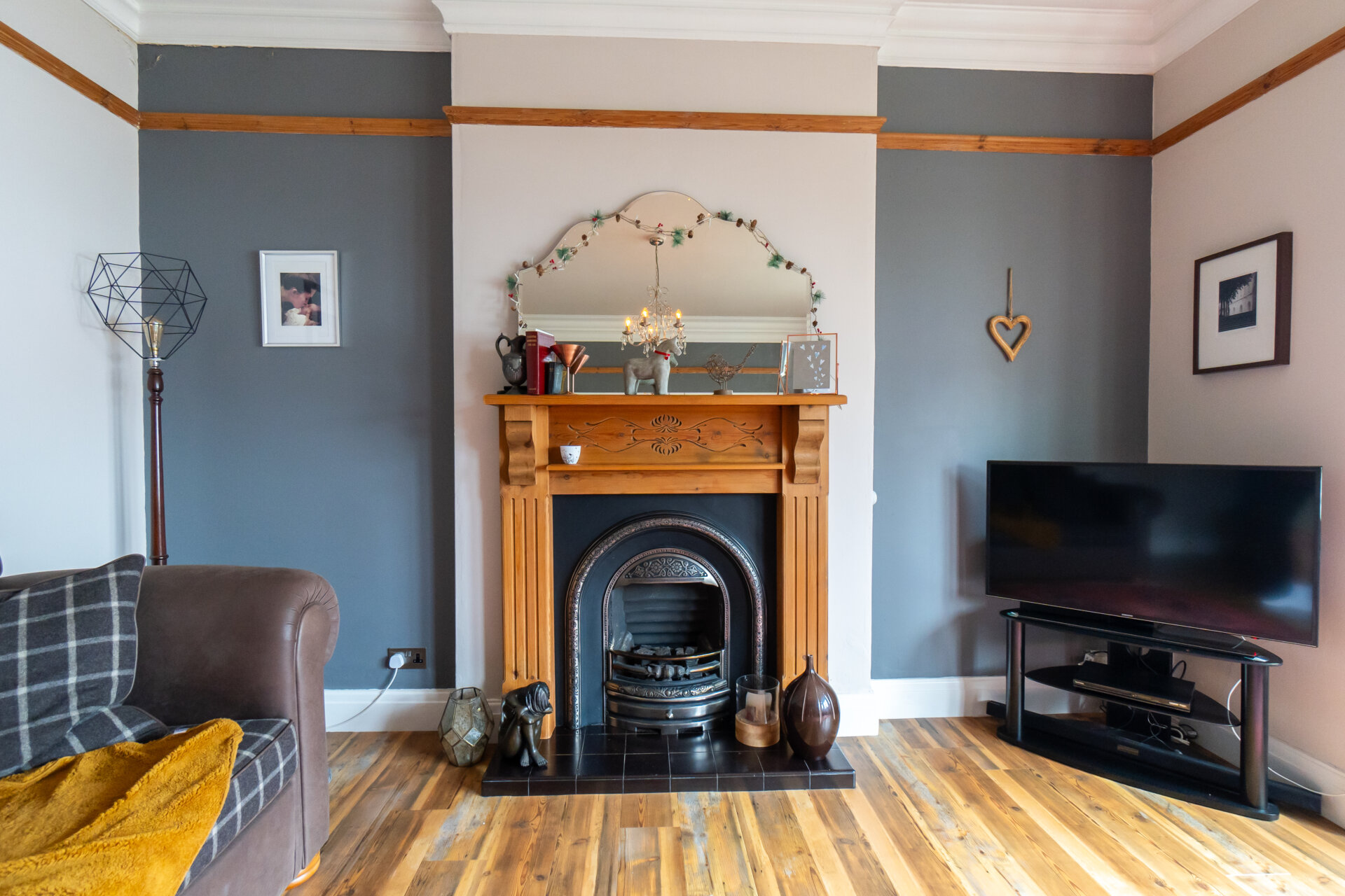 Bay window with secondary double glazing to the front, gas fire with 'Adam' style surround, TV & telephone point, picture rail, Karndean floor, and coving to the ceiling.