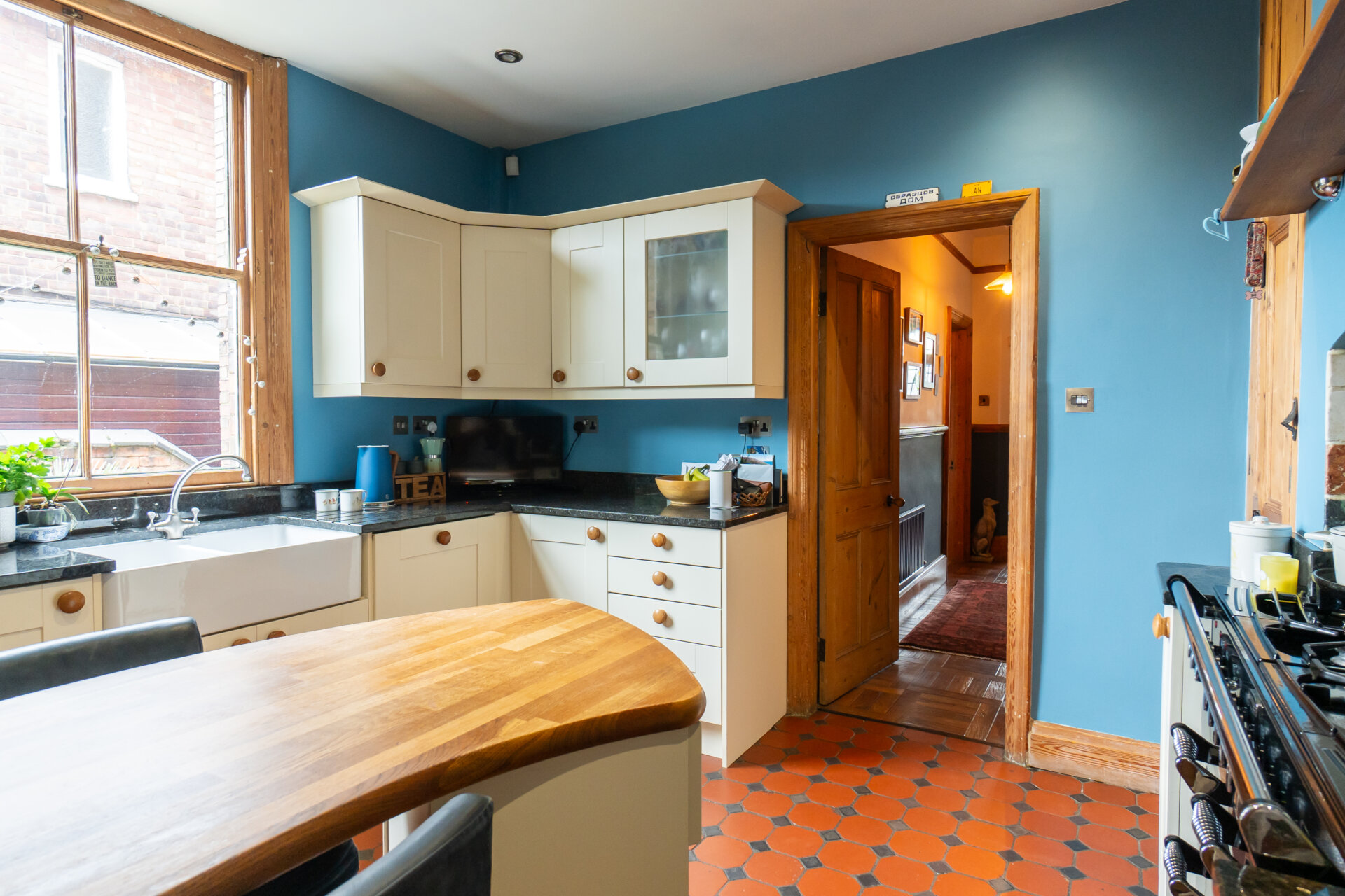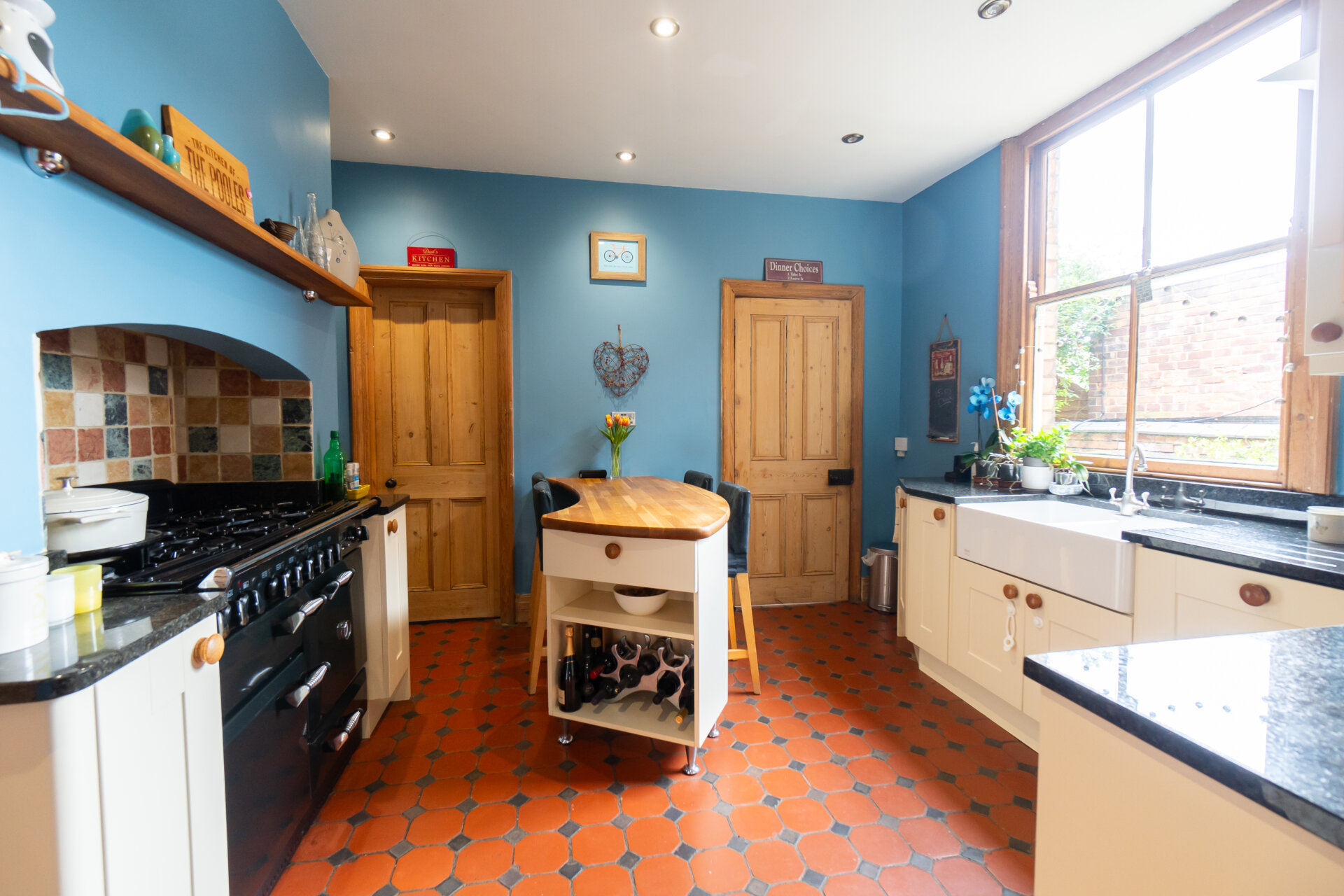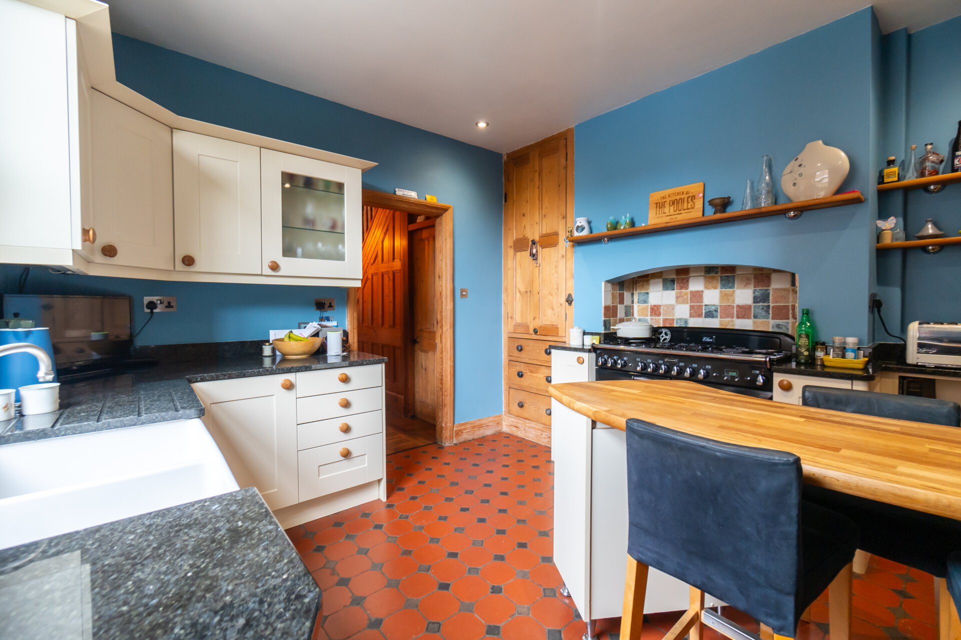 wall, base and drawer units with Granite worktops and splashbacks, Belfast double sink with swan mixer tap over, original Quarry Tile floor, space for a range cooker, door to a large pantry, sash single glazed window, spotlights, Oak breakfast bar and door to