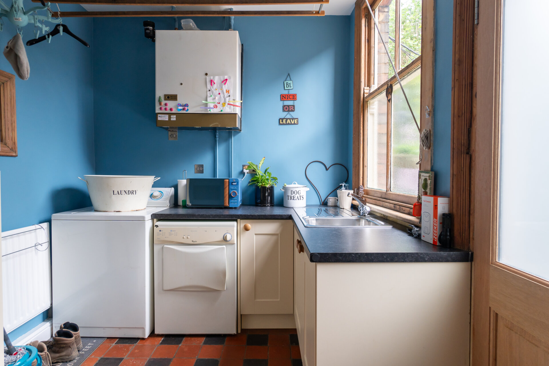 Wall and base units with work surface over, plumbing for automatic washing machine, appliance space, stainless steel sink and drainer unit with mixer tap over, radiator, quarry tile floor, gas central heating boiler, single glazed sash window and rear exit door.