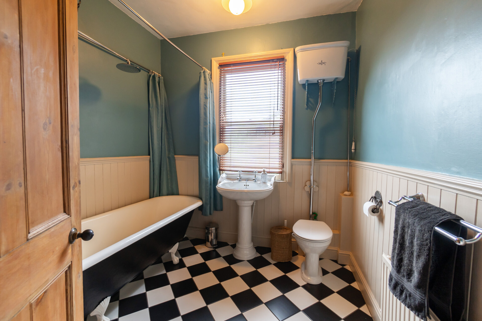 Free standing bath, pedestal wash hand basin, high flush w.c, tiled walls and splashbacks, storage cupboard radiator, tiled floor, single glazed window