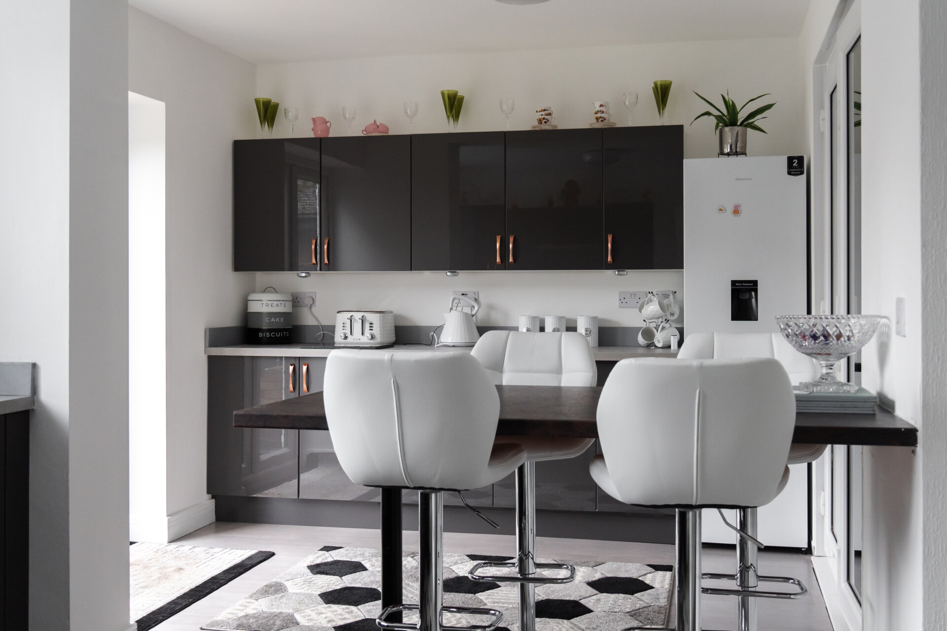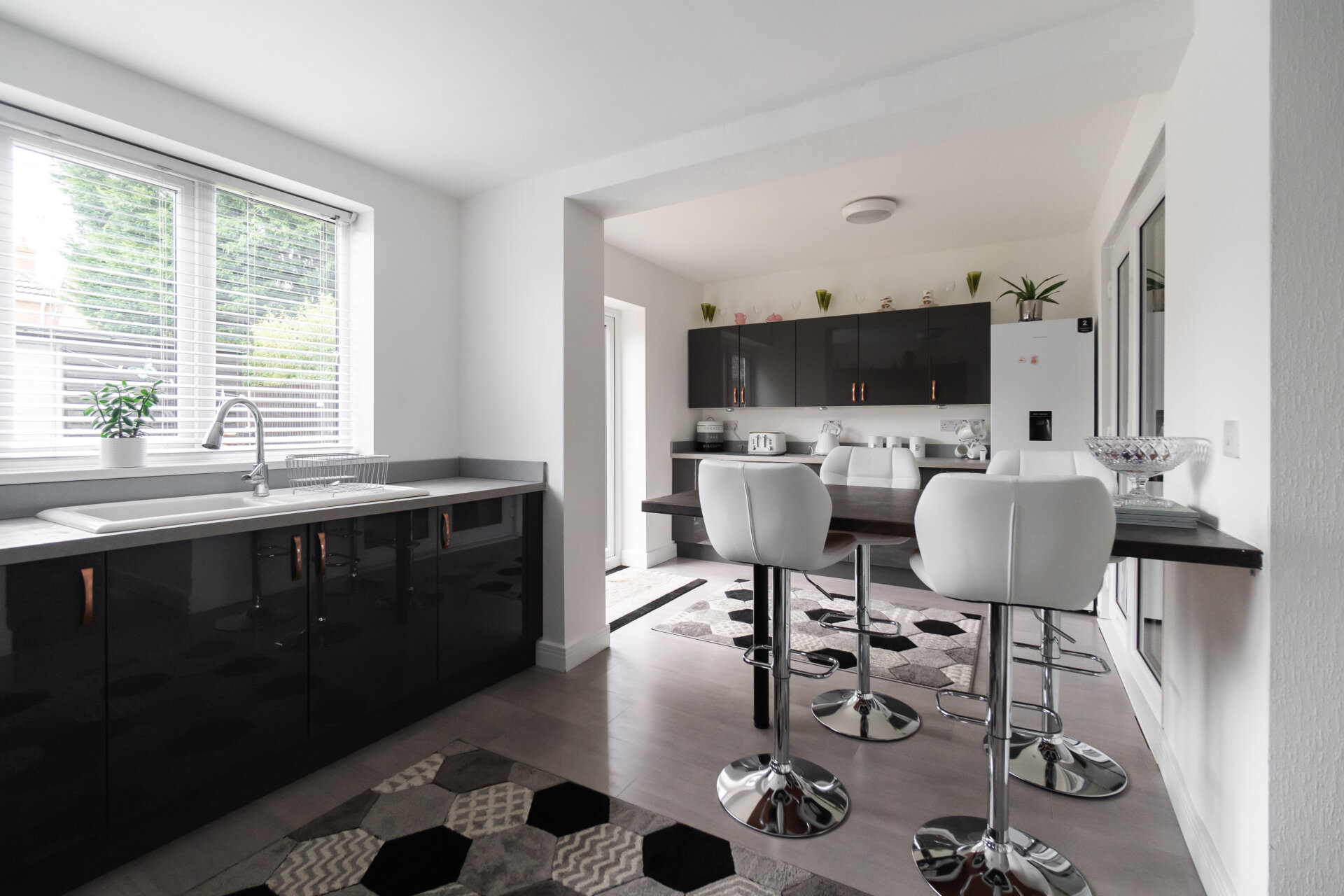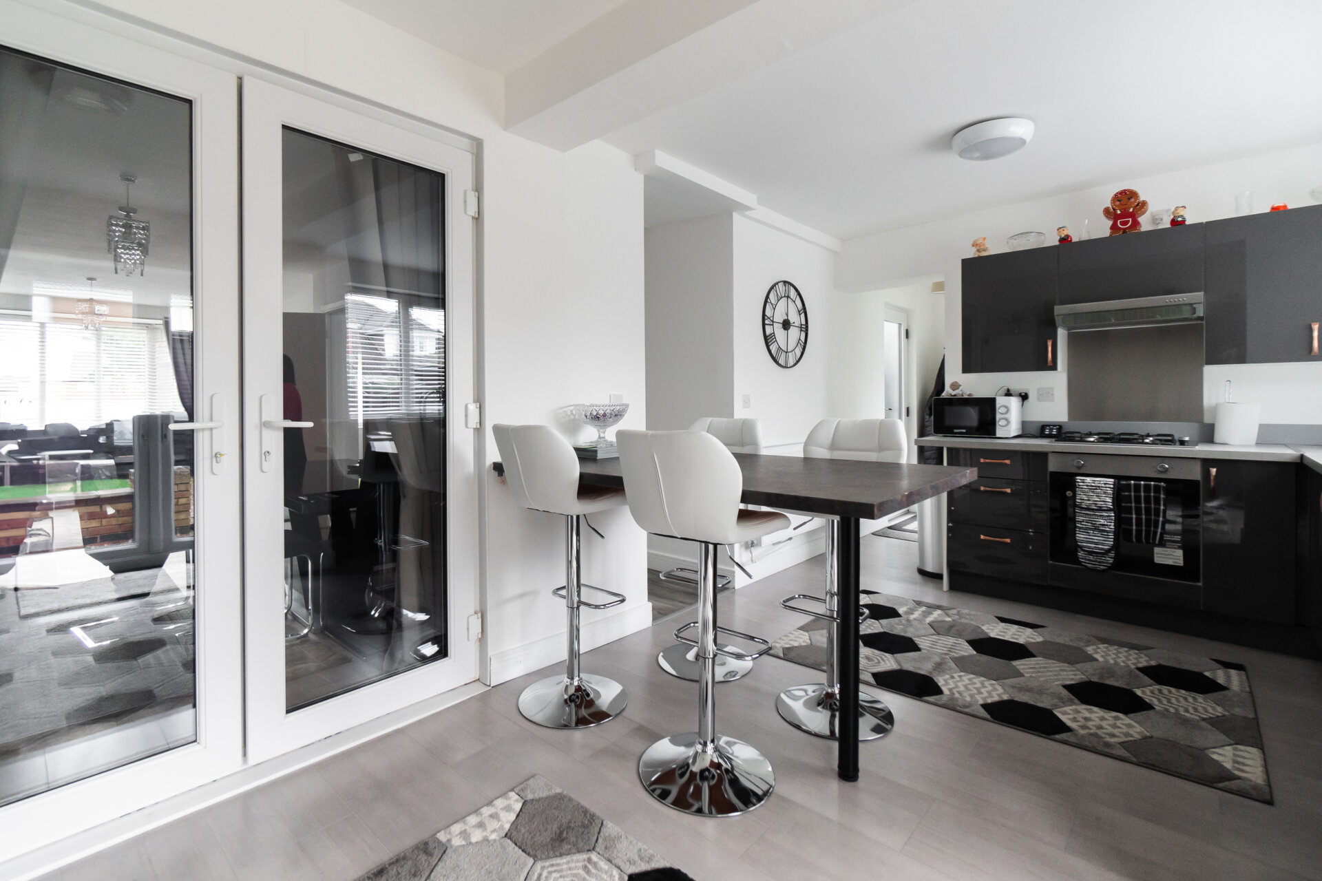 Newley fitted grey high gloss, wall, base and drawer units with work surface over, ceramic sink and drainer with mixer tap over, breakfast bar, splashbacks, built-in oven, gas hob and extractor hood over, appliance space, UPVC double glazed windows and patio doors to the rear and open to